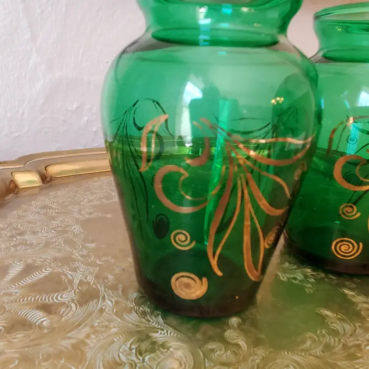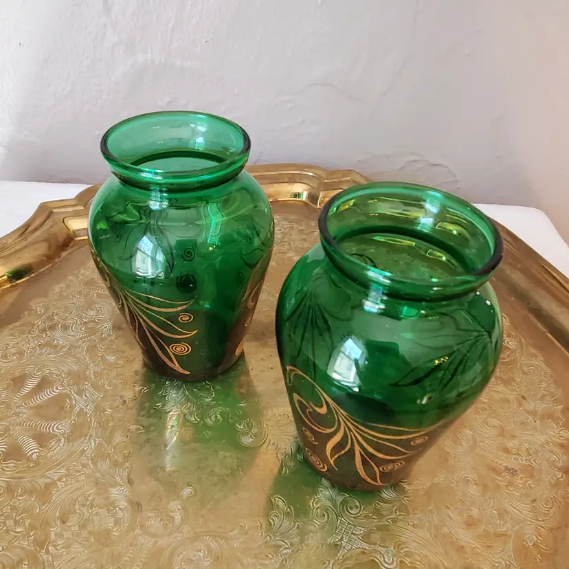 A sweet little set of two green glass bud vases with gold accents. In good condition with no chips and some wear of the gold on one vase. 4" tall.