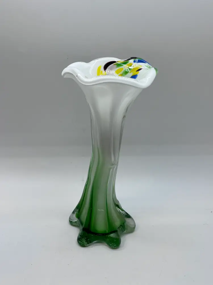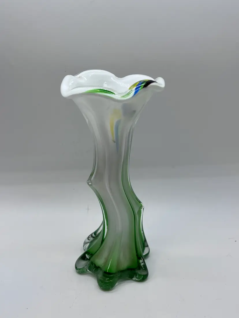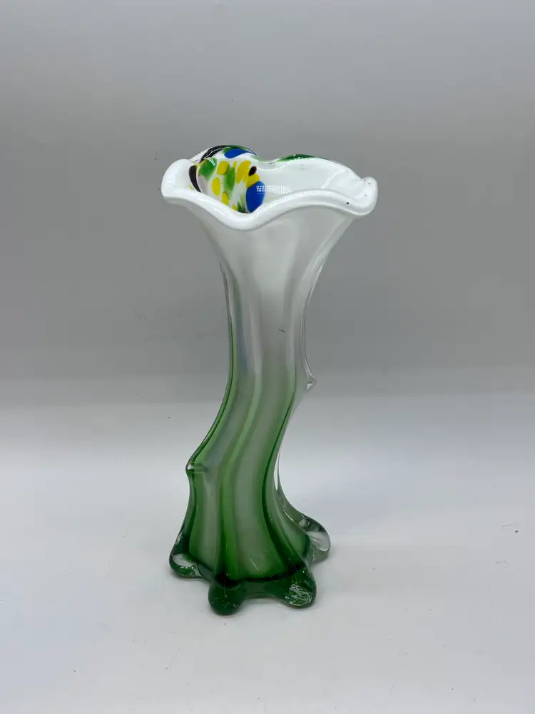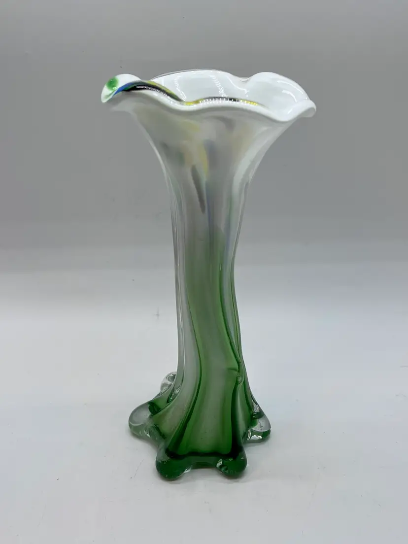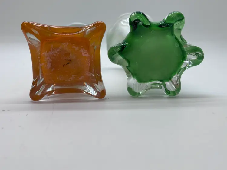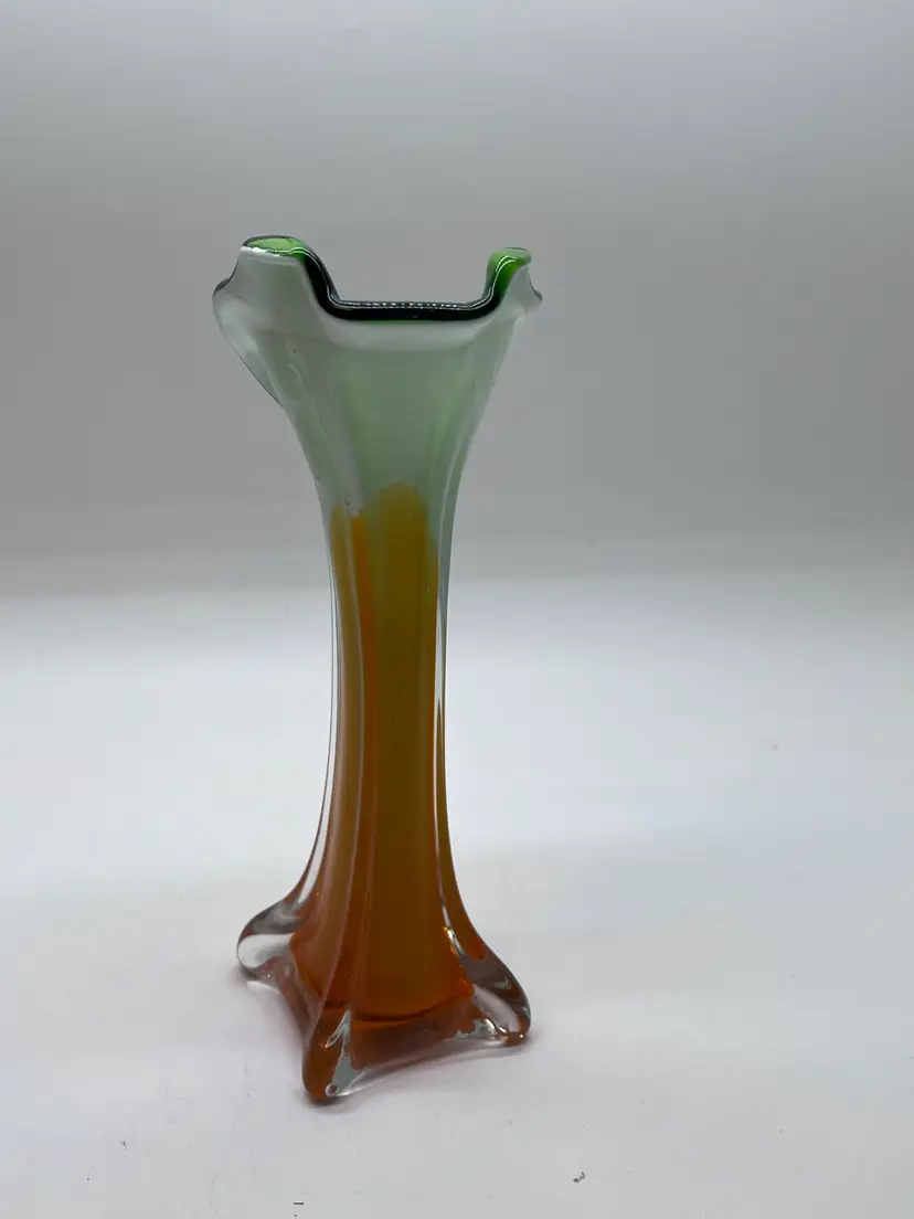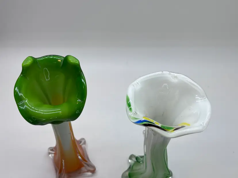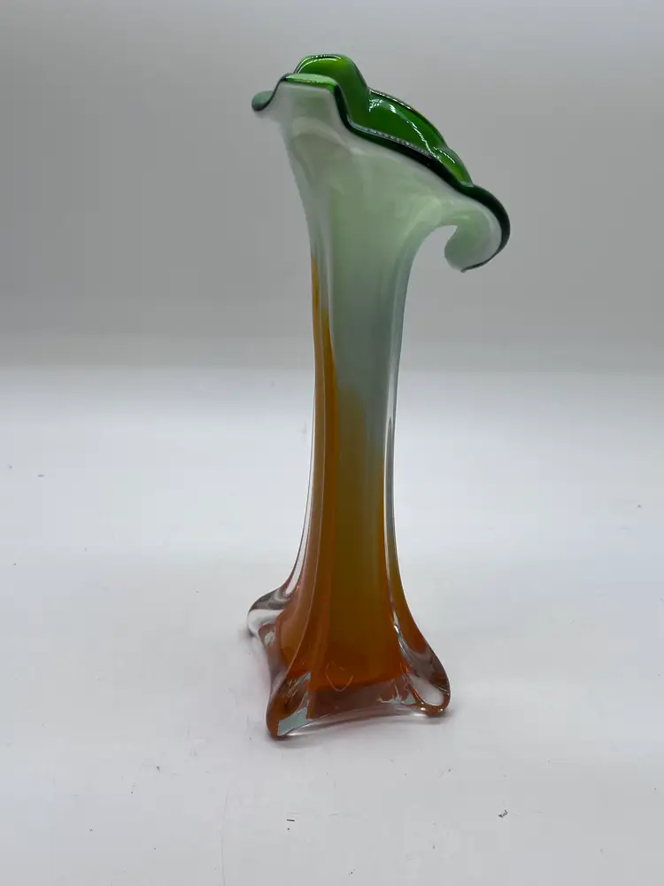 The orange/green vase measures 8” high and 3.25” square base. The green/white vase measures 7.75” high and 3.25” wide irregular shape base. Though unmarked the origiPairn is likely Eastern Europe or northern Italy. These will be packaged safely and shipped from a smoke free pet free home.