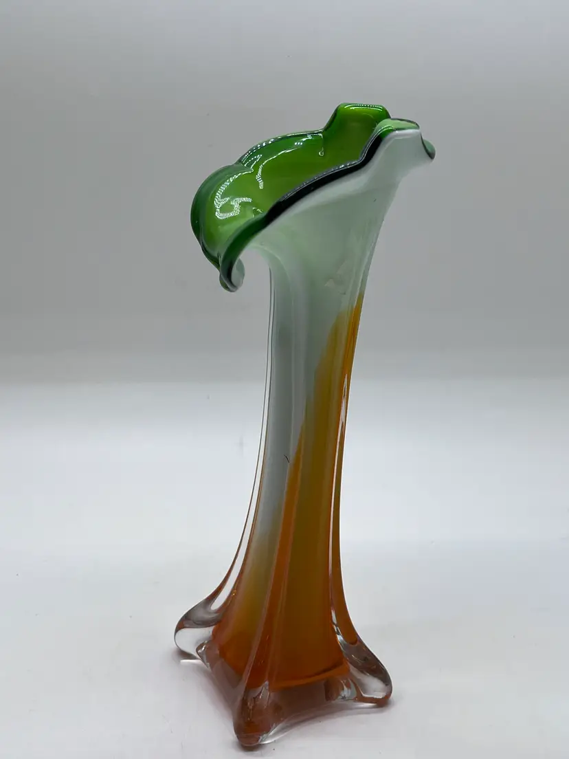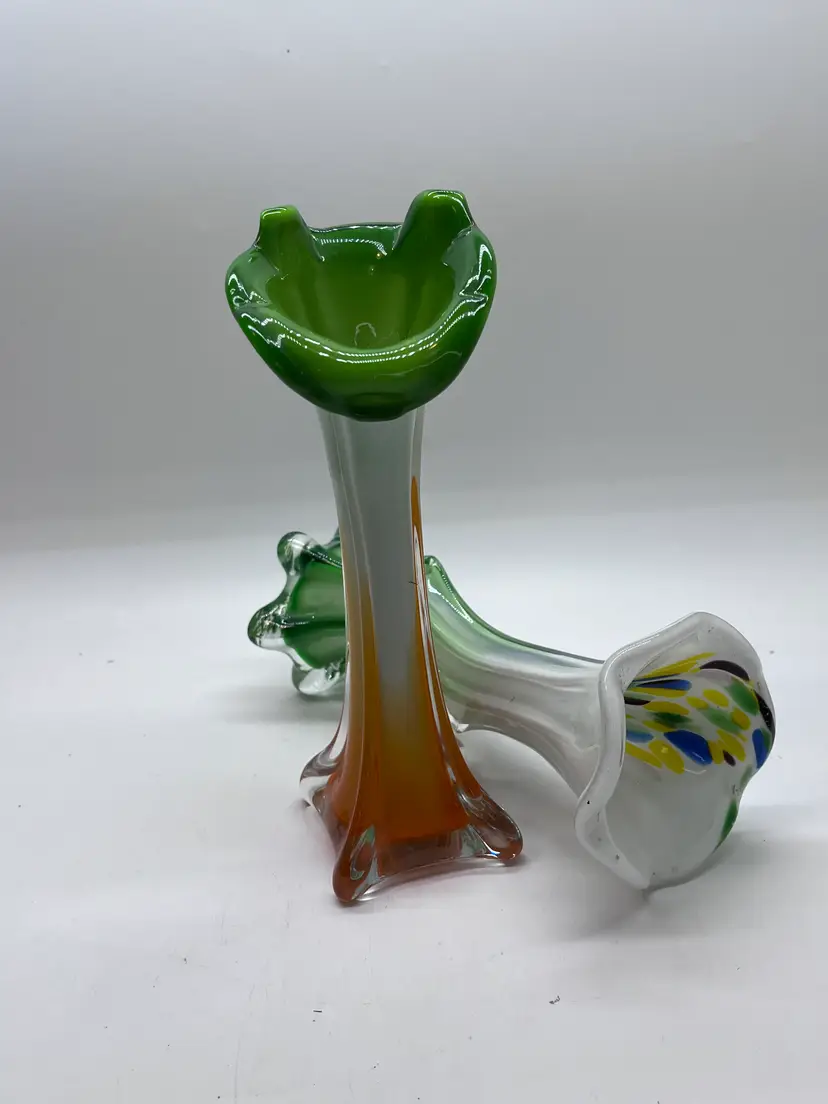 Set of blown glass studio art vases that feature ruffled irregular shaped bases and stems rising to unique openings. The orange/green vase references the flower Jack In The Pulpit, while the green/white vase with multicoloured splashes of colour inside the mouth and the organic flow of a tree trunk.