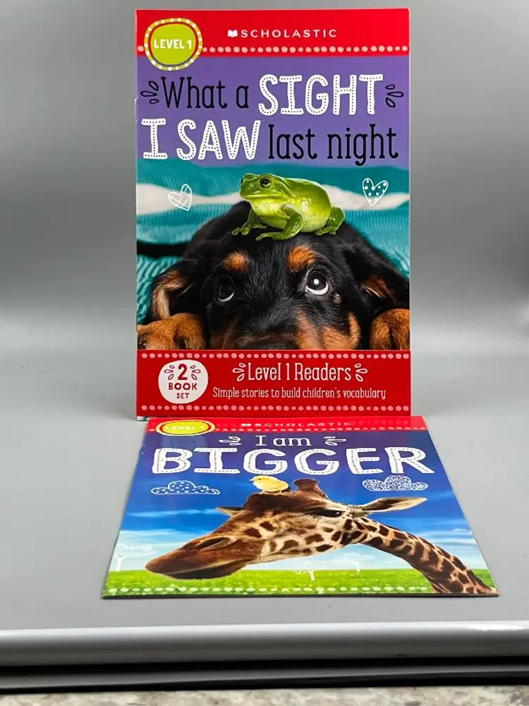 Hello, what we have is a set of 2 Books by: Scholastic Readers. Level-1. Title 1: What a Sight I Saw Last Night. Title 2: I'm Bigger.