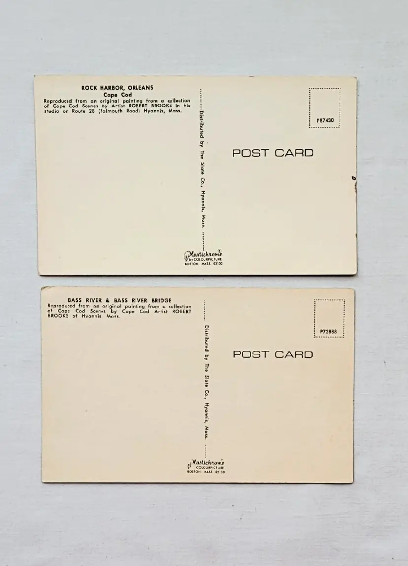 The postcards picture Rock Harbor, Orleans and Bass River & Bass River Bridge, both published by The Sian Co. (Hyannis) and printed as Plastichrome cards by Colourpicture of Boston. Both cards are unused and in excellent condition, with only slight age browning on the address side. Colors remain bright and the artwork is crisp.