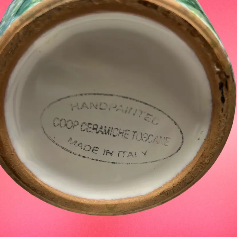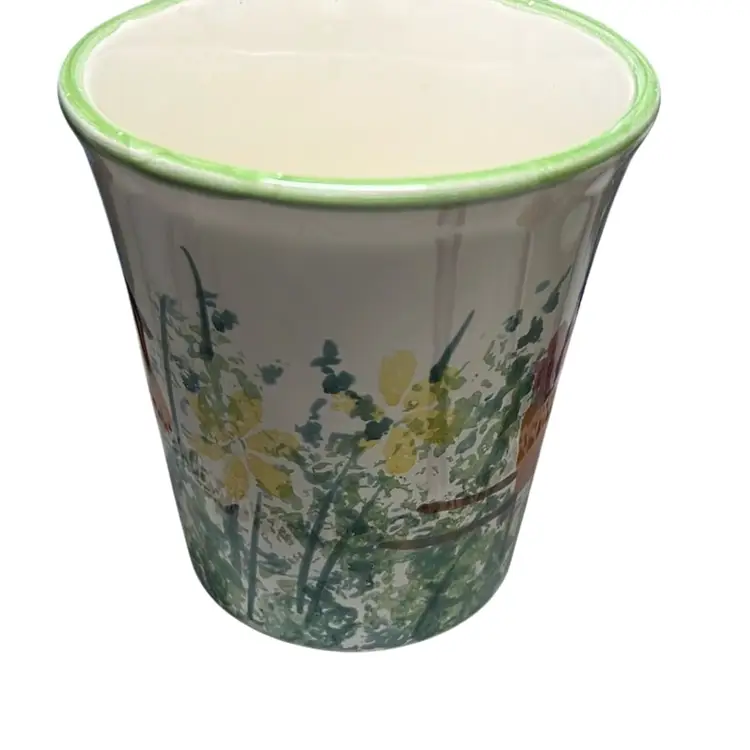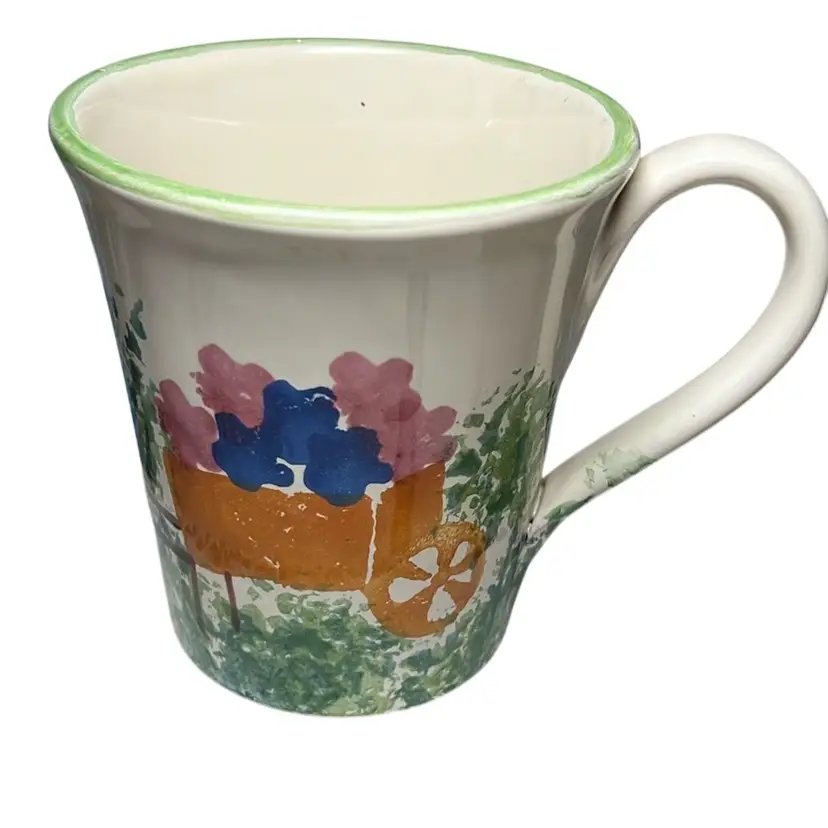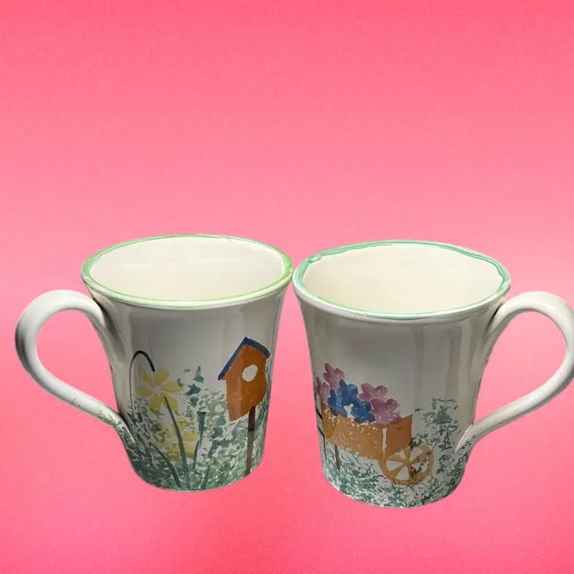 Each cup features a birdhouse, florals and a wheel barrel full of flowers. Due to each cup being hand painted there is always slight variations. No damage and measures 4.5” tall and top opening is 4” wide