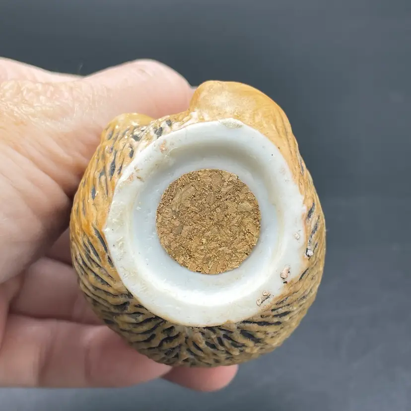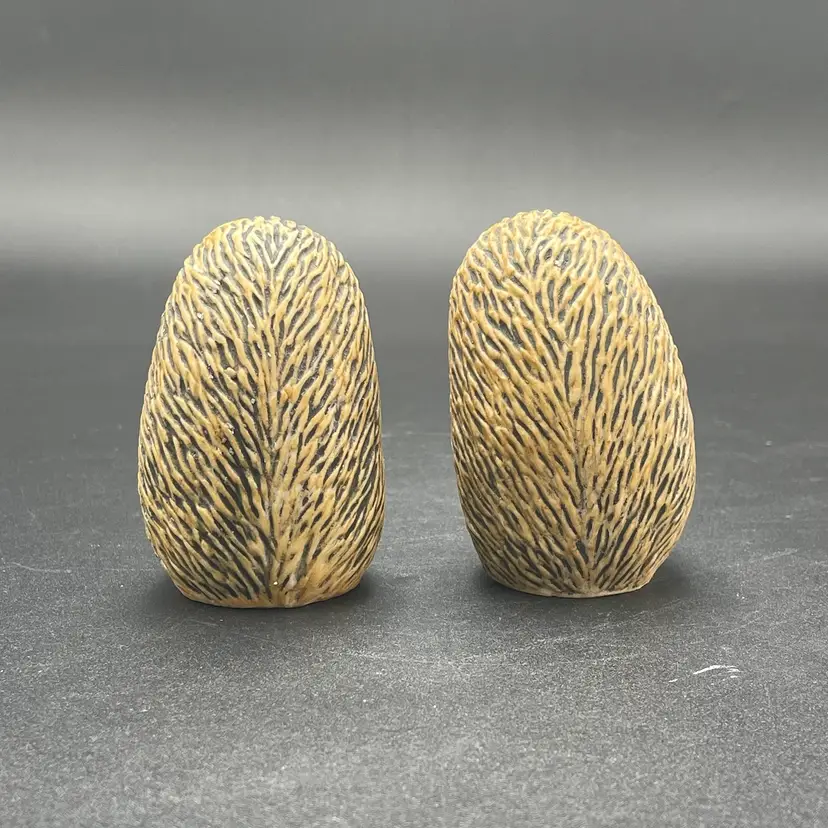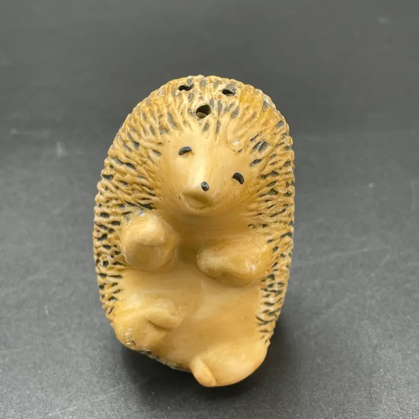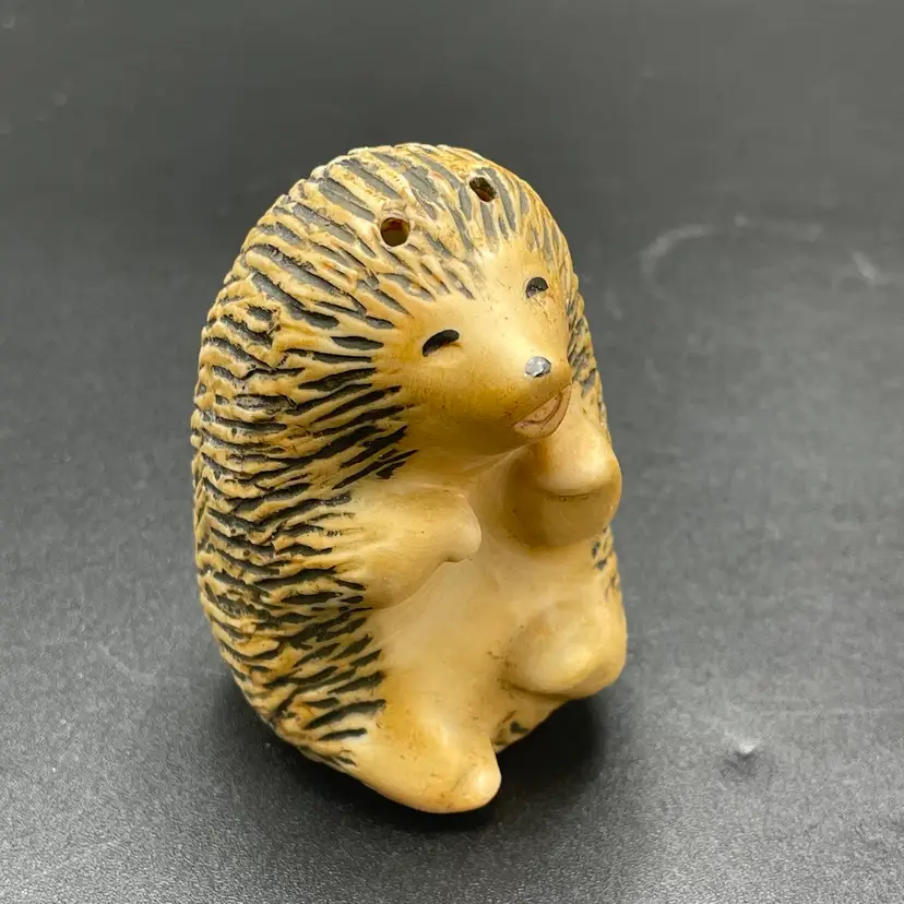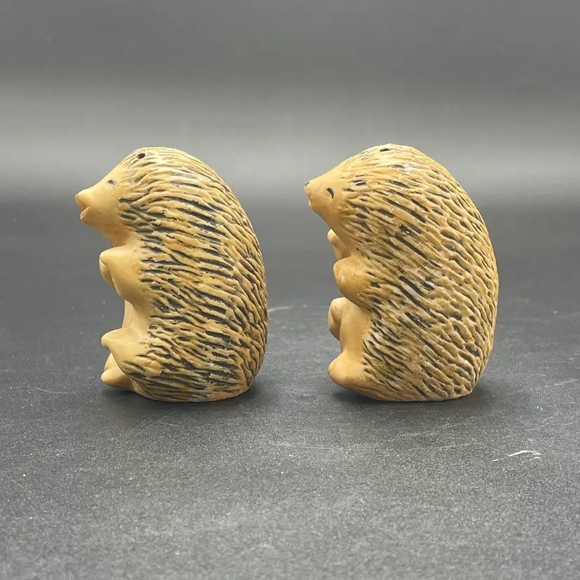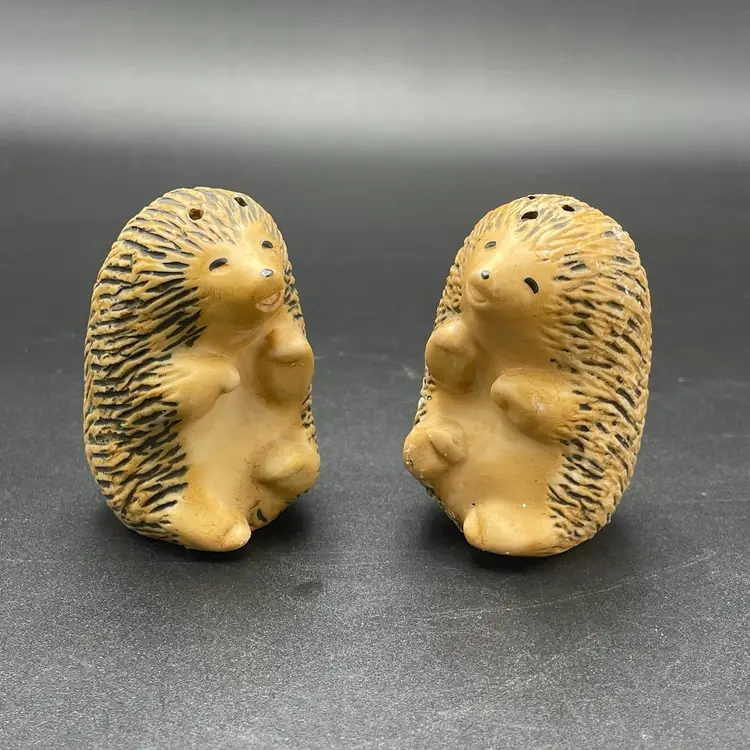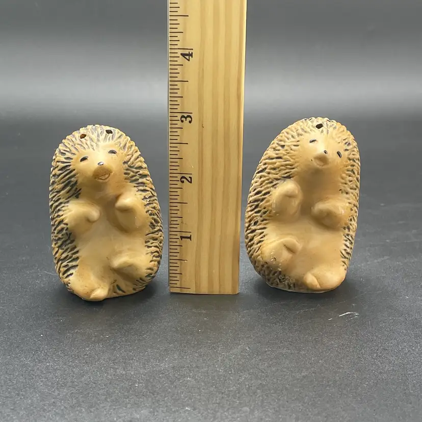 This is a vintage set of 2 ceramic hedgehog salt and pepper shakers Made in Korea. Each measures approximately 3" tall. The cork stoppers are not original to the shakers. No chips or cracks.