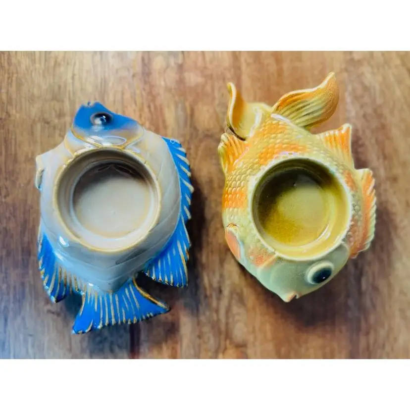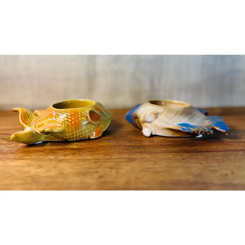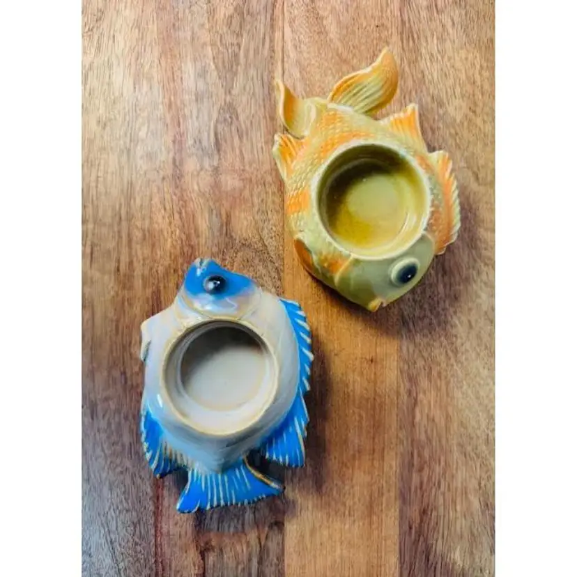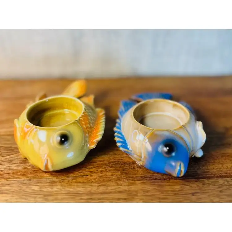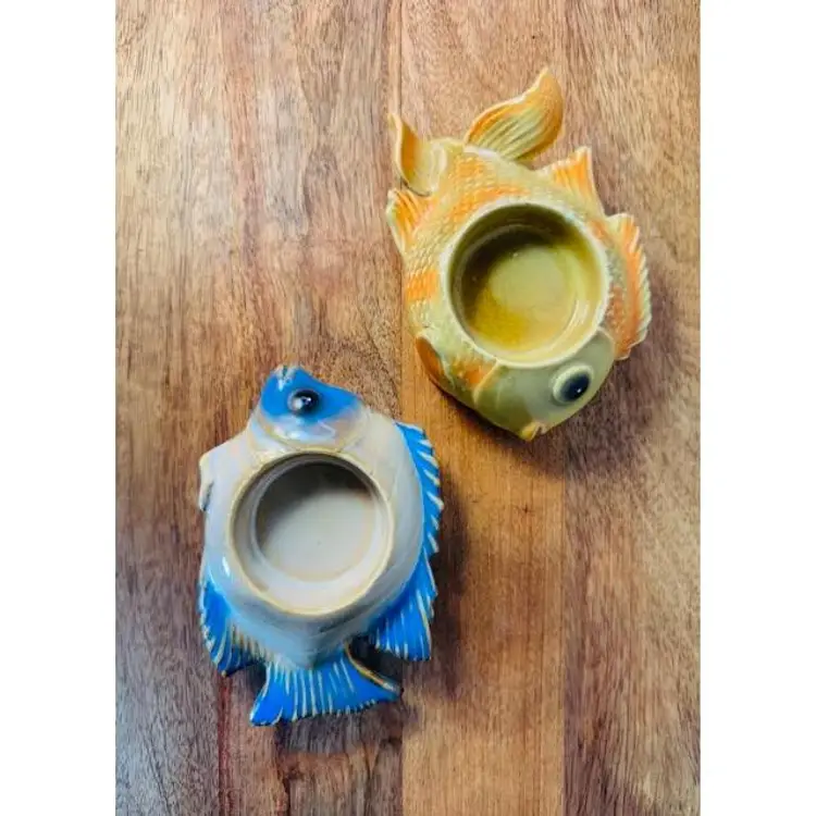 Set of 2 ceramic tropical fish tea light candle holders. There are 2 different styles, sizes and colors. Blue/Orange/Gold/Yellow. They are in excellent condition with no chips or cracks. They were never used with candles. The fish measures 4.5 inches long x 3.5 inches wide. They are approximately 1.25 inches tall/thick. They have a glossy smooth finish. They would be great for an outdoor Tiki party or luau.