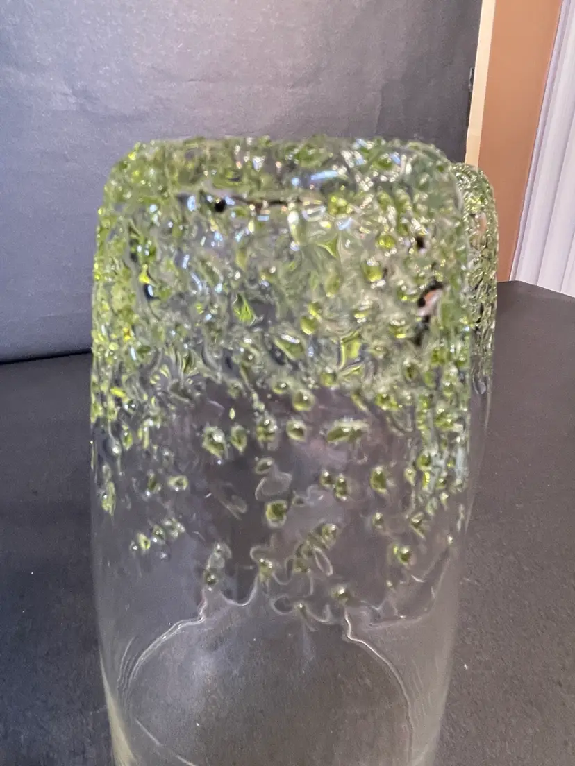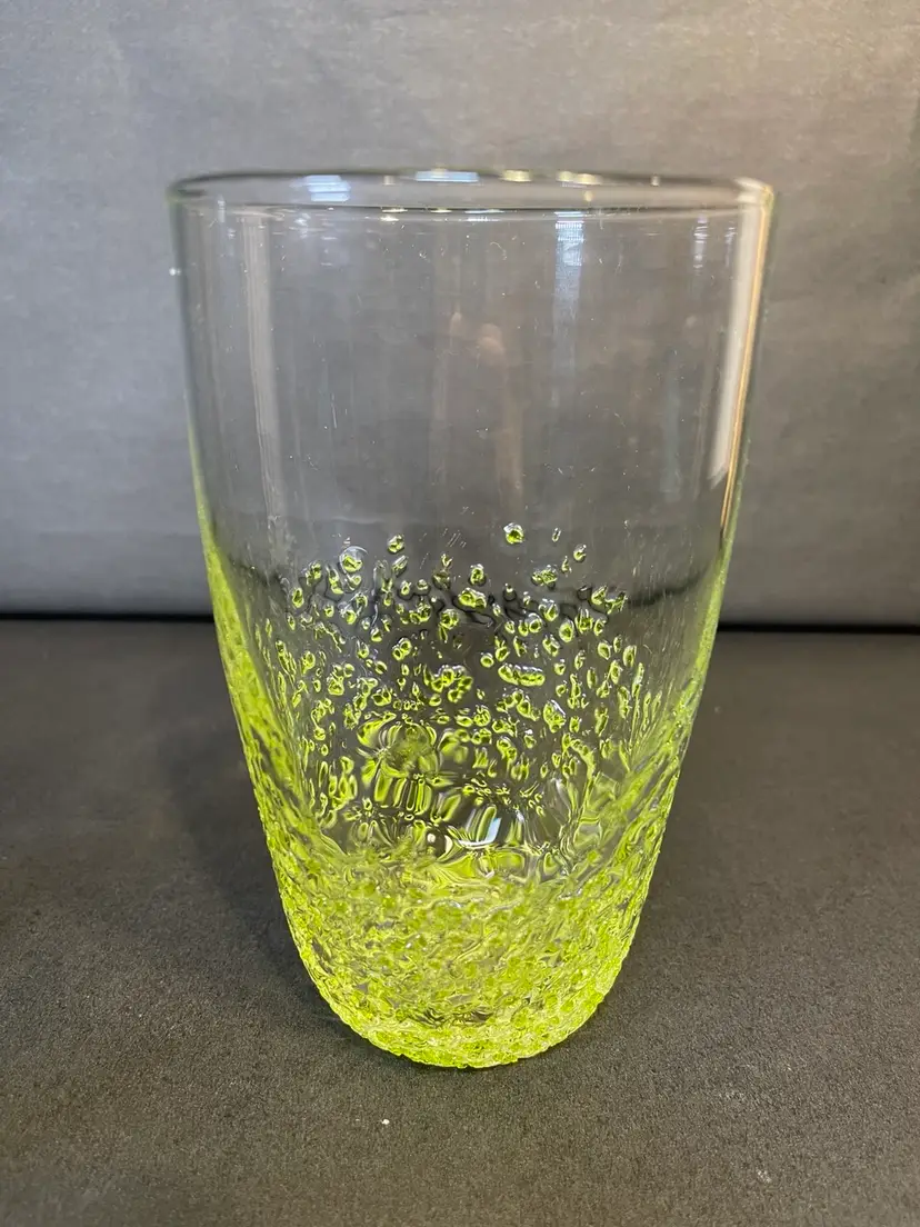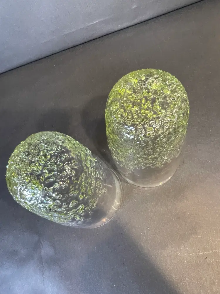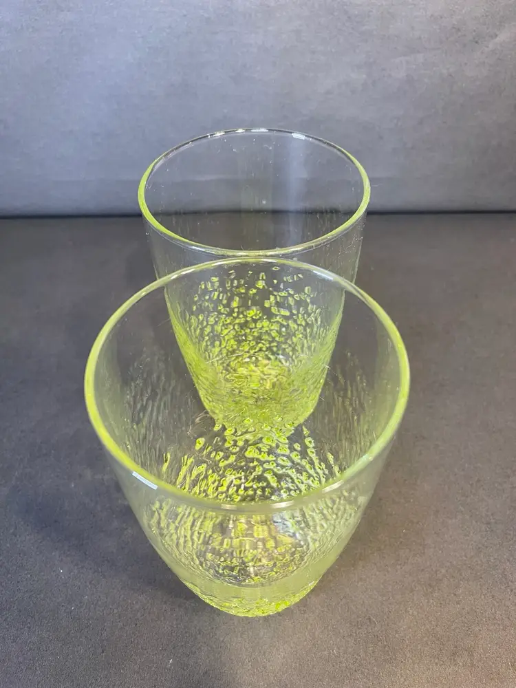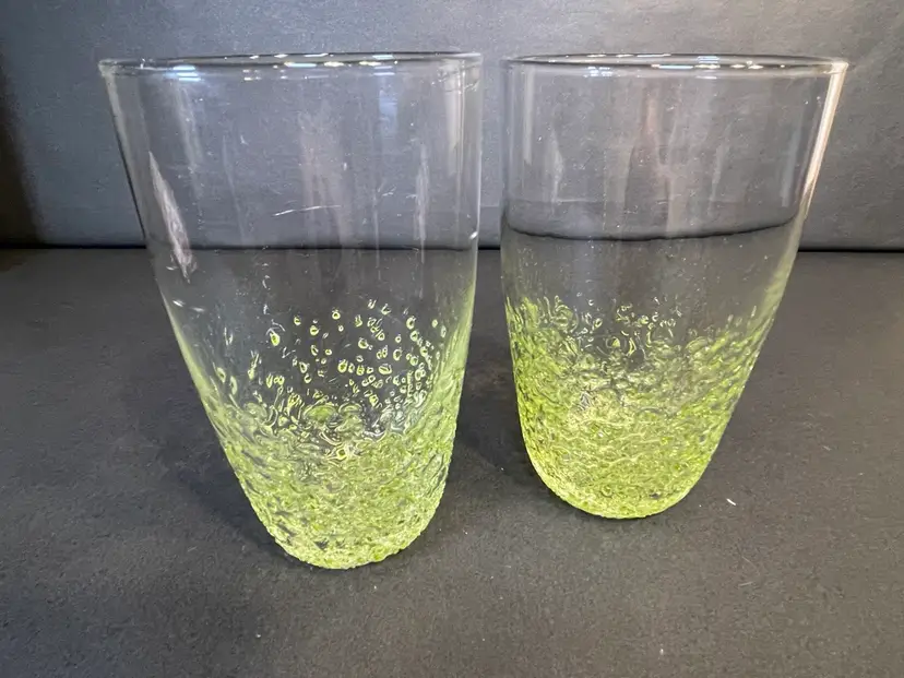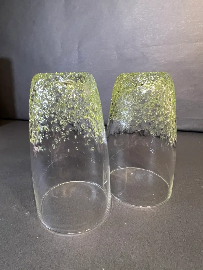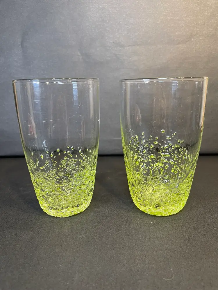 This set of glasses is made of clear glass with an applied green speckle at the bottom. I was unable to identify their maker, but they are fun and unique! One of the glasses has a few scratches on the clear glass, but both are overall in great shape. They are a great set to use for St Patrick’s day or spring in general.