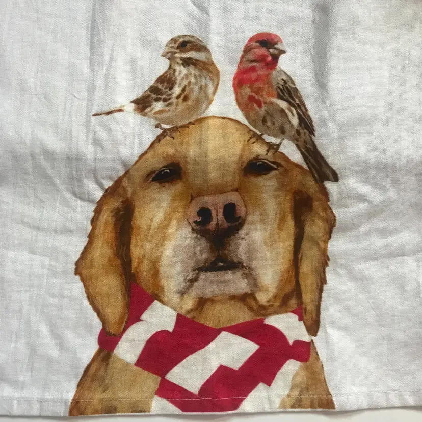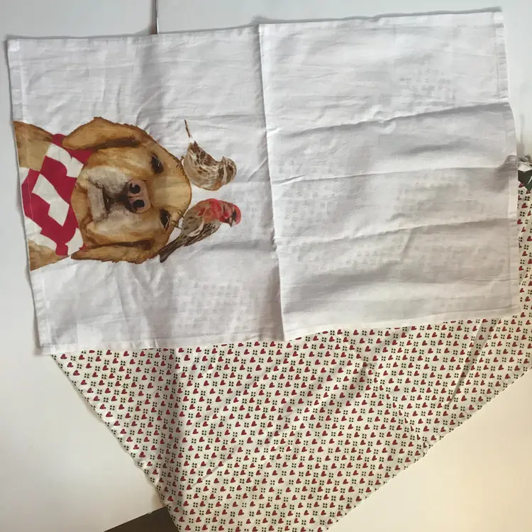 This is for 2 new dish cloths. One has a yellow Lab with birds on his head and a winter scarf and the other has an all over print of hearts. They both have a loop at the top. 100% cotton, made in India, 28x18 inches.