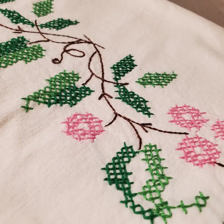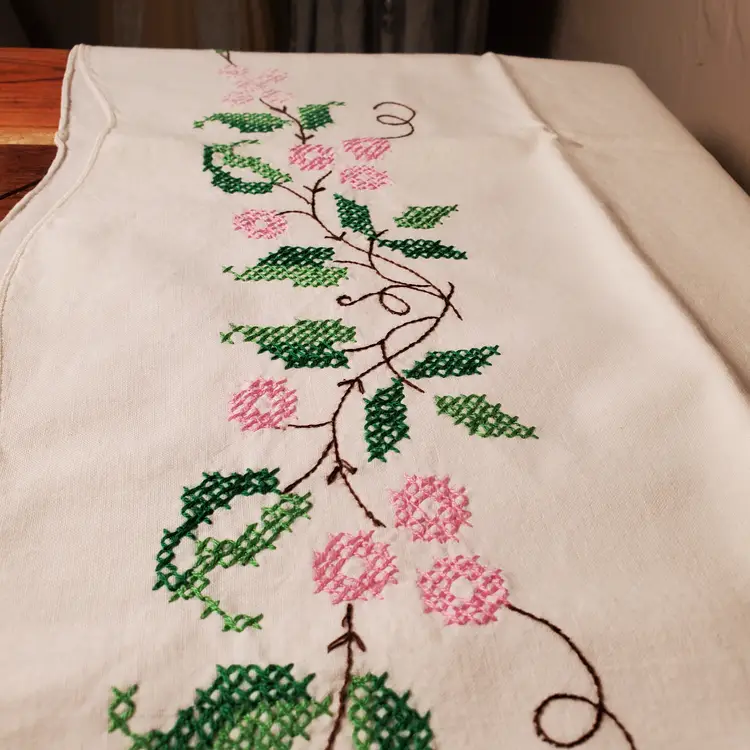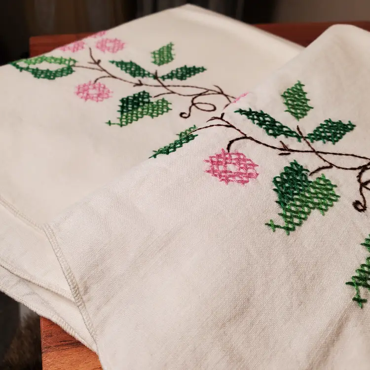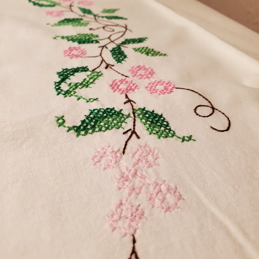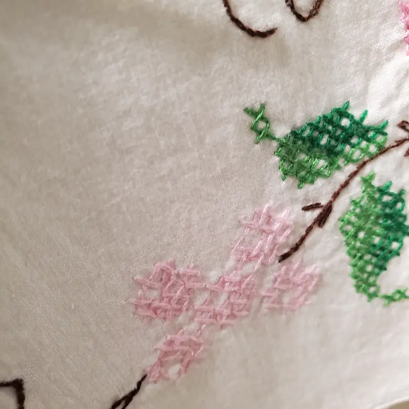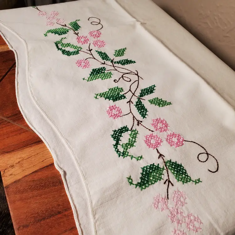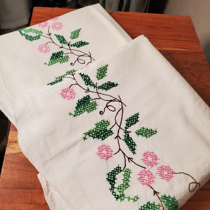 Beautiful set of embroidered pillowcases in excellent vintage condition. Fits standard pillow; 21" x 28". In very good vintage condition with no yellowing and one tiny stain as noted in photos.