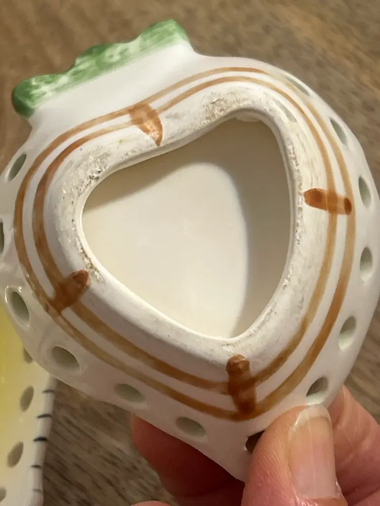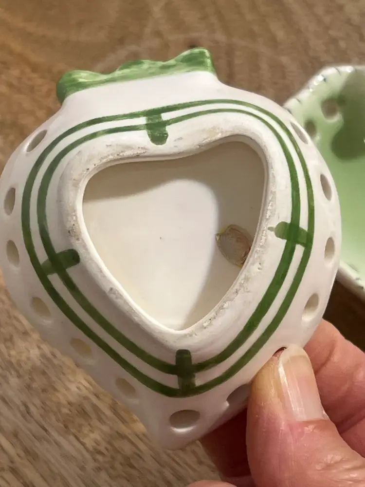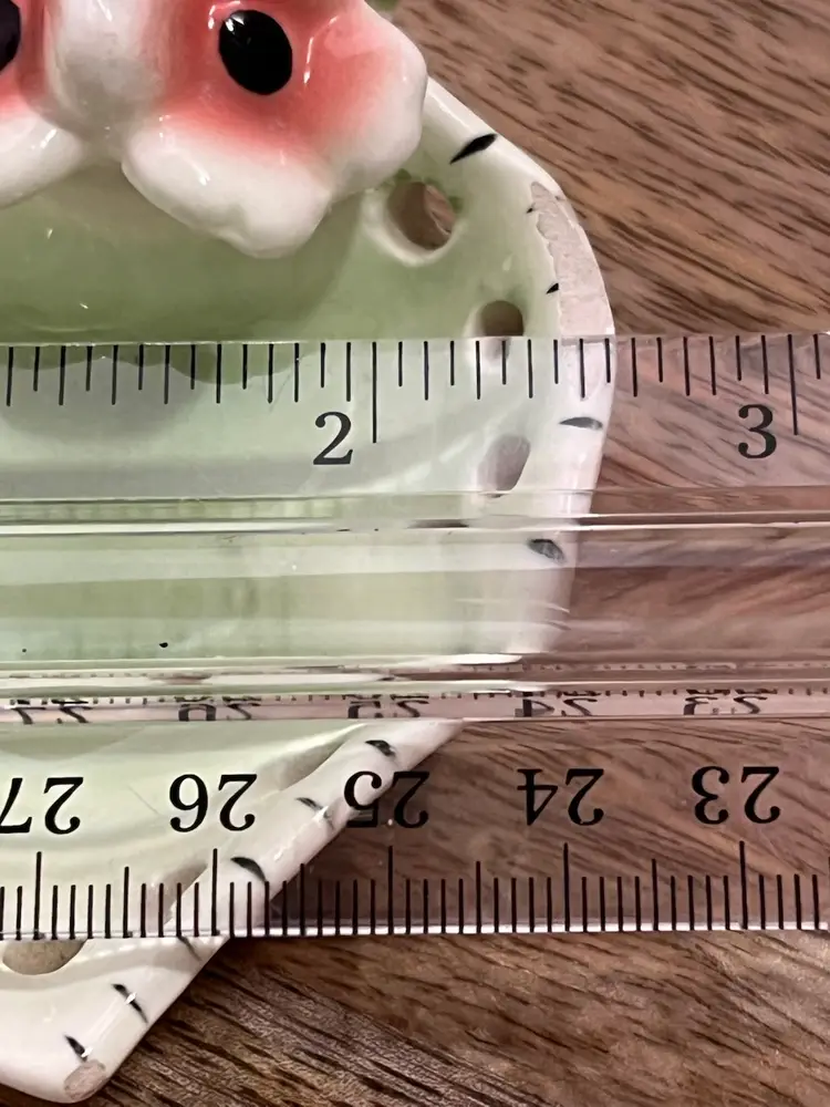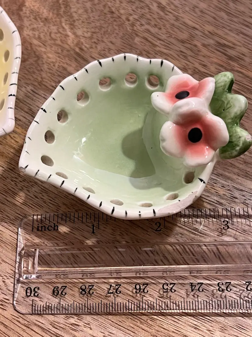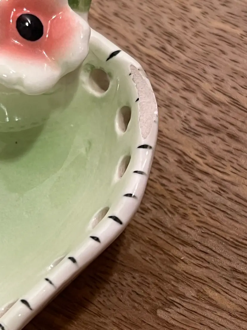 Please see pic 1 green dish has a small chip on rim near flower 2.5” wide & 3.25” long “Japan” sticker on bottom