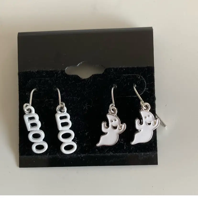 Set of 2 vintage Halloween Boo and Ghost enameled metal earring sets. They measure between 1/4” to 1/3” across and dangle 1” to 1 1/4”.