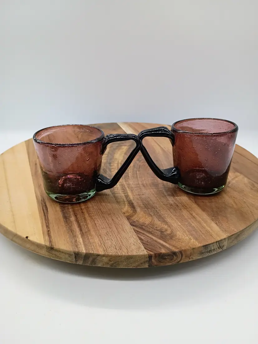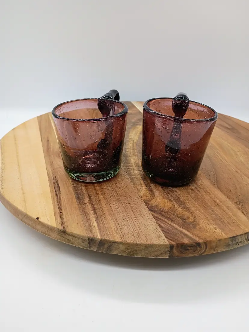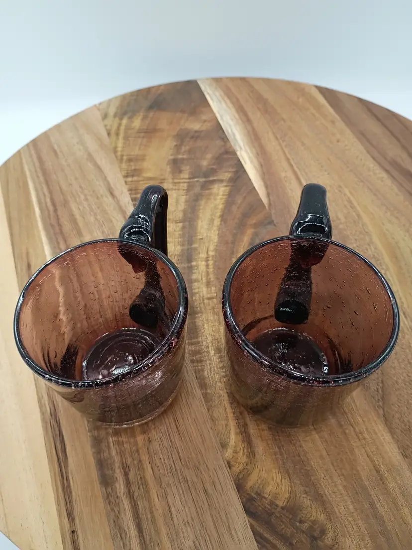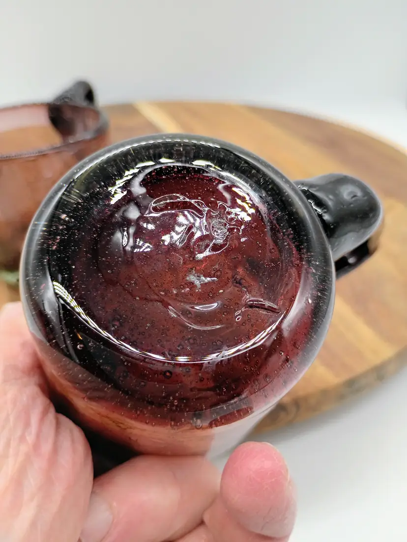 Set of 2 Hand Blown Art Glass Amethyst with Applied Handle 8 OZ Mugs. Each mug is 3. inches tall at rim 4.5 inches from rim to handle and 3 inches in diameter. Microbubbles throughout glass. Most likely Mexico for origin. These are preowned, no chips cracks or flea bites, Handles are secure . No hard water stains no utensil marks Excellent condition. Ships USPS