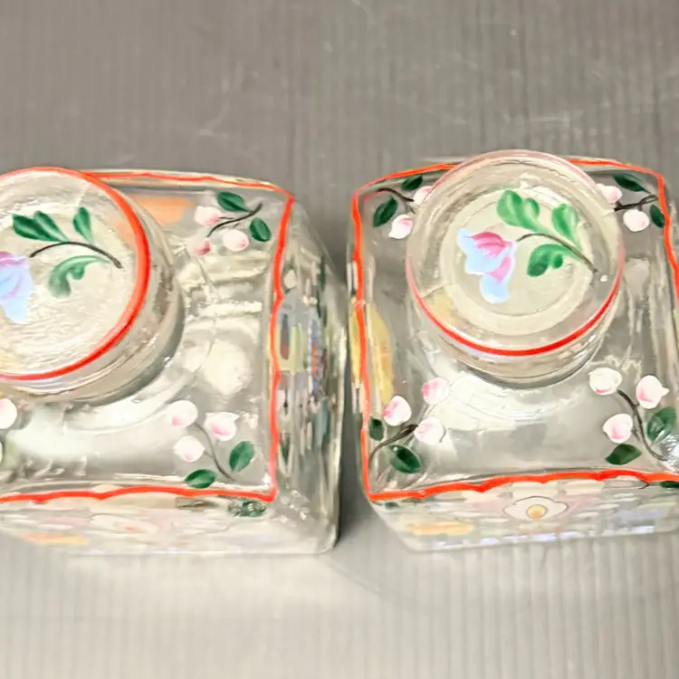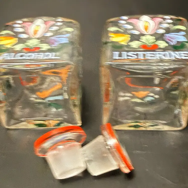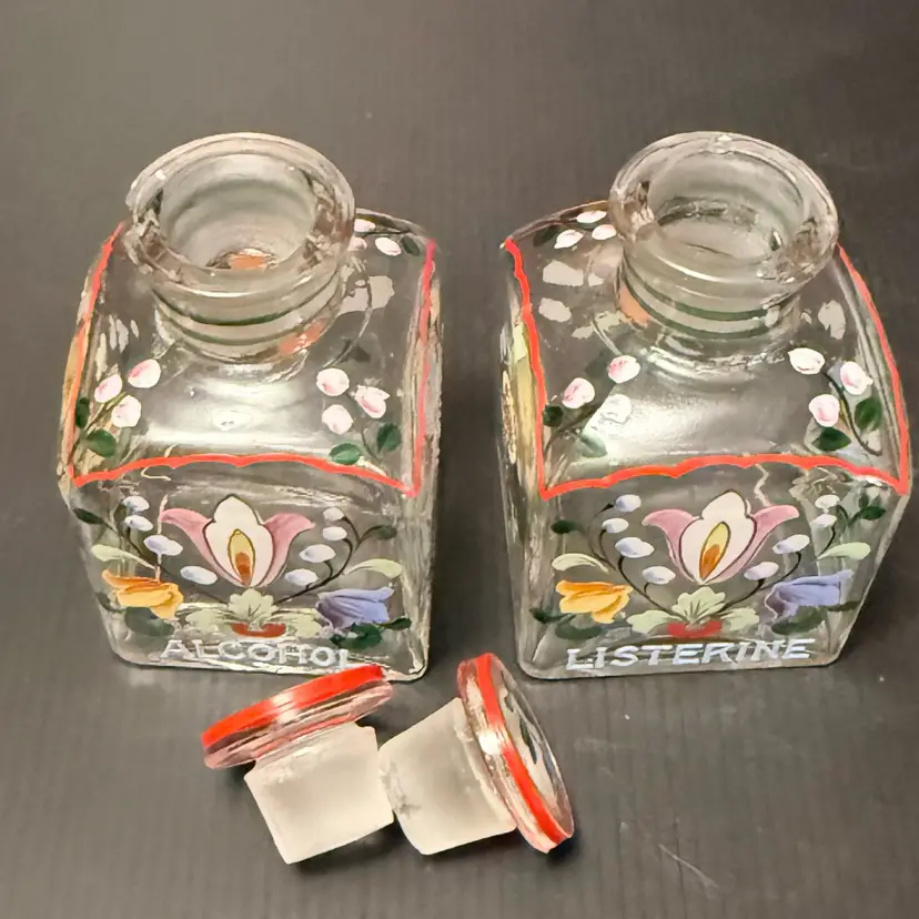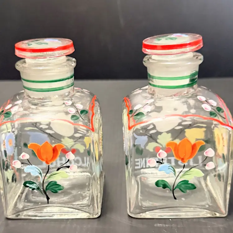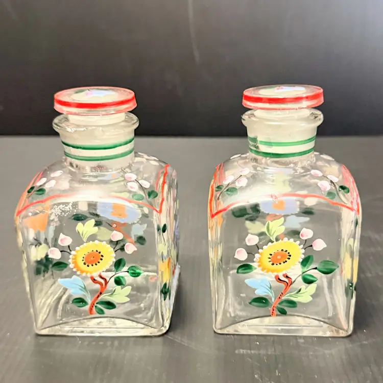 Good Condition One bottle does have a chip on the rim of the bottle head Measures approx 4”H