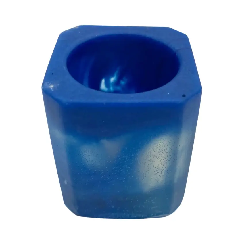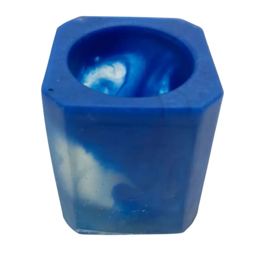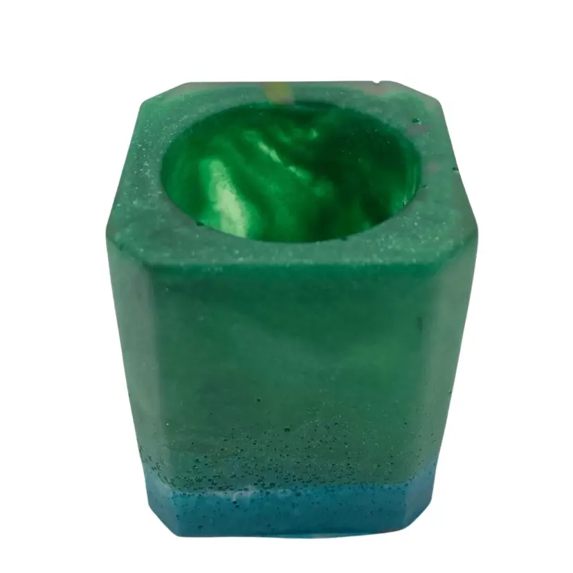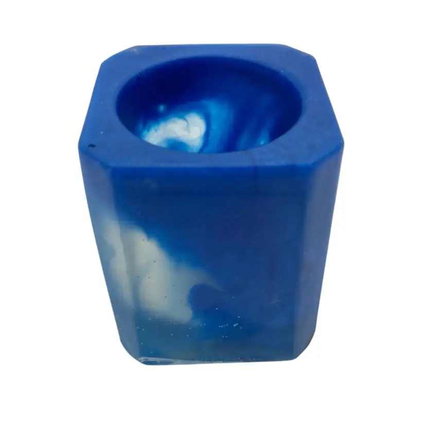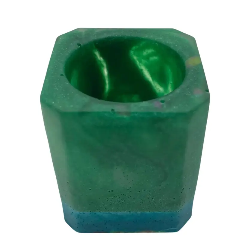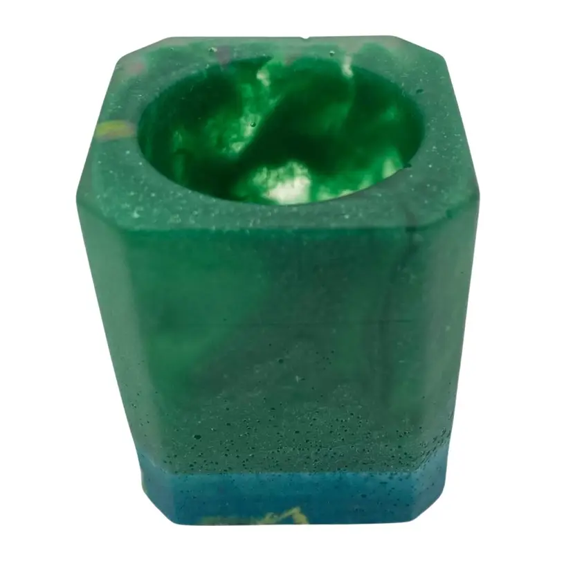 This set of 2 handcrafted marbled resin candle holders have the label 'D Thomas' on the underside. One is predominantly green with a blue base, while the other is predominantly blue with some clear areas. The small cube-shaped holders are made of resin with a matte finish and are suitable for mini candles or taper candles. The set weighs 4 ounces and each measures 2 inches in height and 1.6 inches in width. The diameter of the circle opening is 1.4 inches.