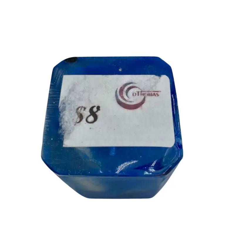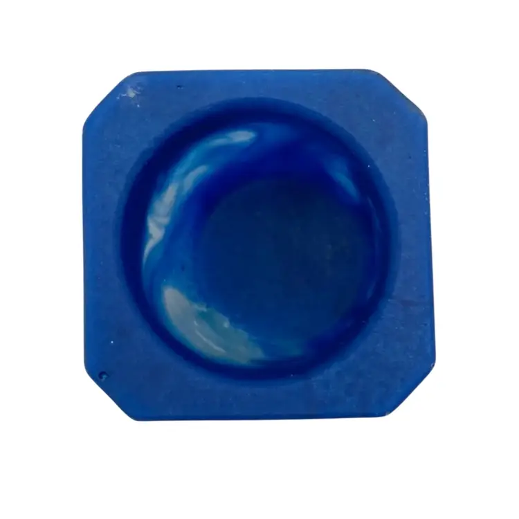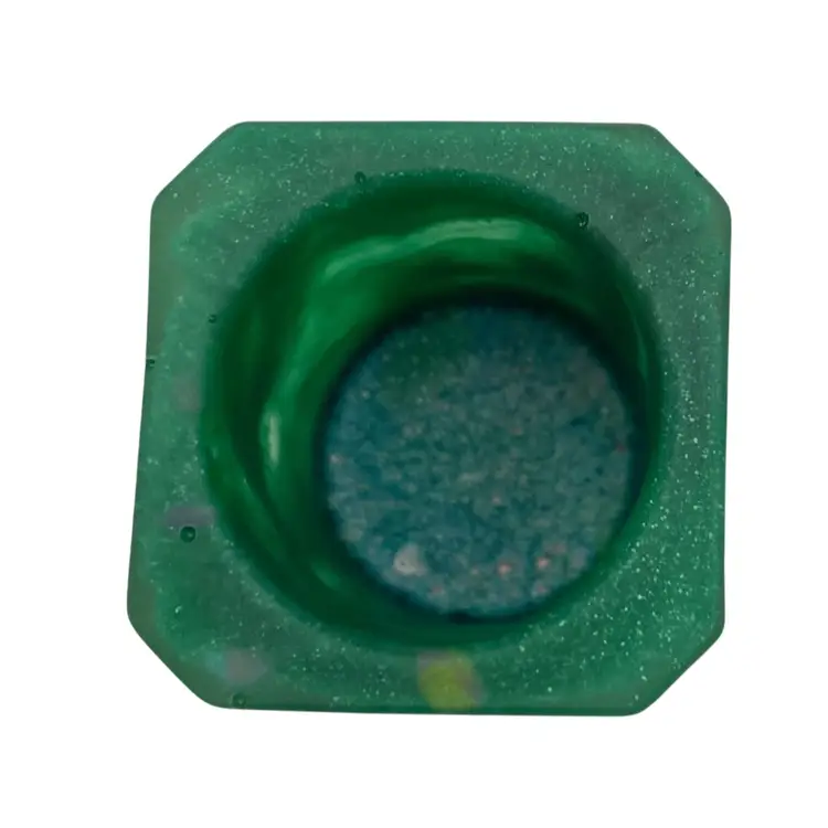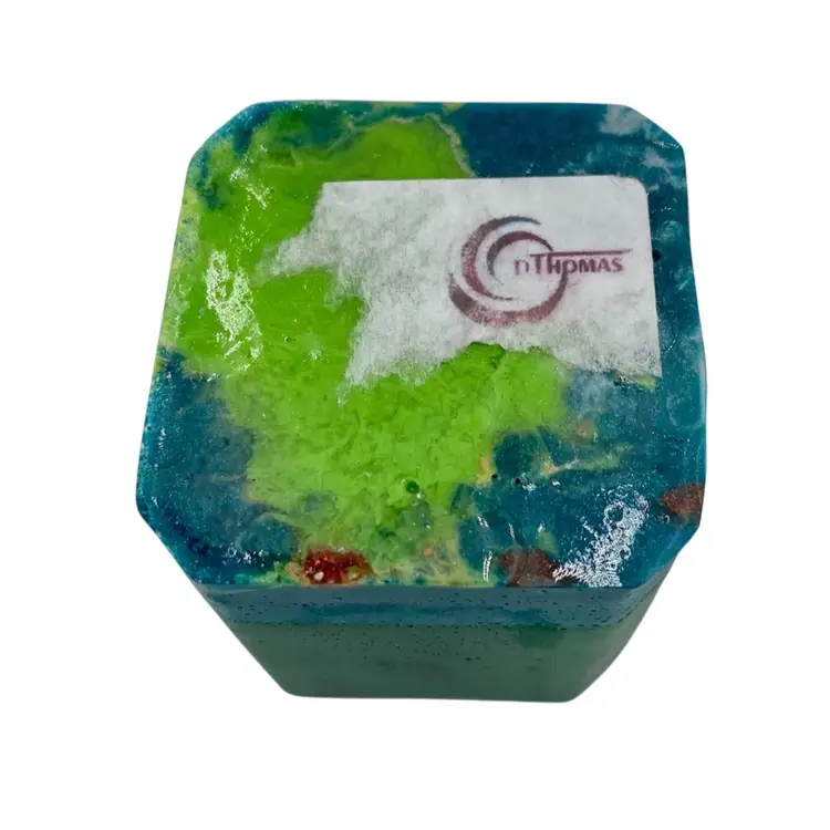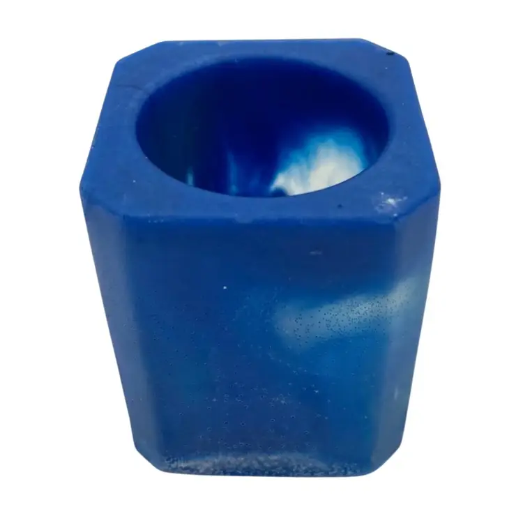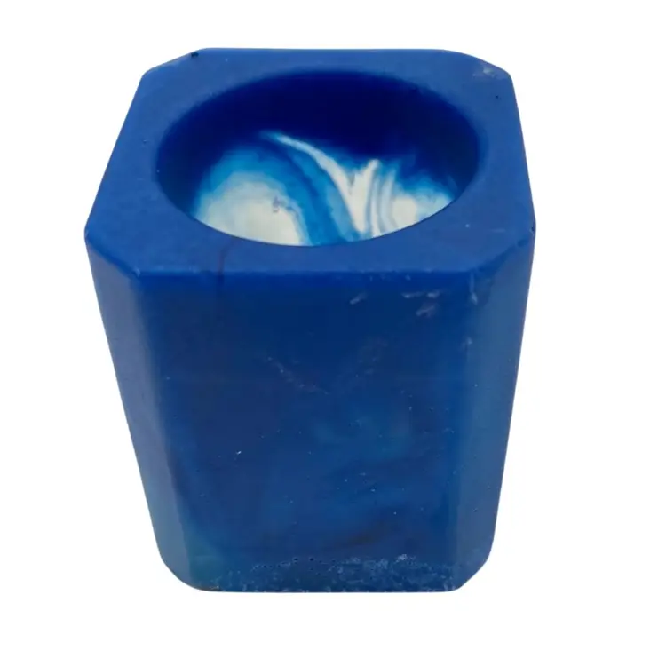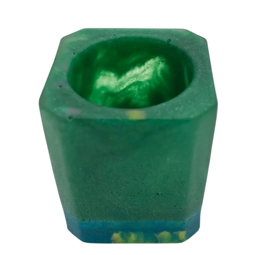 This set of 2 handcrafted marbled resin candle holders have the label 'D Thomas' on the underside. One is predominantly green with a blue base, while the other is predominantly blue with some clear areas. The small cube-shaped holders are made of resin with a matte finish and are suitable for mini candles or taper candles. The set weighs 4 ounces and each measures 2 inches in height and 1.6 inches in width. The diameter of the circle opening is 1.4 inches.