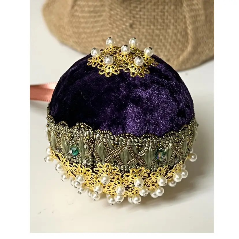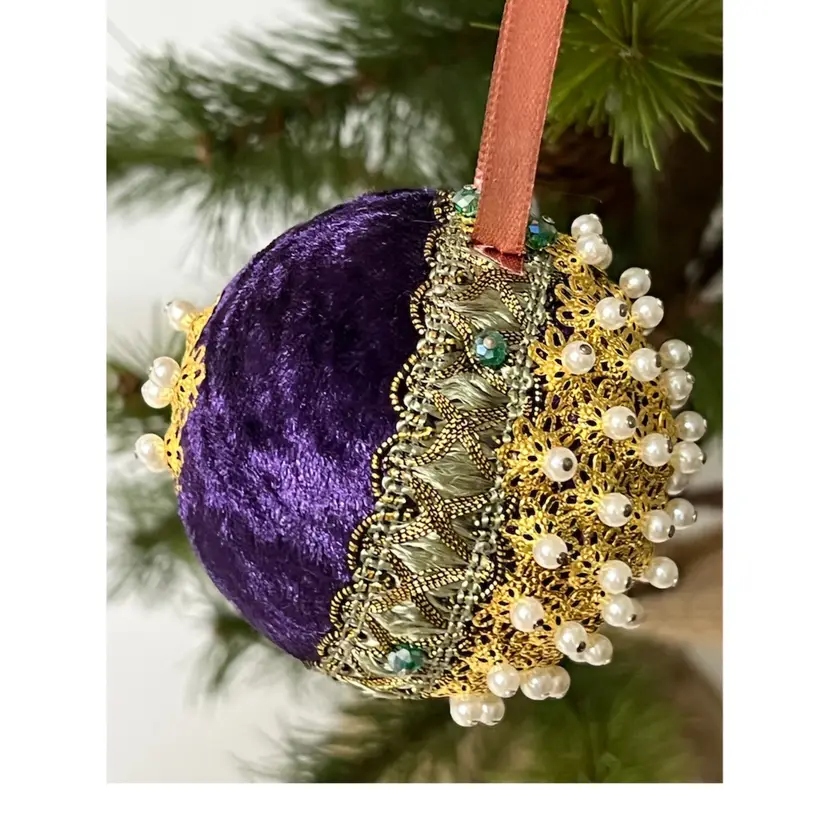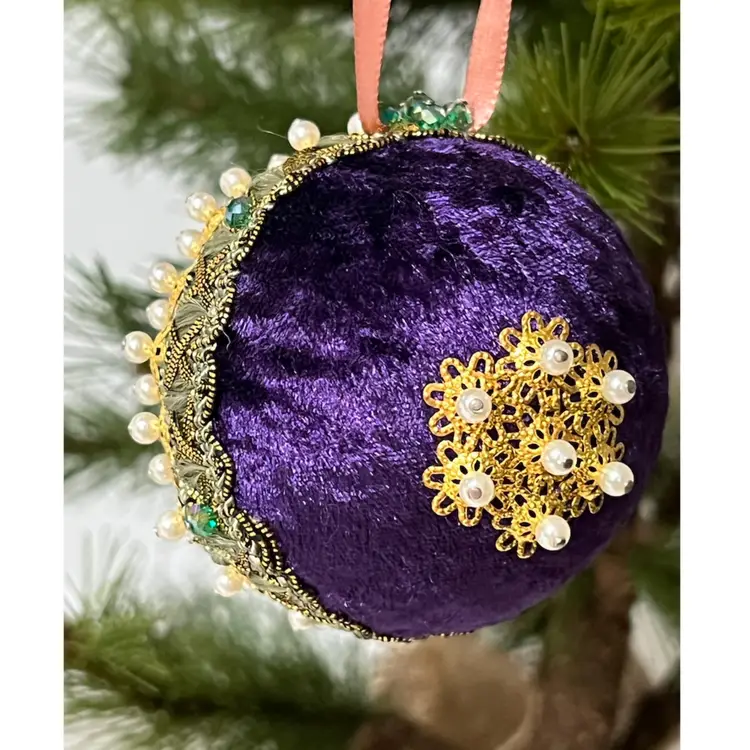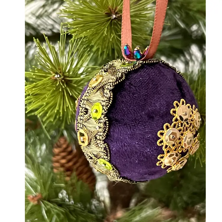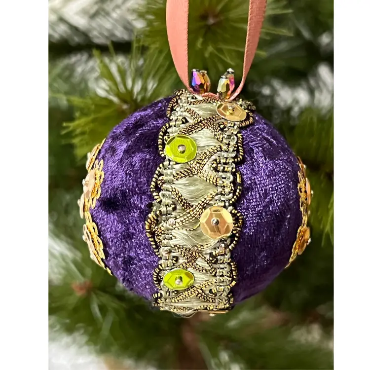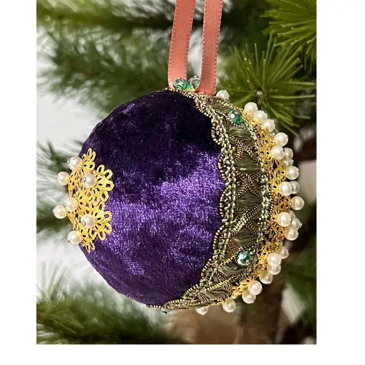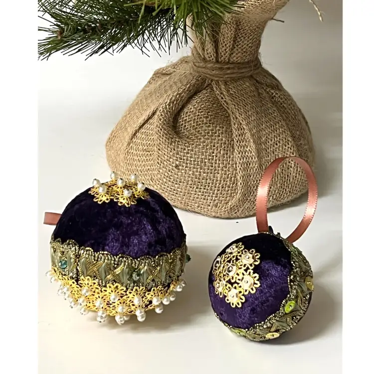 Set of 2 Handmade Vintage Style Push Pin Christmas Ball Ornaments Sequins Ribbon. Small 2 in height, large 2.5 in height