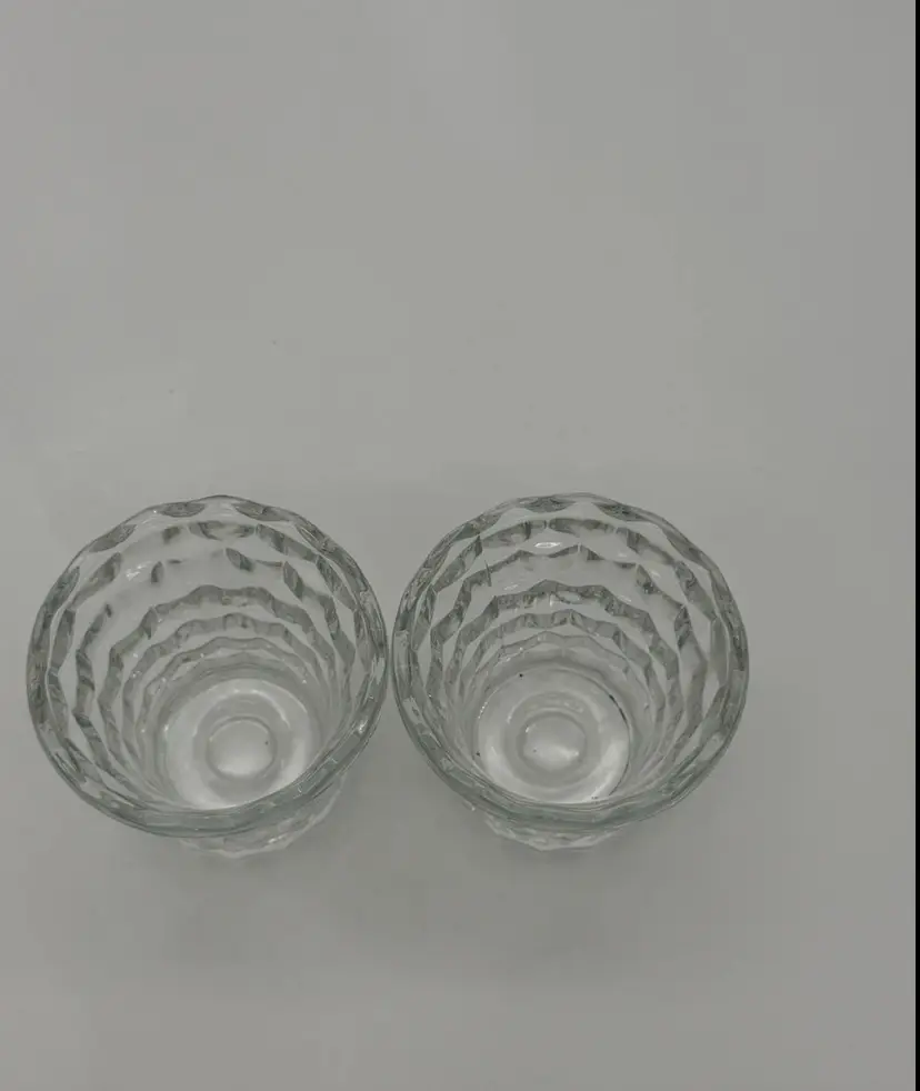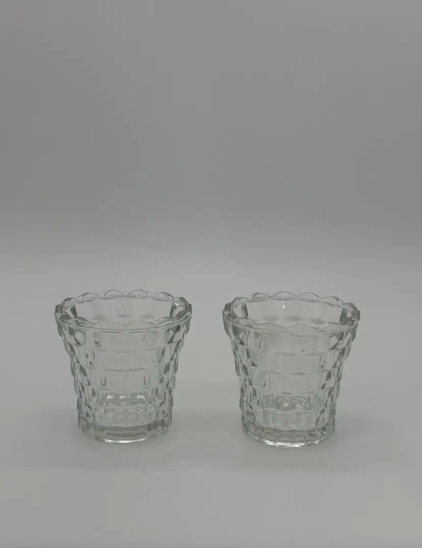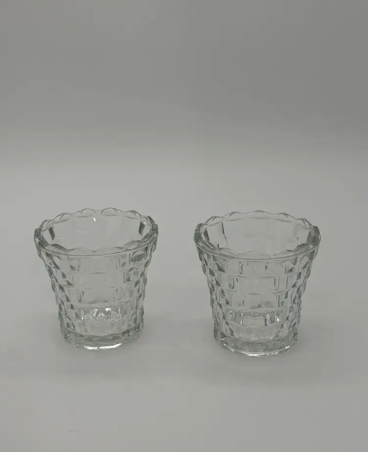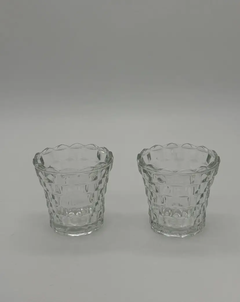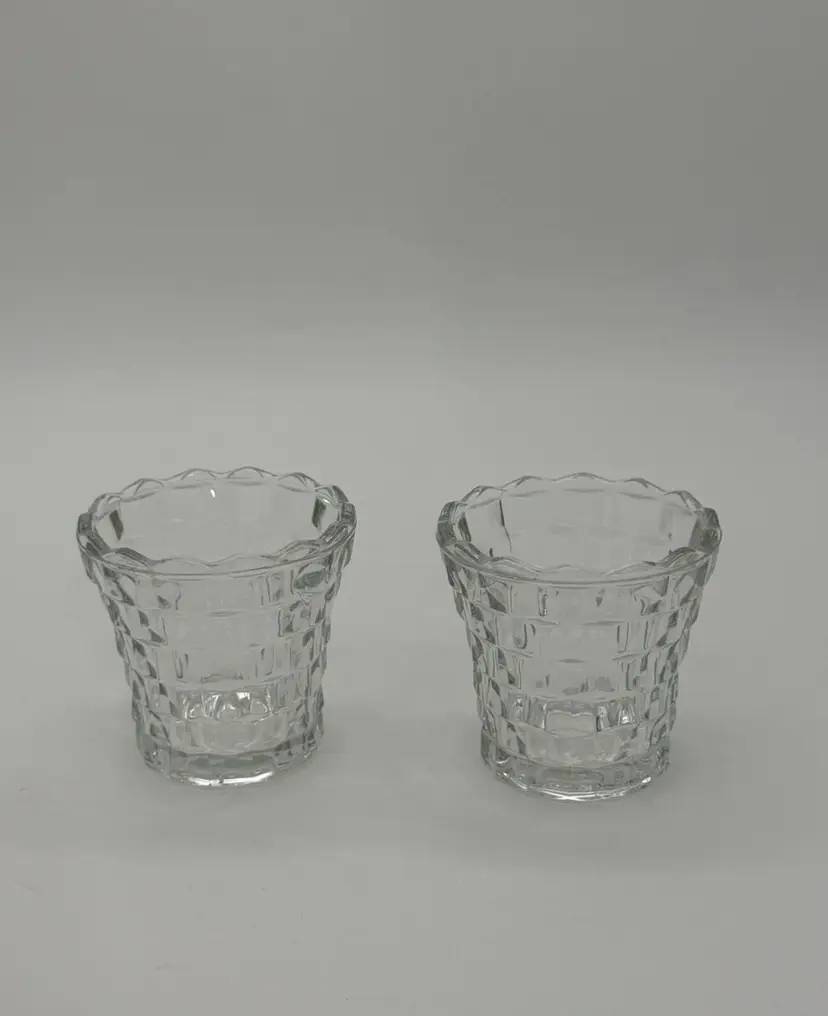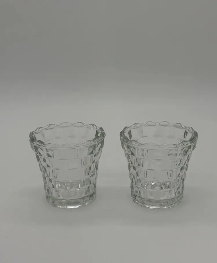 This set of 2 Indiana Glass Votive Tea Light Candle Holders in vintage clear with a whitehall cubist pattern is perfect for all occasions. Made of pressed glass, these round candle holders have a glossy finish and a 3D effect, adding a touch of retro style to your decor. Suitable for mini candles and furniture display, these candle holders are a charming addition to any room in your home. Each piece stands at 3 inches tall and 3.4 inches wide, weighing together 13.1 ounces. Made in the United States, these original candle holders are a beautiful and luminous addition to your space, and they are in excellent vintage lightly used pre-owned condition.