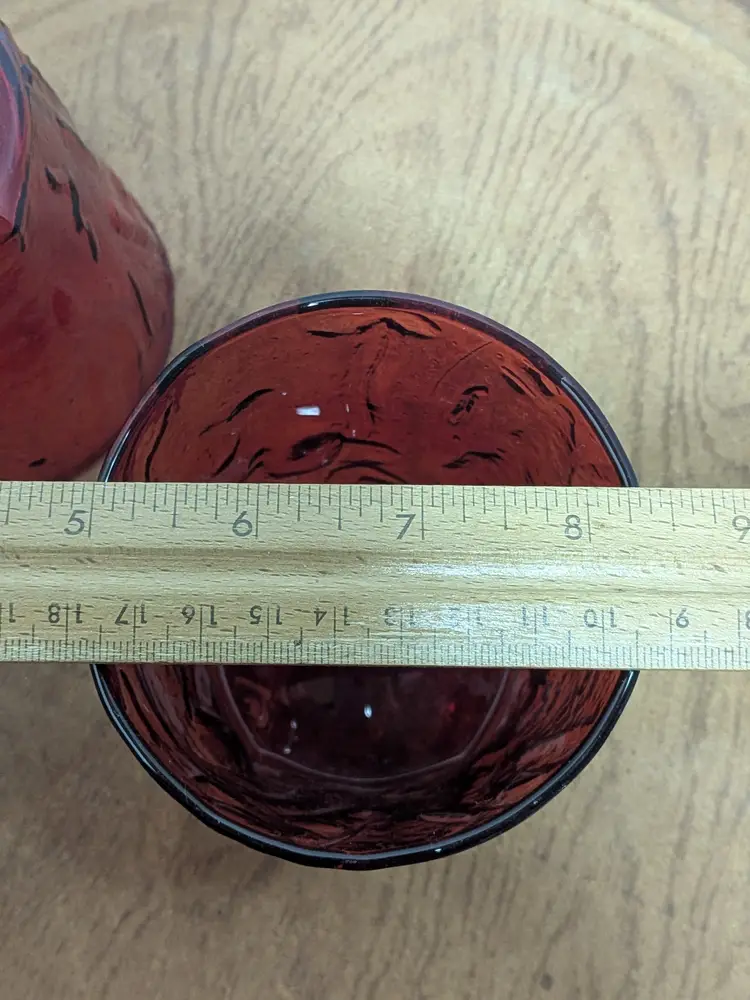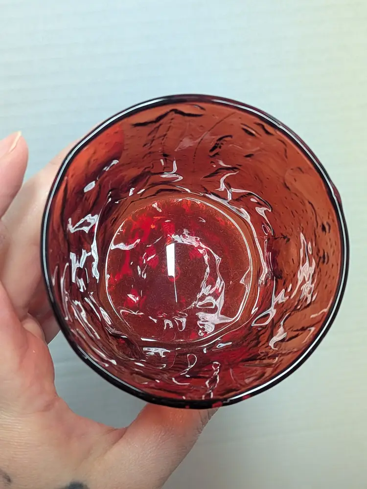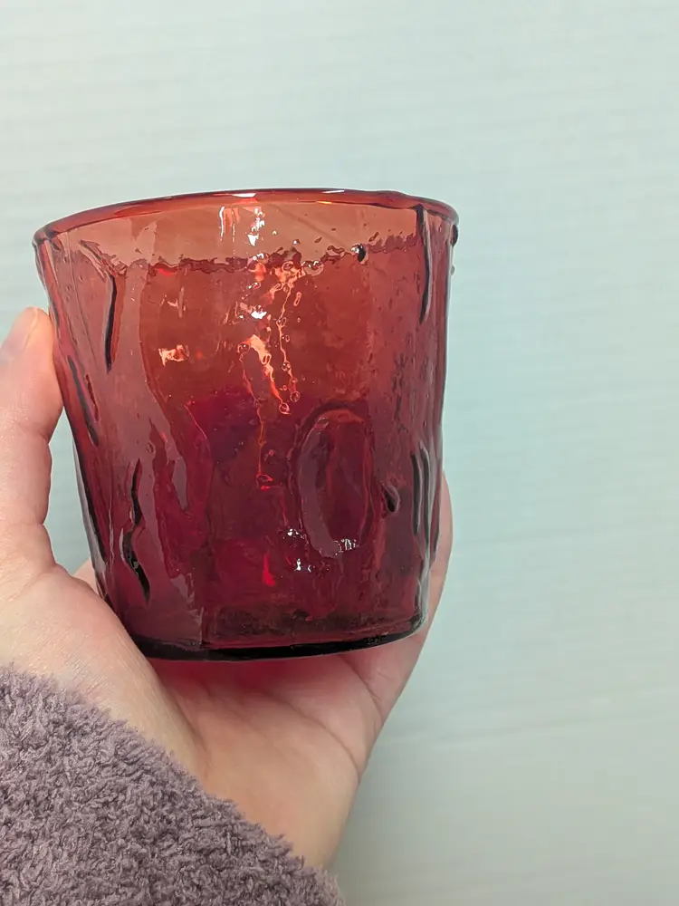 As shown and described in the live auction/ listing photos Morgantown Seneca Driftwood Red Double Old Fashioned glass tumbler. It features a distinctive "crinkle" or "tree bark" textured design. The glass is a vibrant ruby red color. It is approximately 3 3/4 inches in height and width. The capacity is around 14 ounces. This specific pattern was discontinued and is considered a vintage collectible item.