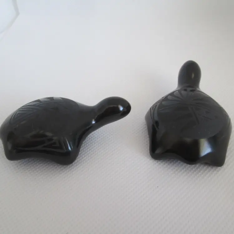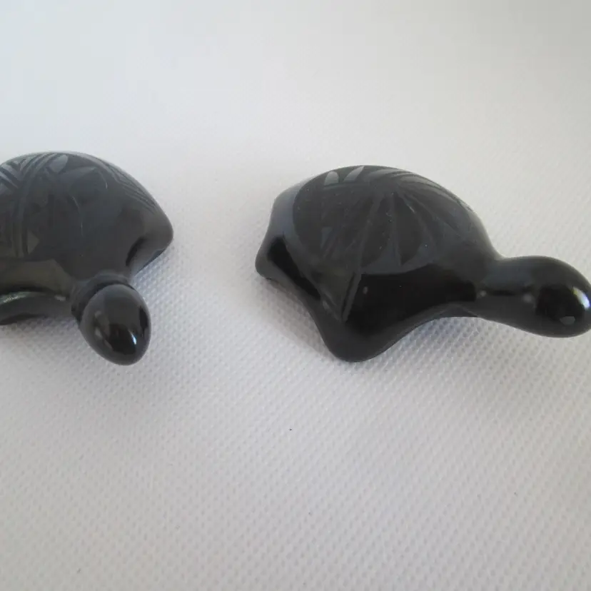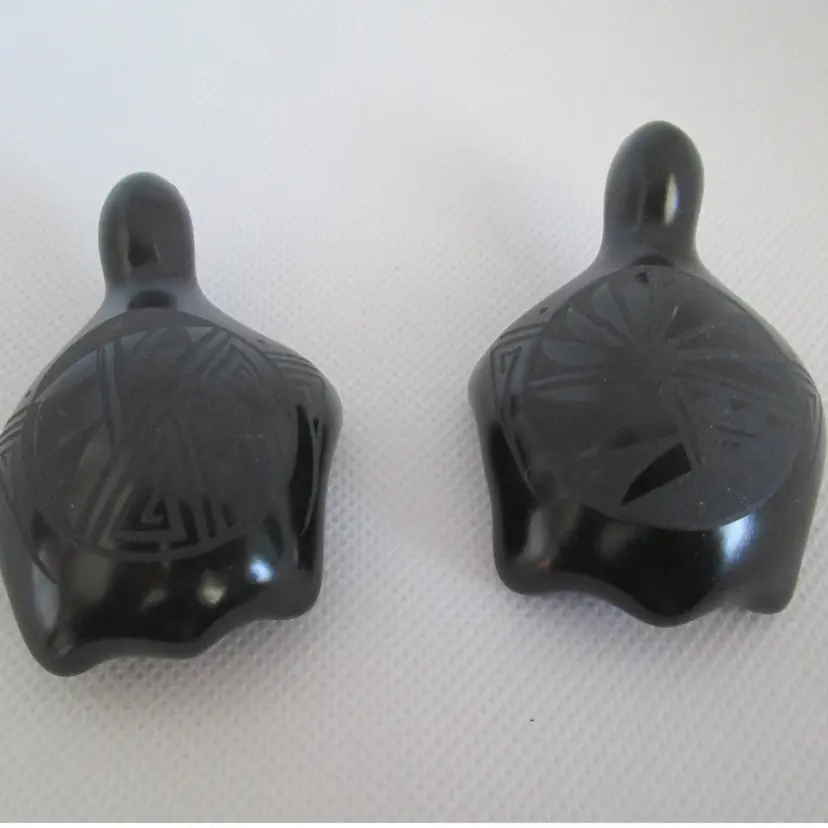 Set of 2 native American Navajo black on black pottery turtles. The turtles have an intricate design on their backs. They each measure about 2" x 2 1/2". Both are in great condition.