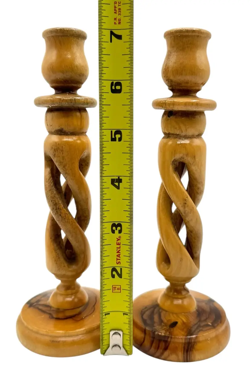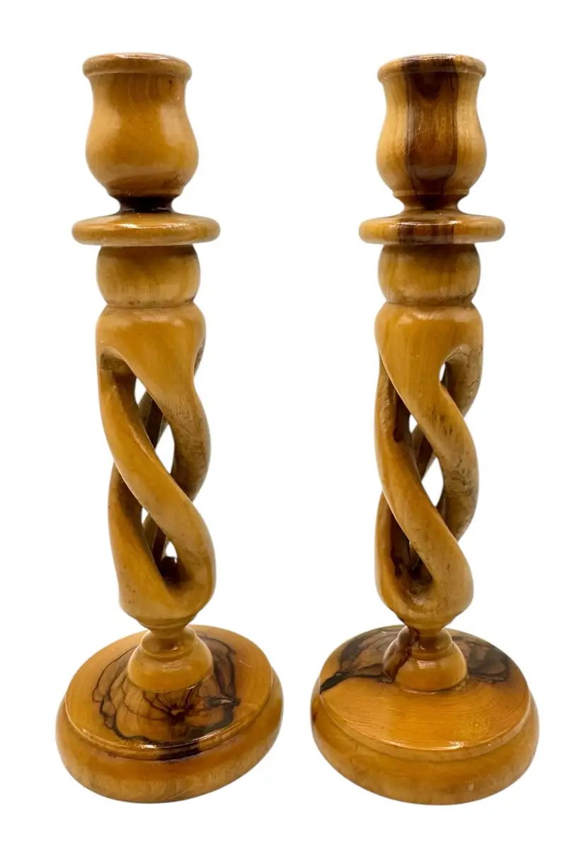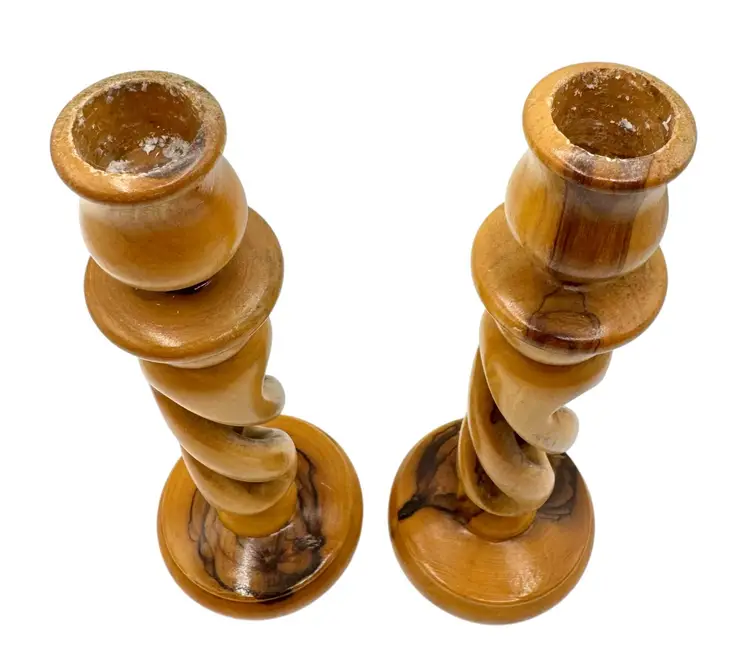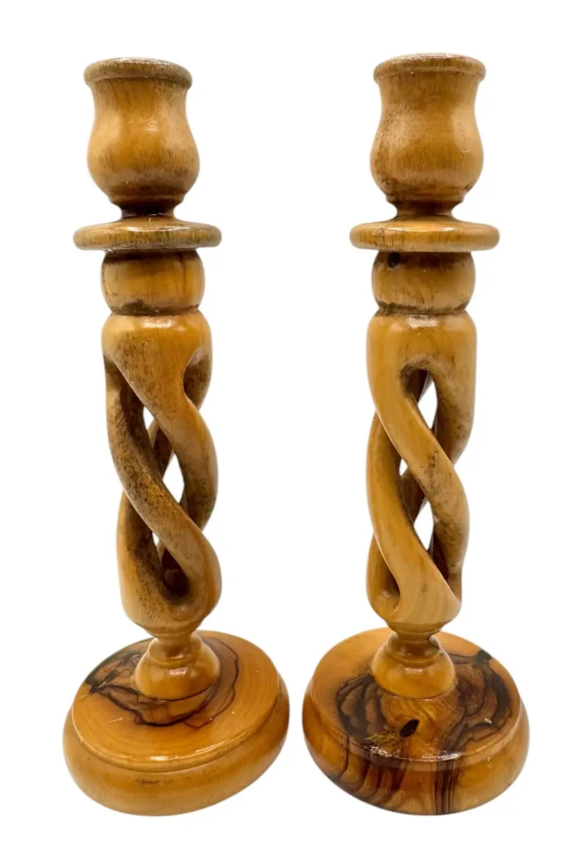 Pair of olive wood candlesticks with an open spiral design.