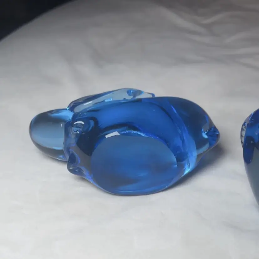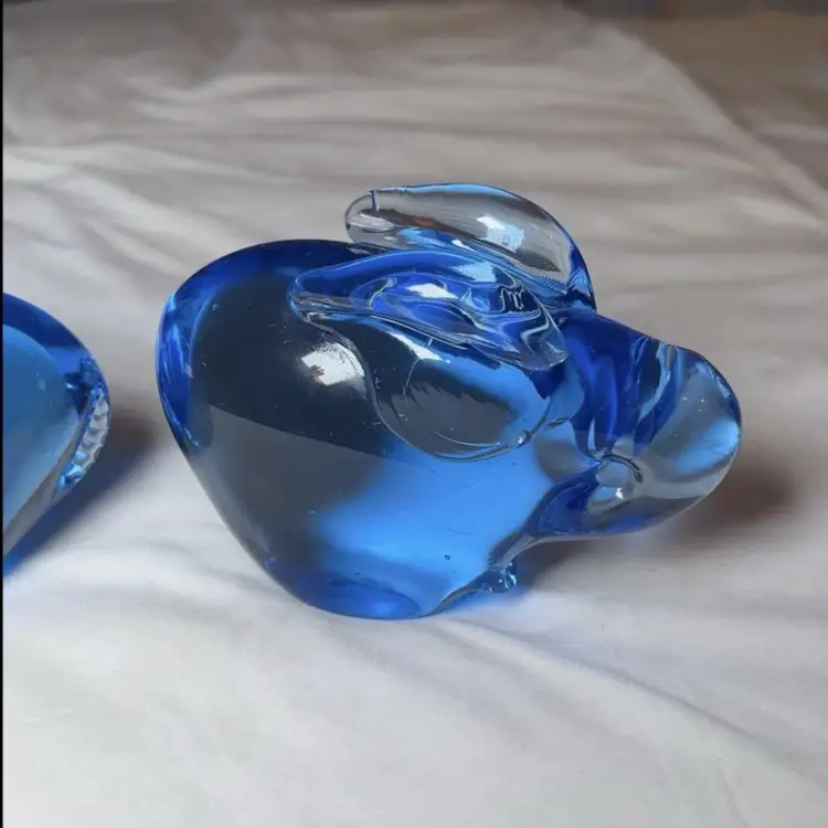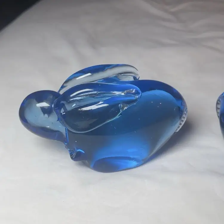 This set of 2 Pier 1 blue art glass crystal bunny rabbit figurine paperweights measures 6.5 inches long each. Made from hand-blown glass with a glossy finish, these decorative paperweights feature a charming rabbit theme in blue. The vintage pieces add a touch of artistry to any space with their unique design and craftsmanship. 4” tall 6.5” wide 2.5” deep.