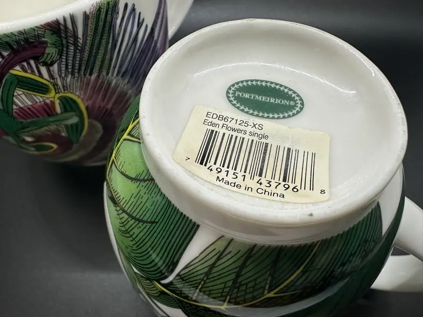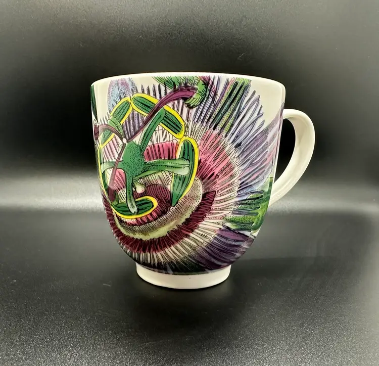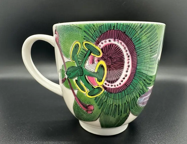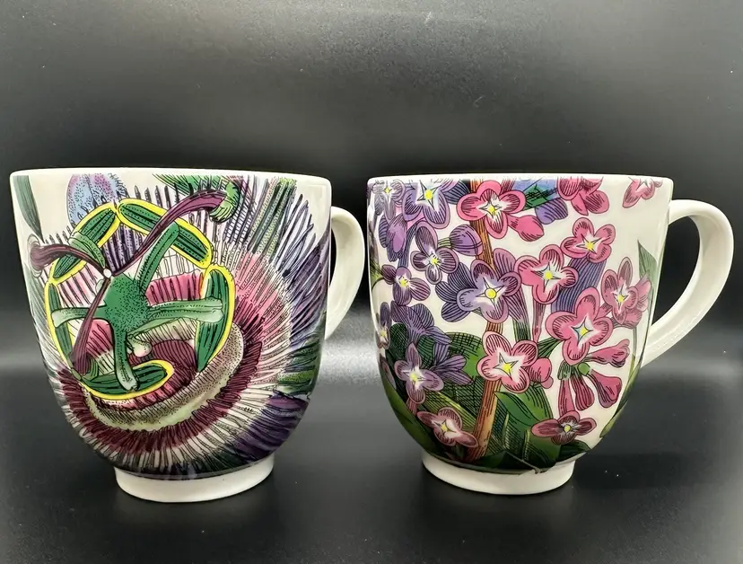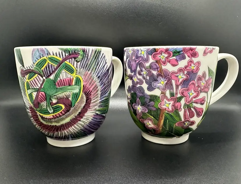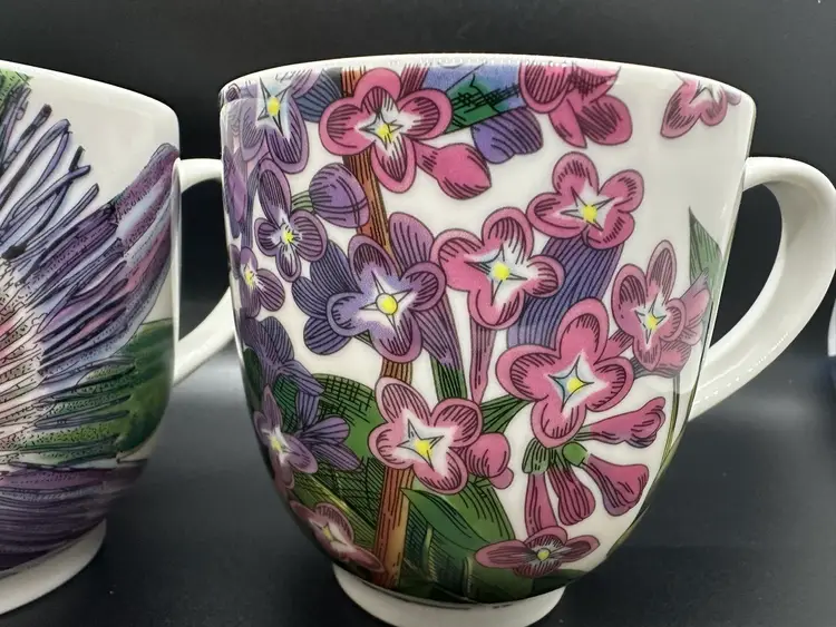 Excellent condition coffee mugs, 4.5 inches wide including handle and 3.5 inches tall. No chips, cracks, or scratches. Same color scheme but one is passion flower pattern and the other is lilacs. Please contact me with any questions.