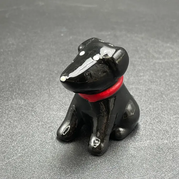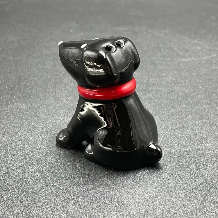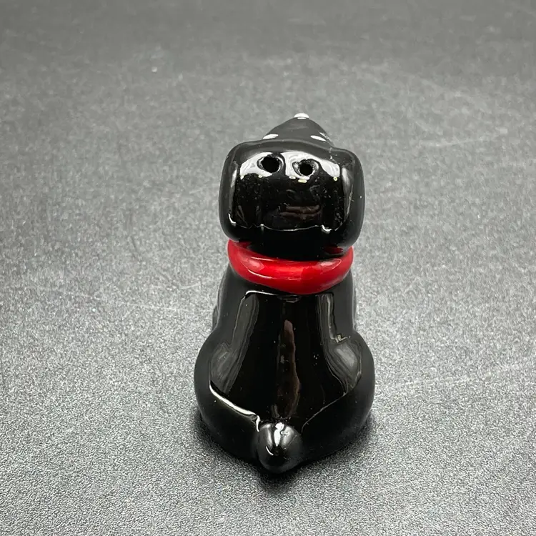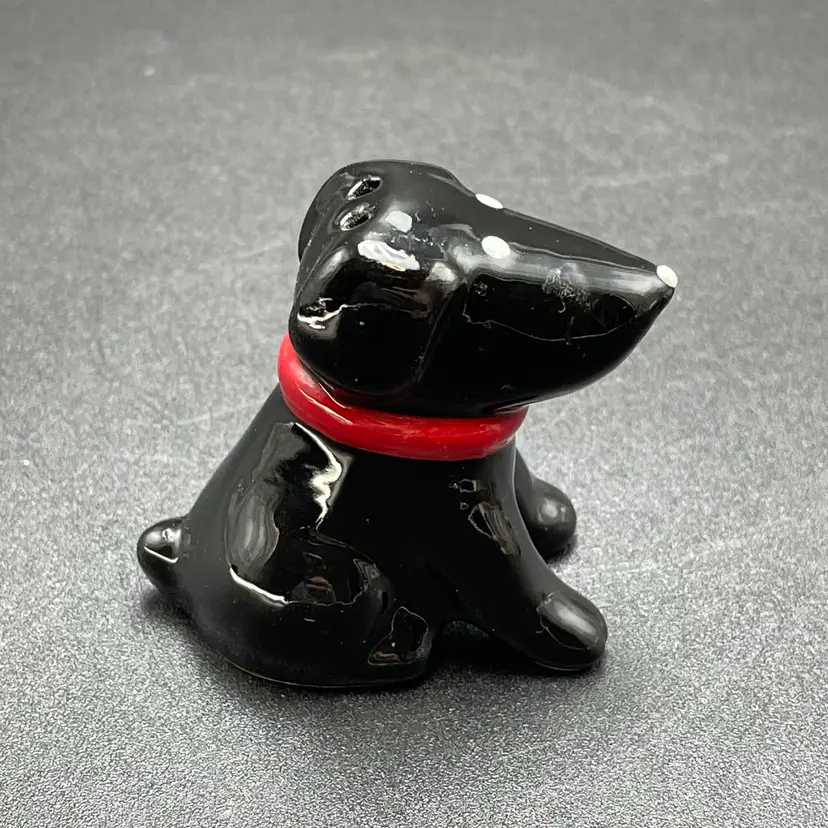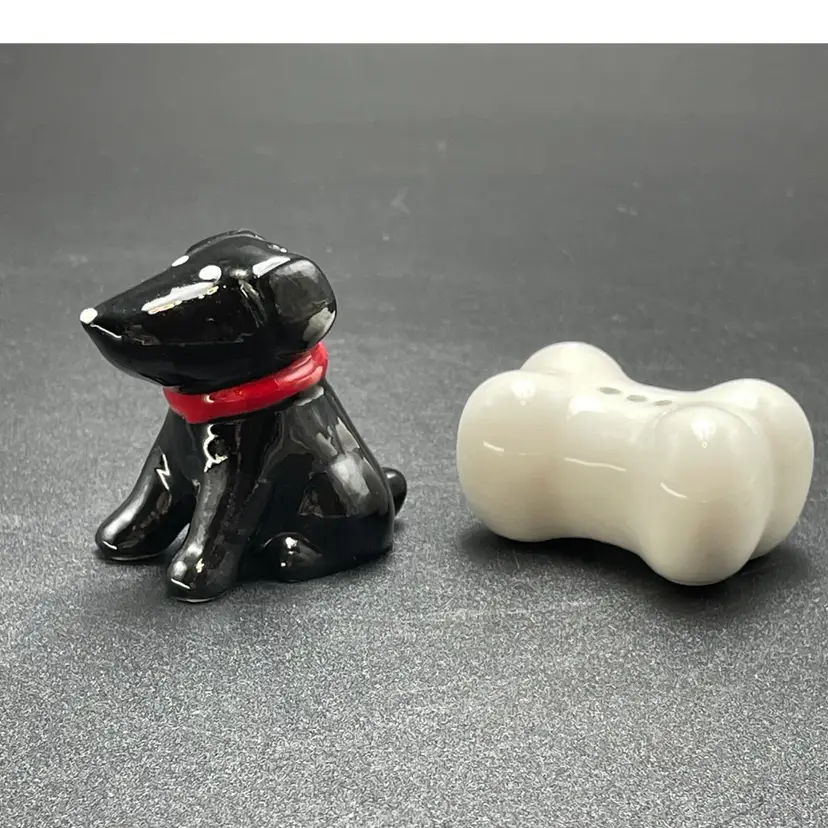This is a set of 2 dog and bone salt and pepper shakers. The dog measures approximately 2" tall. The bone is 1" tall x 1.75" long. No chips or cracks.