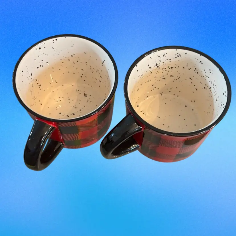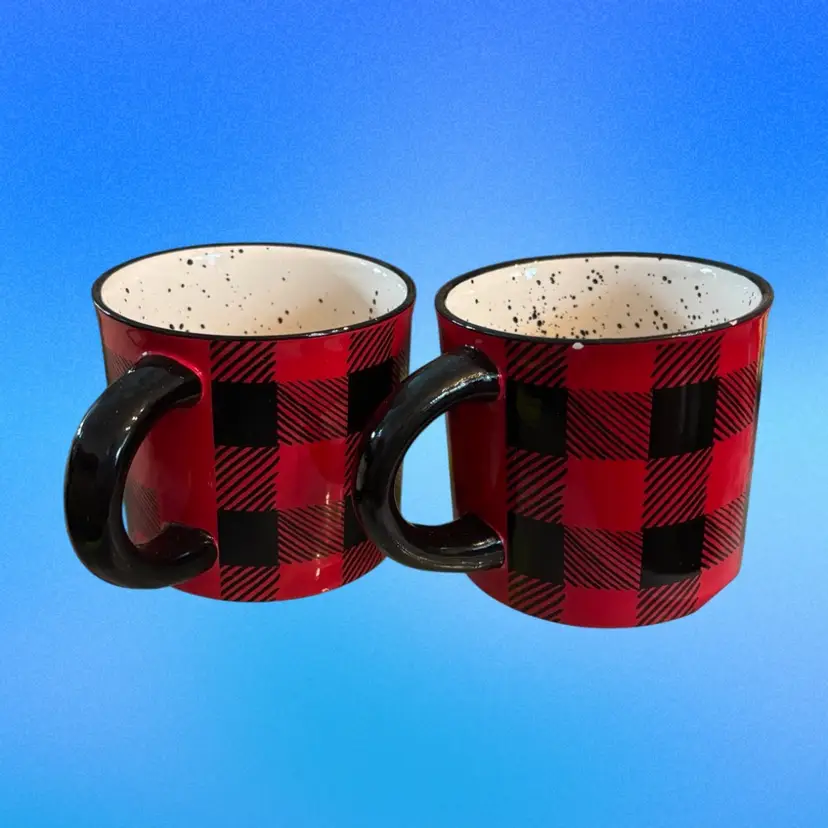 Add a touch of rustic cabin style to your kitchen with this set of two ceramic buffalo plaid mugs. Featuring a bold red and black check pattern with a speckled enamel-look interior, these mugs are perfect for coffee, cocoa, or tea during the holidays and all winter long. Dishwasher and microwave safe. Distributed by DCI Accessories. • Set of 2 mugs • Ceramic with black speckled interior • Buffalo plaid red & black pattern • Holds approx. 12–14 oz • Dishwasher & microwave safe