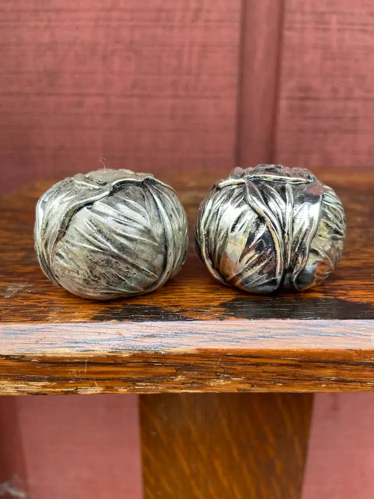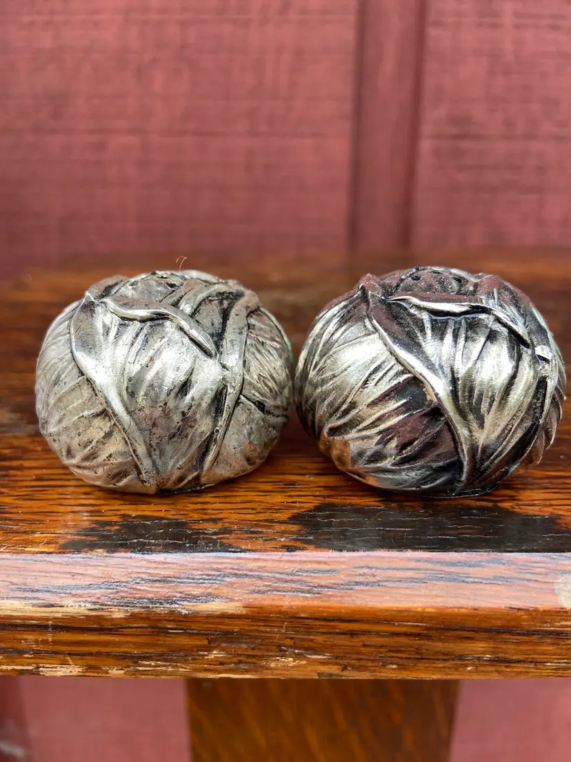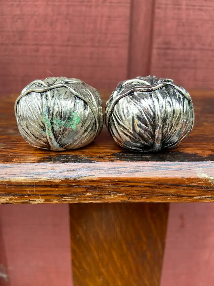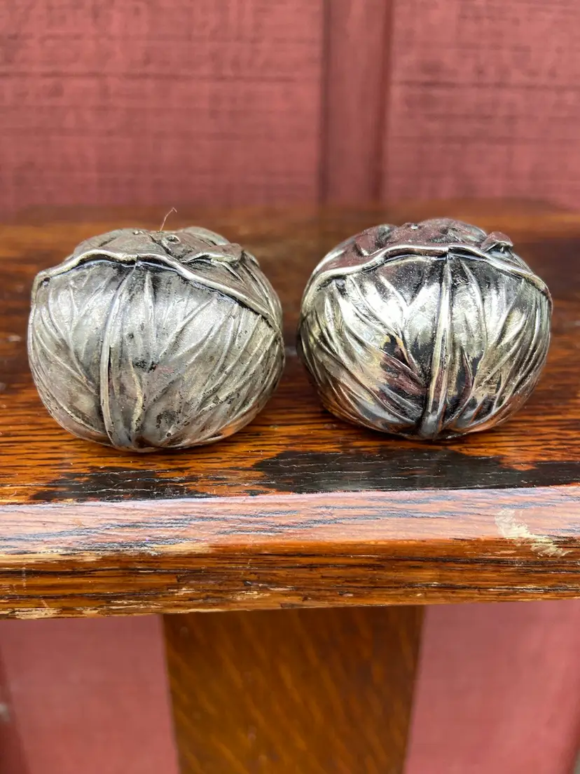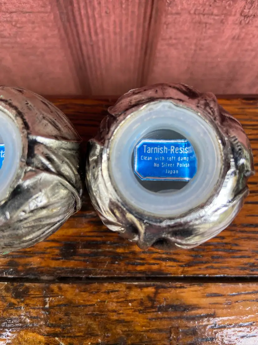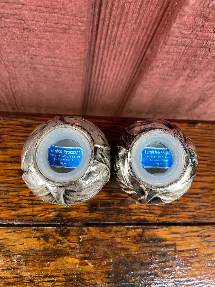 Approx 2 inch diameter x 1.5h. Good used condition. Each shaker has five holes. One shaker appears to have a spot of tarnish.