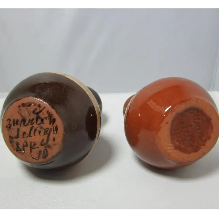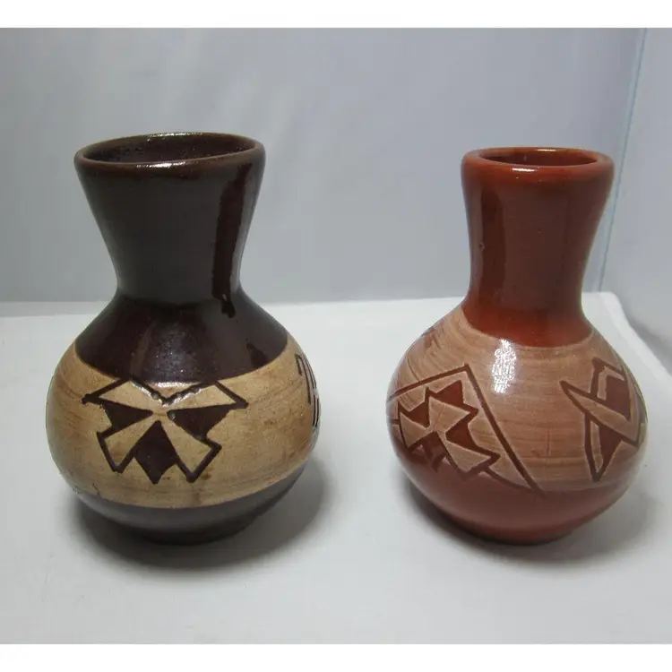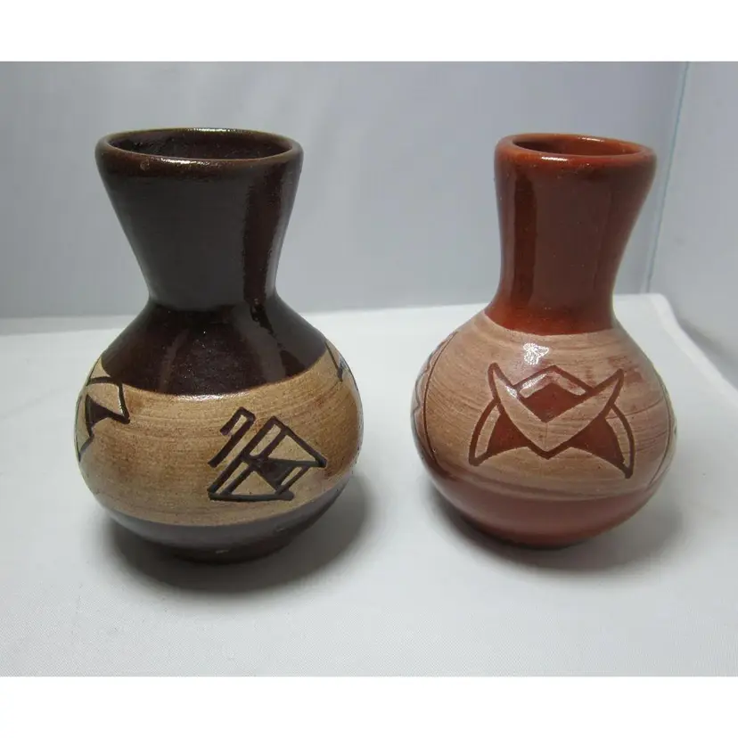 Set of 2 Sioux South Dakota red clay vases signed Marion Selwyn. Each vase measures about 3" x 3" x 4 1/2" tall. They both are slightly difference in color and designs. It does come with the original paperwork from the Pottery explaining the pieces.