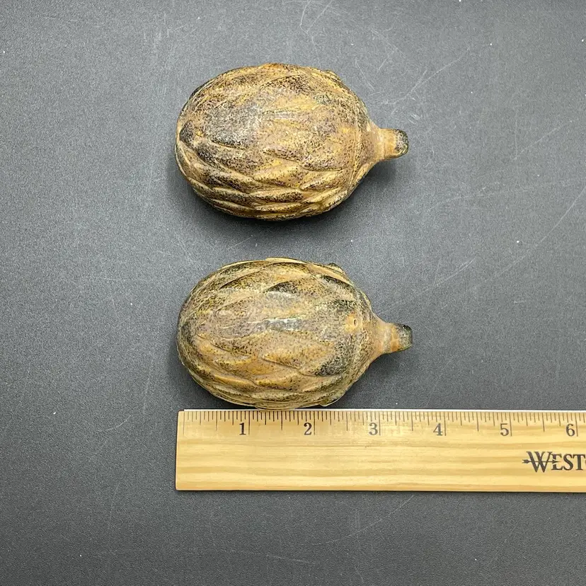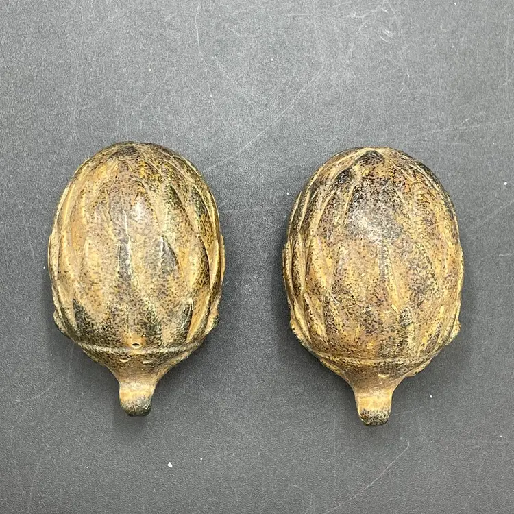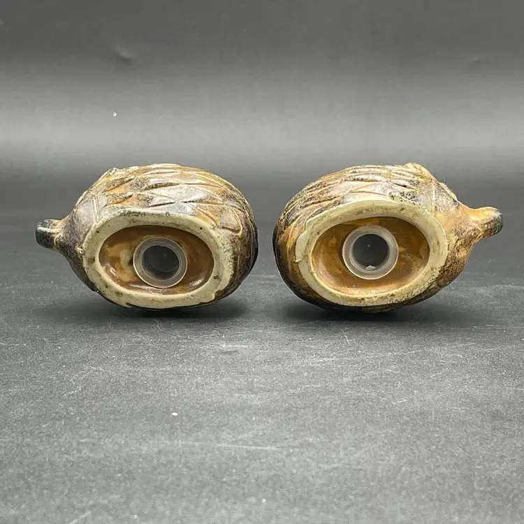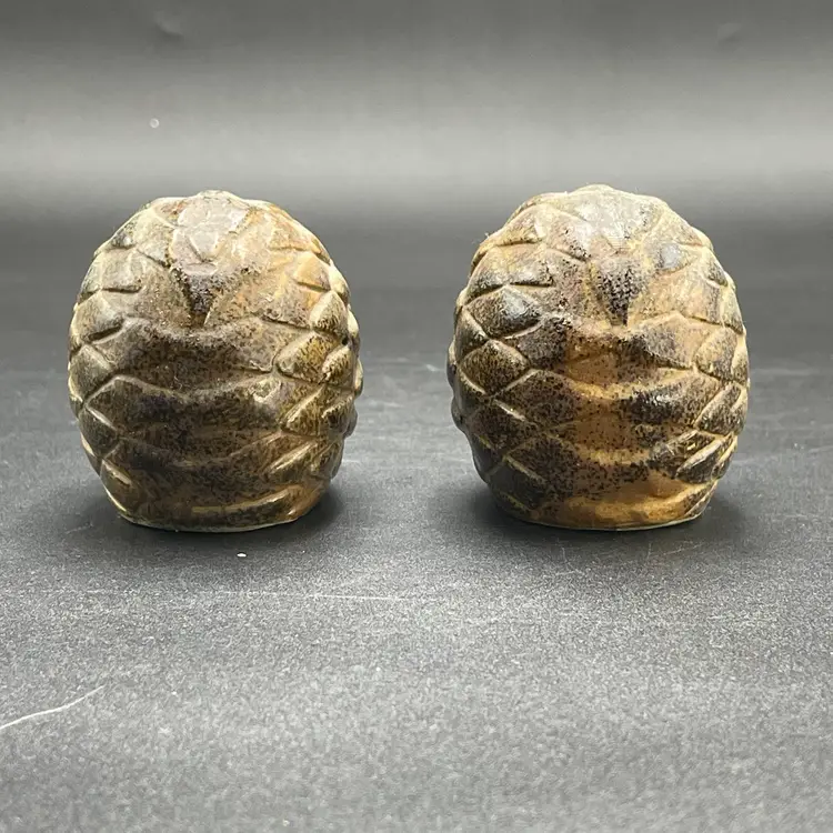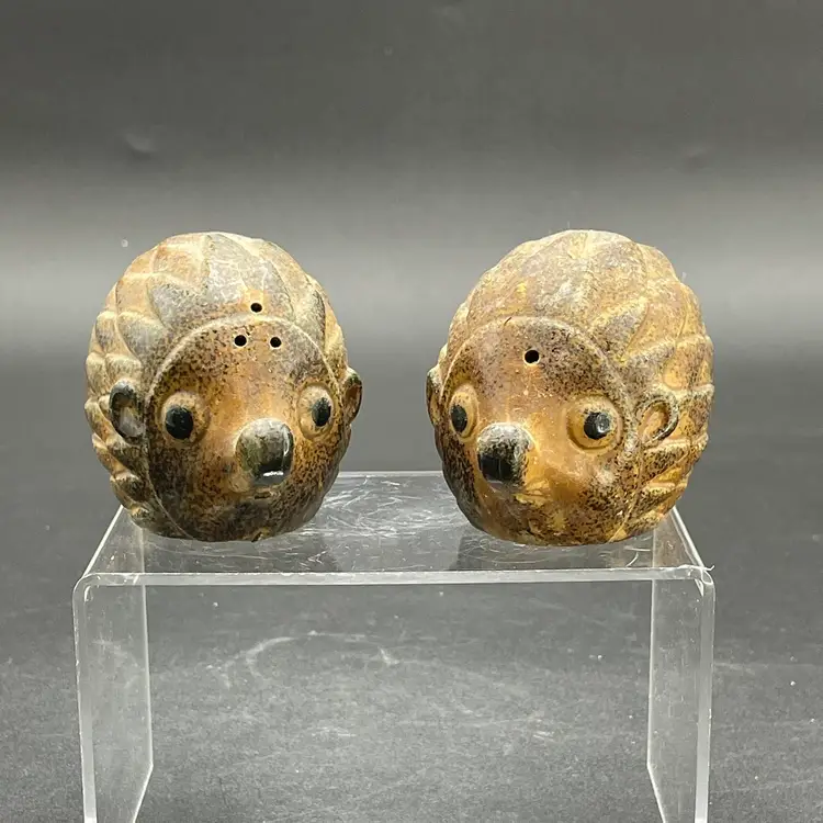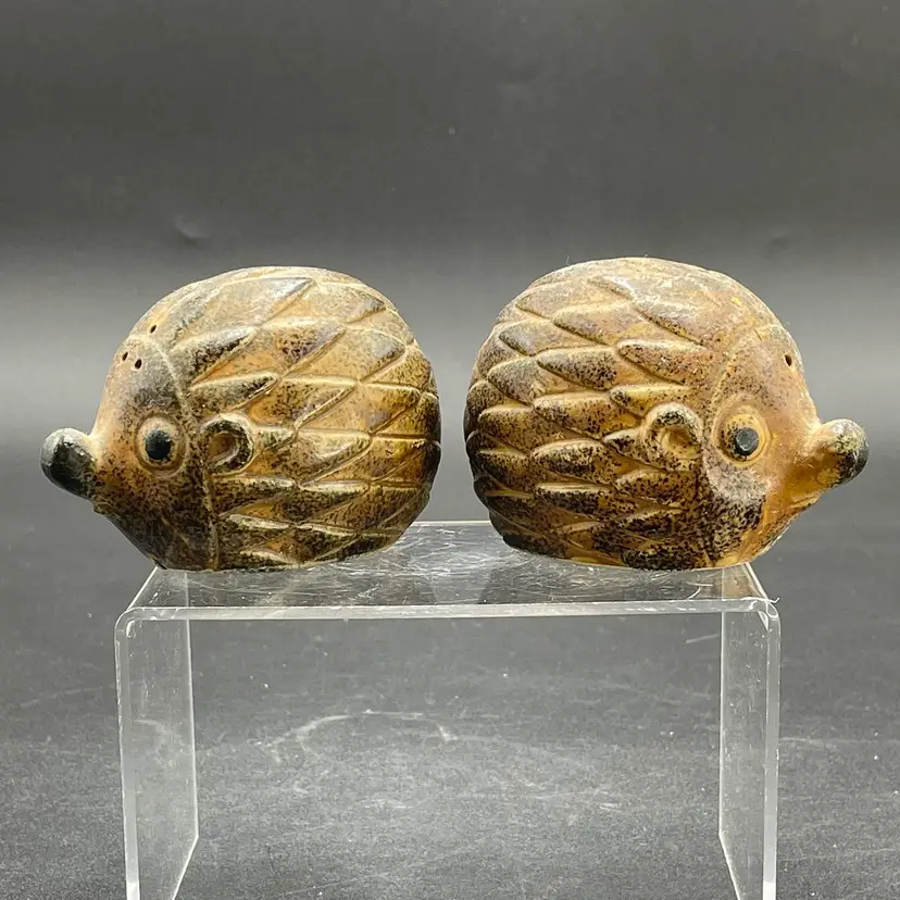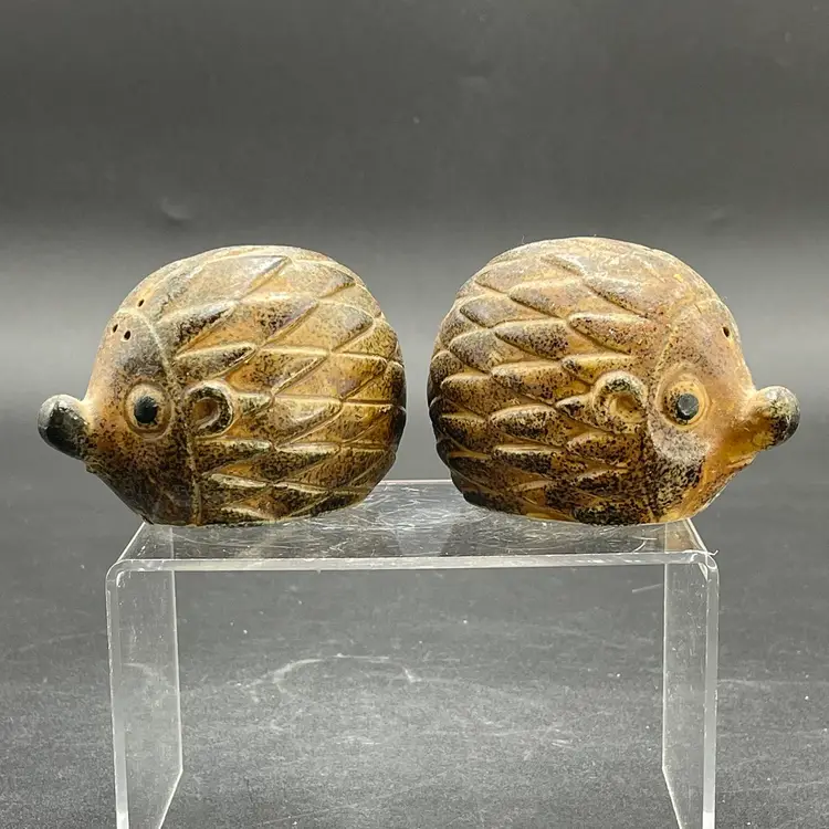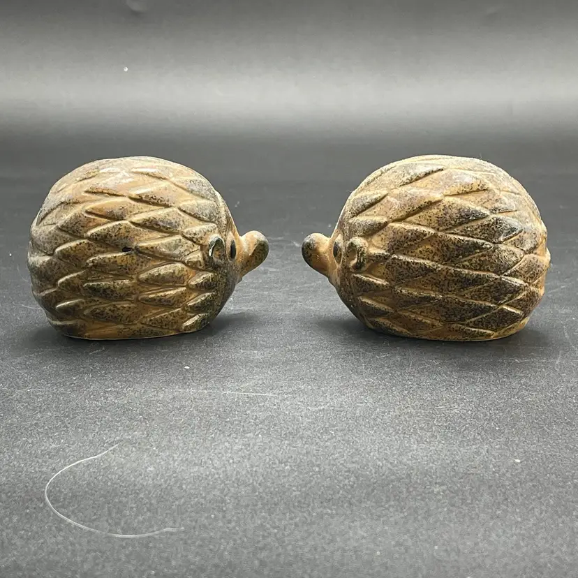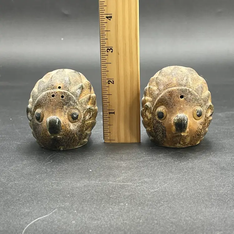 This is a set of 2 vintage stoneware hedgehog shaped salt and pepper shakers. Each measure approximately 2.25" tall x 3.5" long. No chips or cracks.