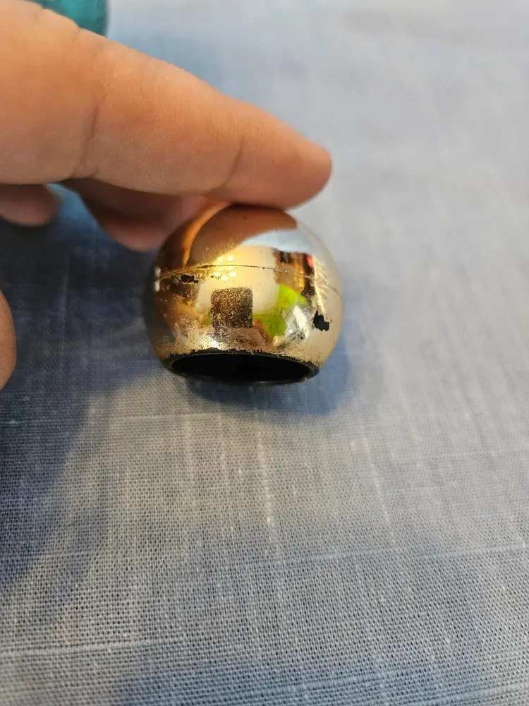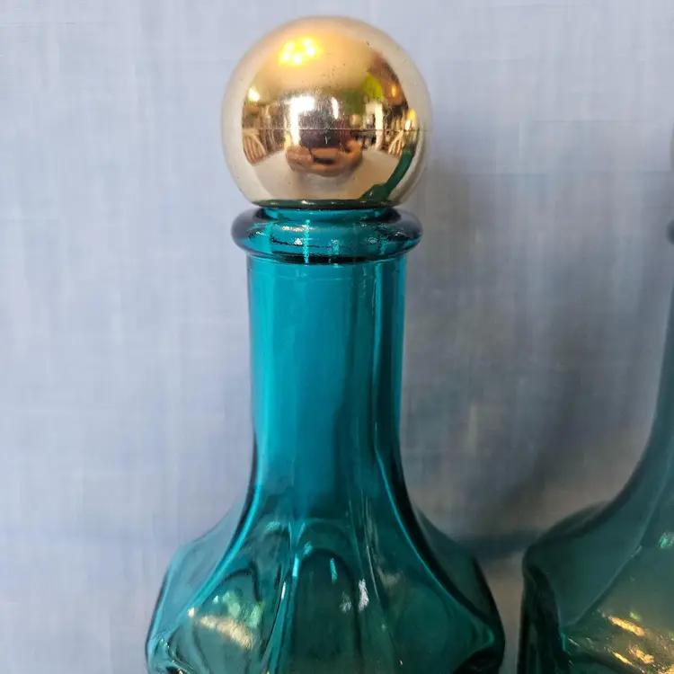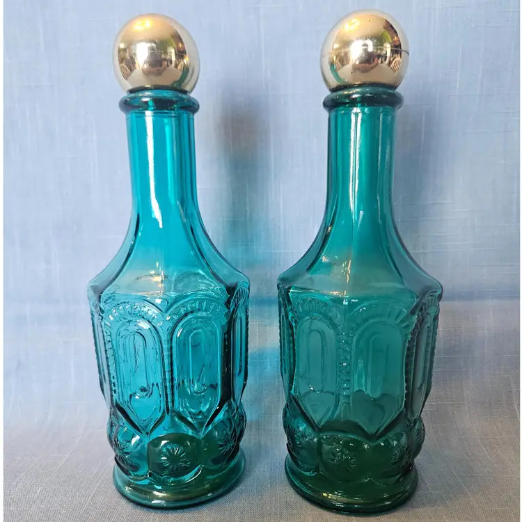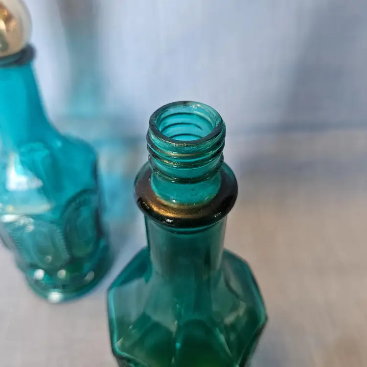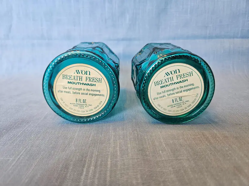Set Of 2 Avon Mouthwash Bottles in the stars and bars pattern, Teal colored. The one cap shows wear as shown in the third picture there are small spots of wear along the bottom half of it, but it does have a side that would look good on display. Both are empty and are the same color, lighting makes them look slightly different in the main picture.
