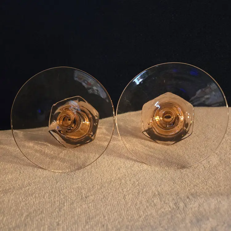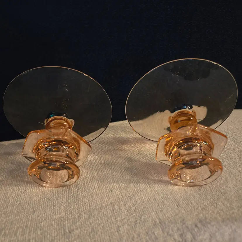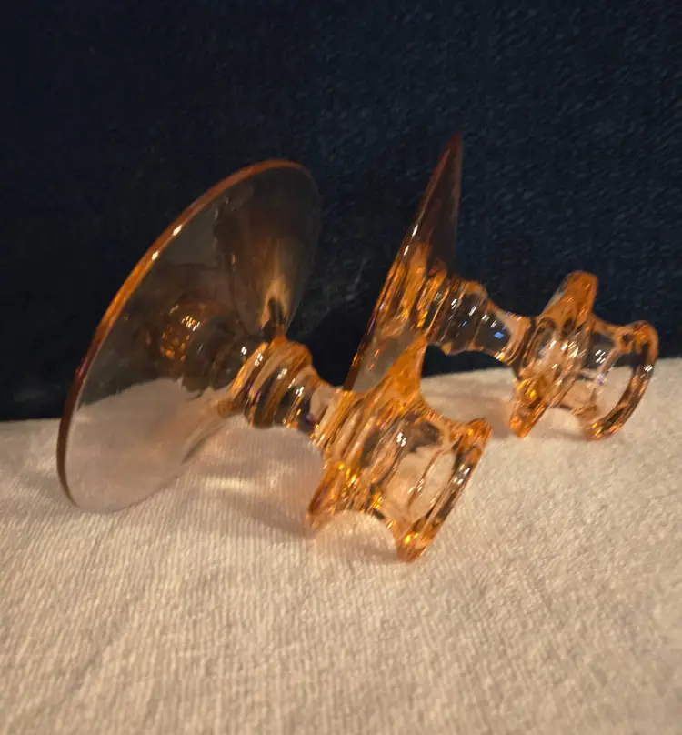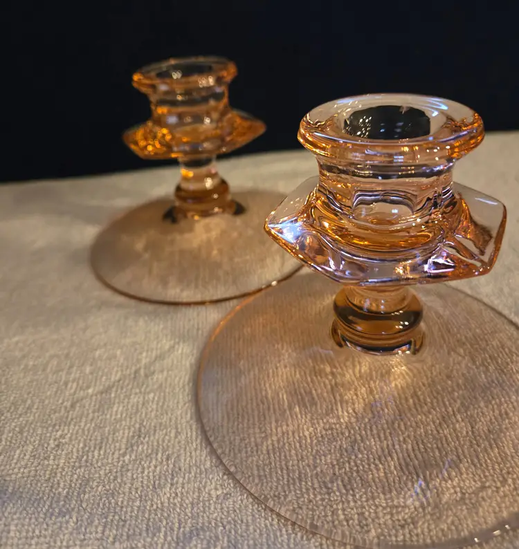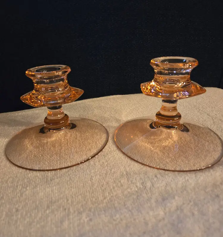 These are beautiful pink depression glass candle holders. They are in excellent condition. They look amber in the pictures but they are a pretty pink. Measures 3 3/4" tall and 4 1/2" at the base. No chips, cracks, or repairs.
