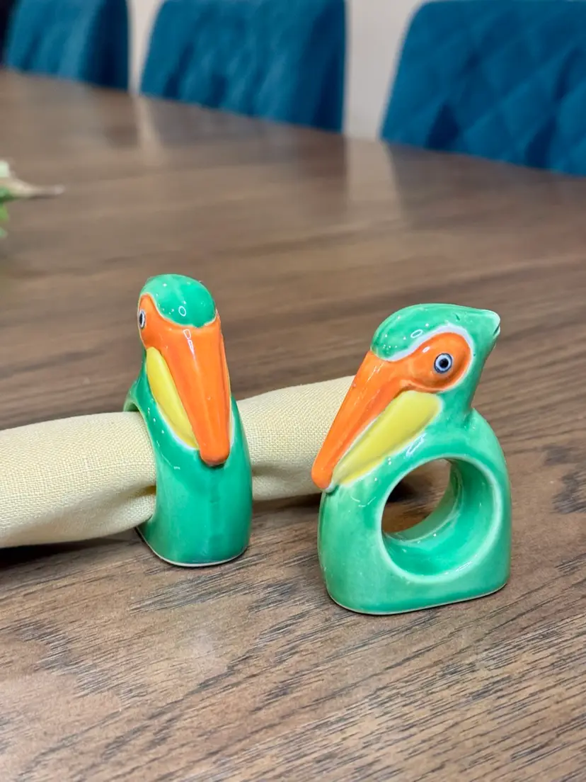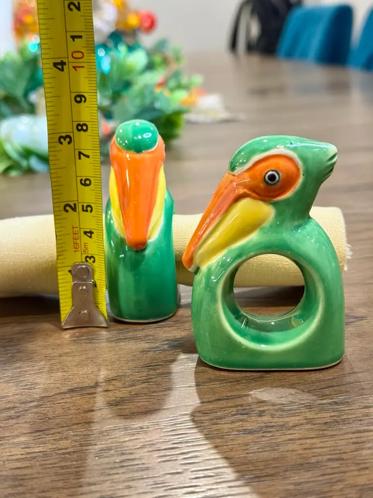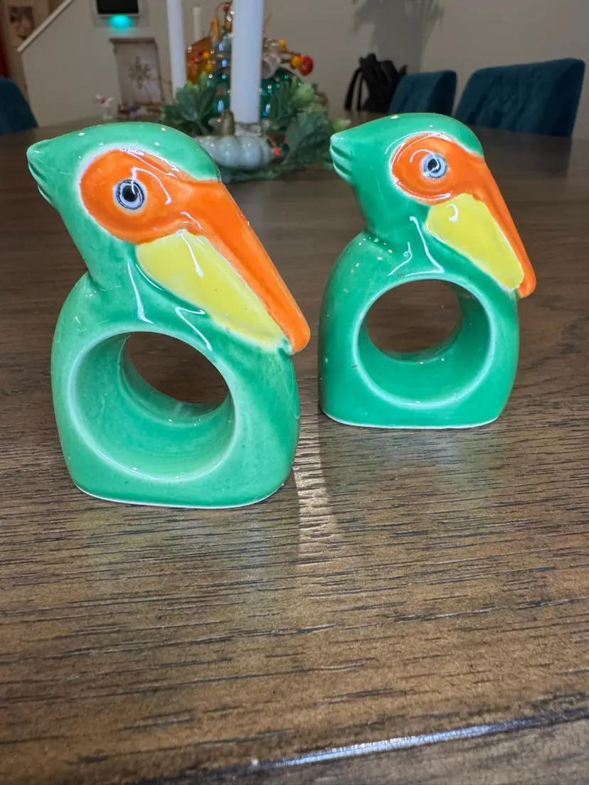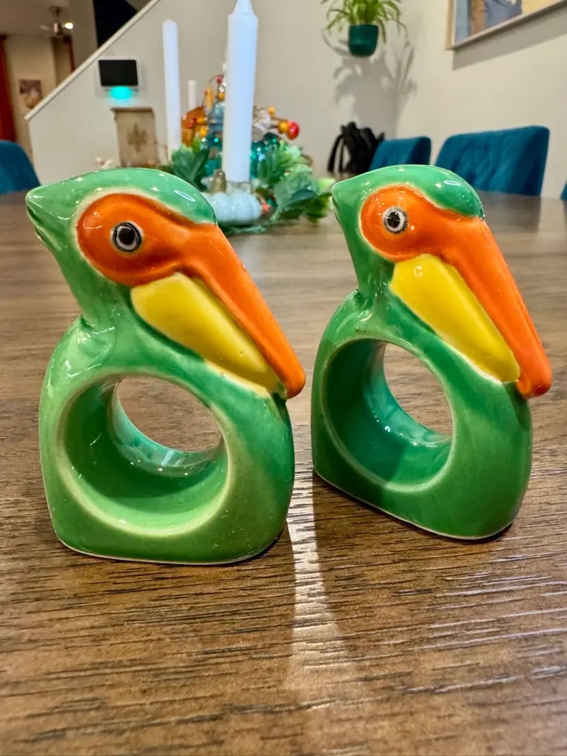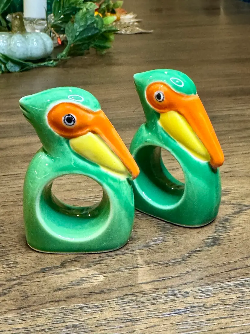 Set of 2 Vintage Art Deco Ceramic Napkin Rings: Green Tropical Bird, Made in Japan