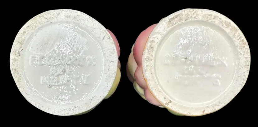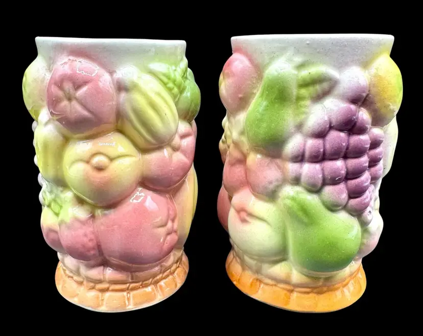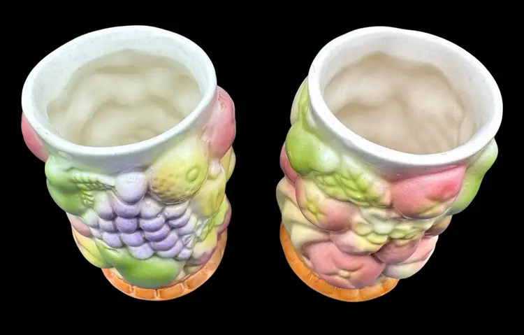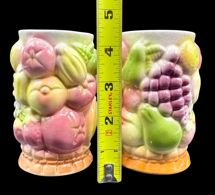 Two juice tumblers with 3D textured fruit pattern. They are made from thick ceramic.