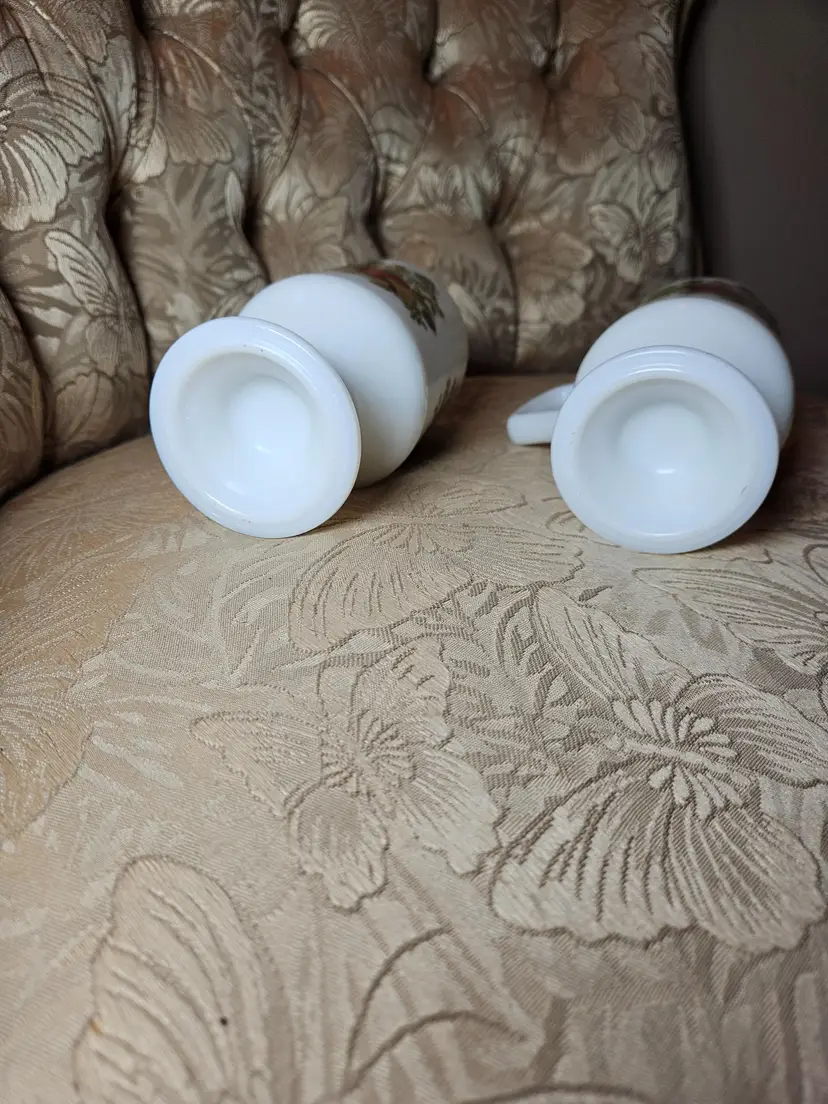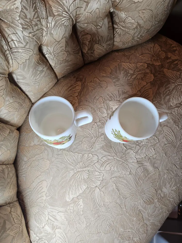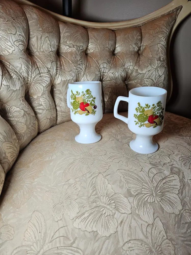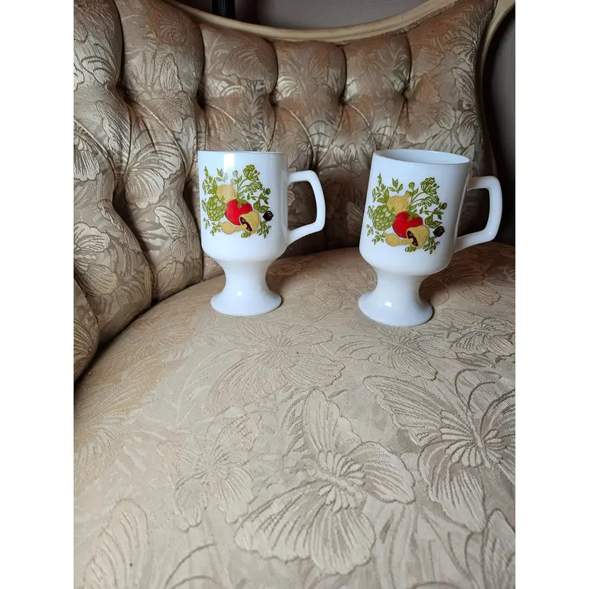 Set of two charming pedestal coffee mugs featuring CorningWare's spice of life pattern. Perfect for a cozy beverage or adding a retro touch to your kitchen. Each mug measures approximately 5.5 inches tall. In excellent condition with no chips or cracks.