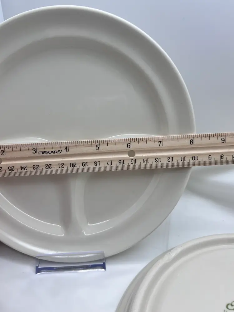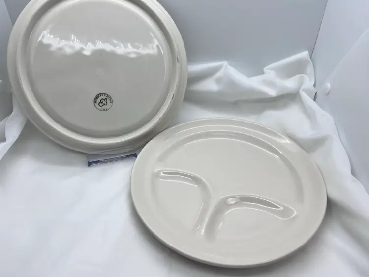 Set of 2 Vintage Morco China stoneware divided restaurant dinner plates. The plates have a beautiful cream-colored glaze and are divided into three sections for the typical plate lunch - entree and two sides. Nice heavy-duty plates. Each plate is 8" in diameter. Plates are in exceptional condition. Each is marked with a different version of the 'Morco China M' logo, one is marked 2/86 and one is 381