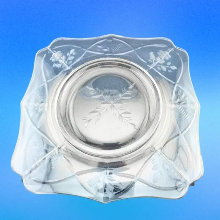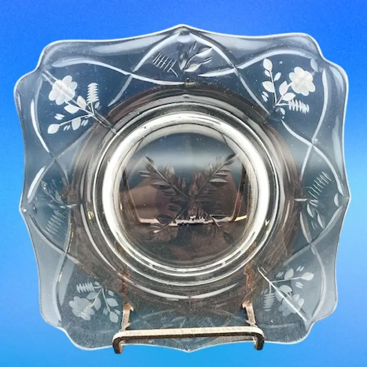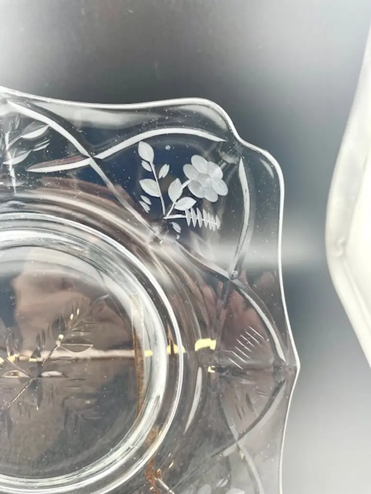 Set of 2 luncheon plates that look to be Rocke Sharpe but could be Libby. They each measure 7" x 7". There are no chips or cracks; however, there are small scuffs and one wiggly scratch on one.