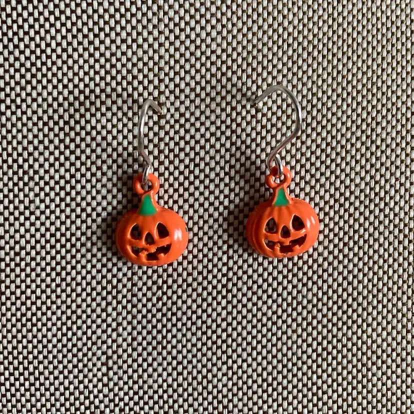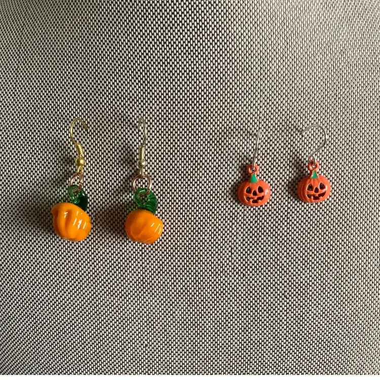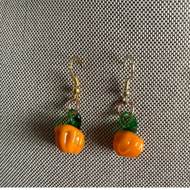 Set of 2 vintage Halloween pumpkin earrings. One set are miniature metal charm earrings that neasure 1/3” x 3/4” and the other is a handcrafted glass pumpkin. They measure 5/8” x 1 1/2” down. You will getboth sets.