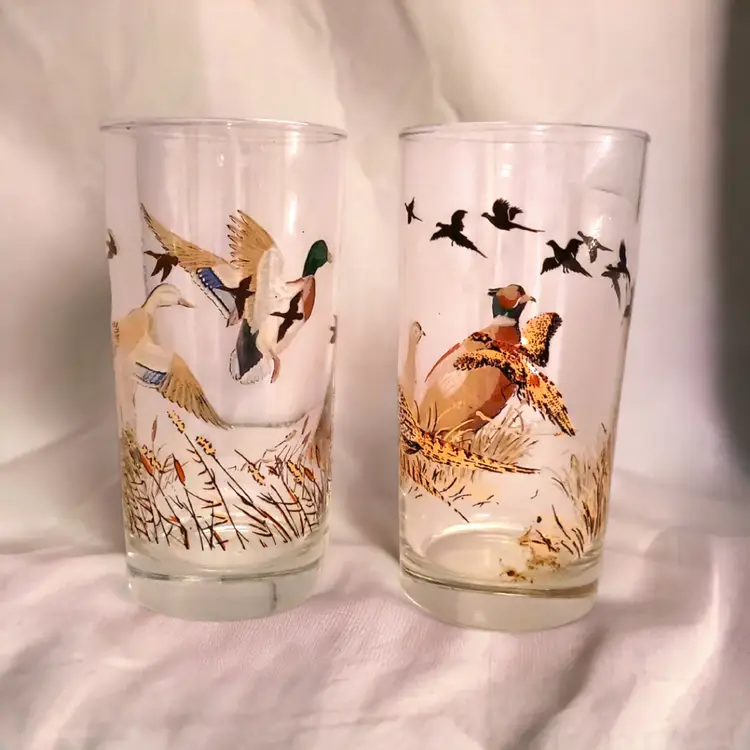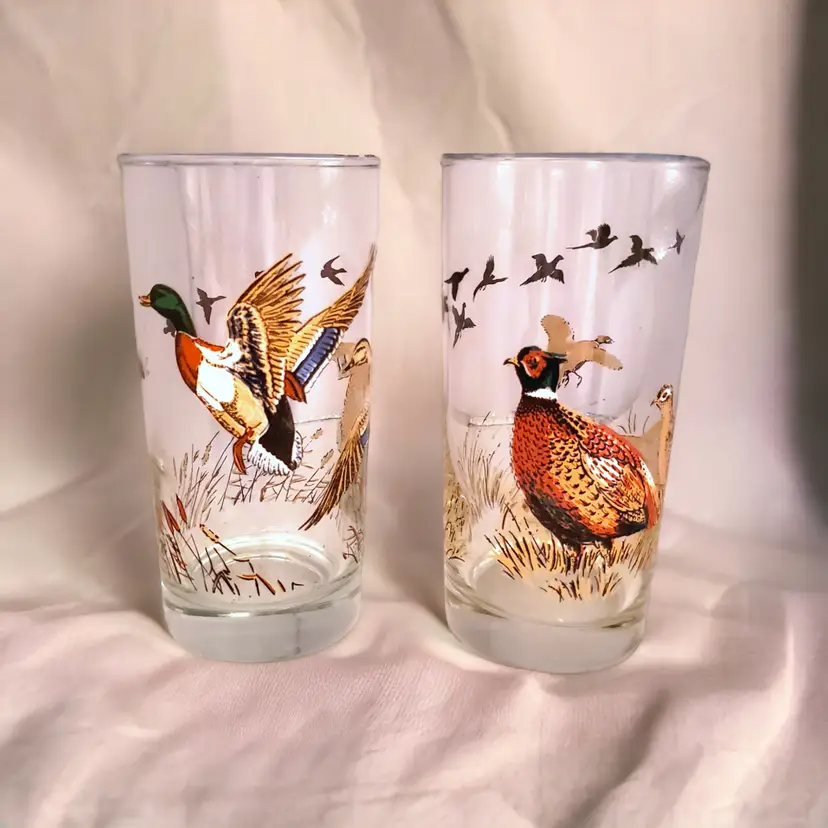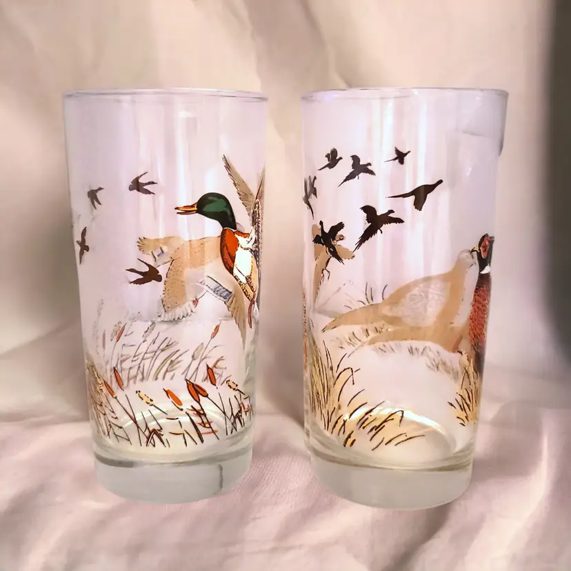 Pair of Pheasant High Ball Drinking Glasses made by Libbey as a part of the Outdoor Life collection. The glasses are in very good vintage condition, with no chips or cracks. Very small scratches on the bottom of the outside of the glass. They measure approximately 6" high x 2.5" diameter.