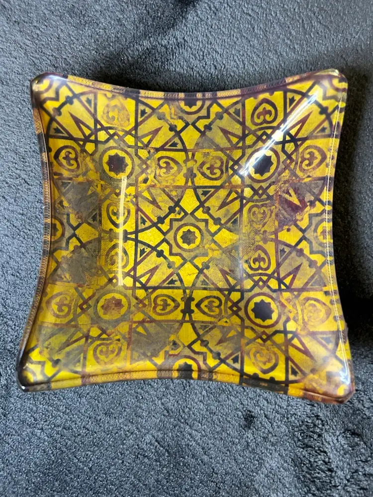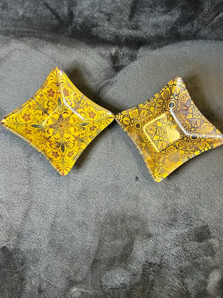 This set includes 2 vintage Prima design glass trinket dishes. Made of glass, they feature a geometric pattern and a multi-color design. Perfect for storing small items or adding a decorative touch to any space 4.5”x4.5”x1”