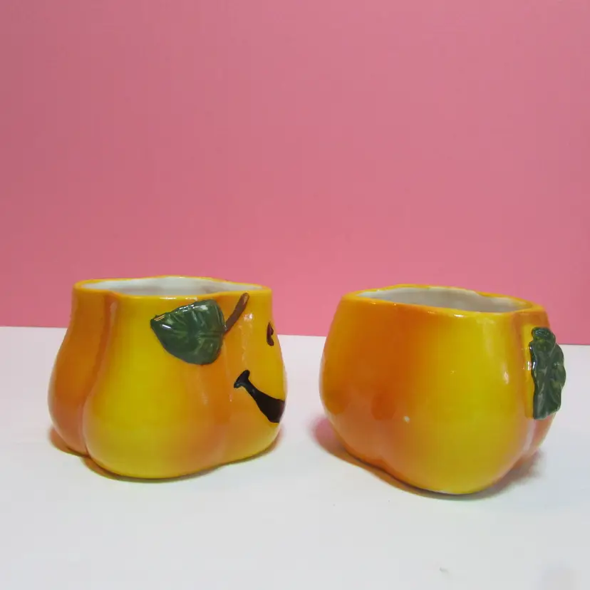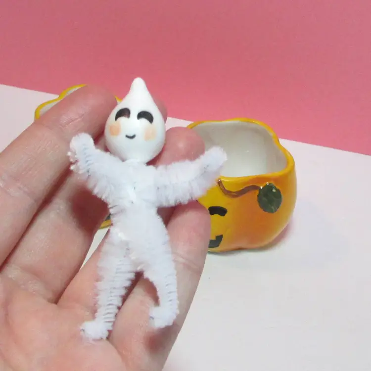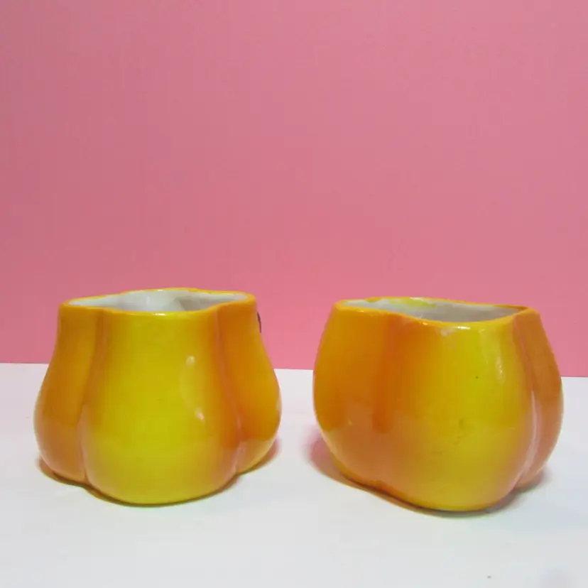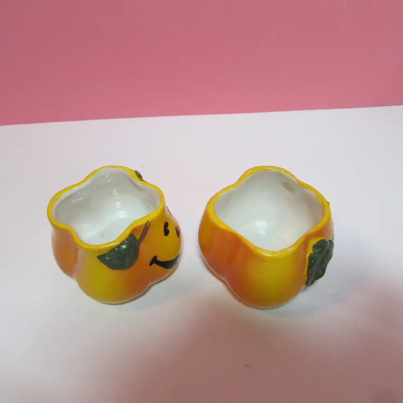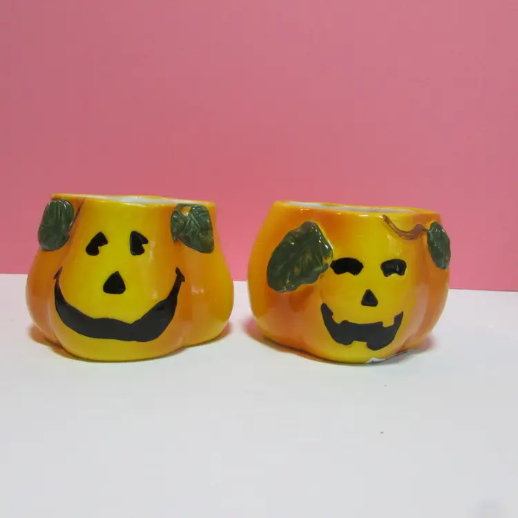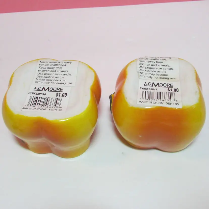 These cute little pumpkins would make cute treat holders, I added 2 little pipe cleaner Halloween cat and ghost buddies I crafted. Each candle holder is about 2" x 3" x 2 1/2". This is shipped from a smoke free home. Thanks for looking!