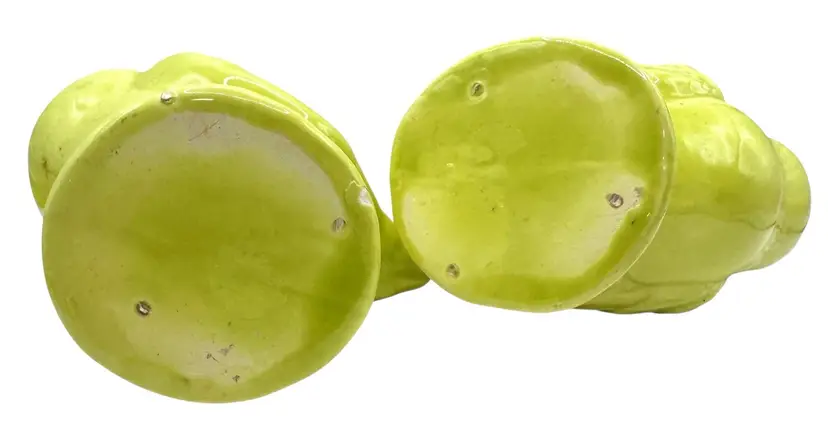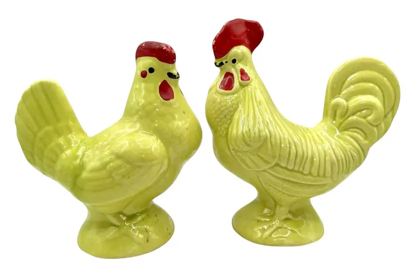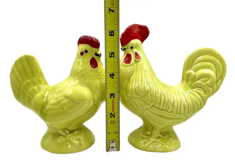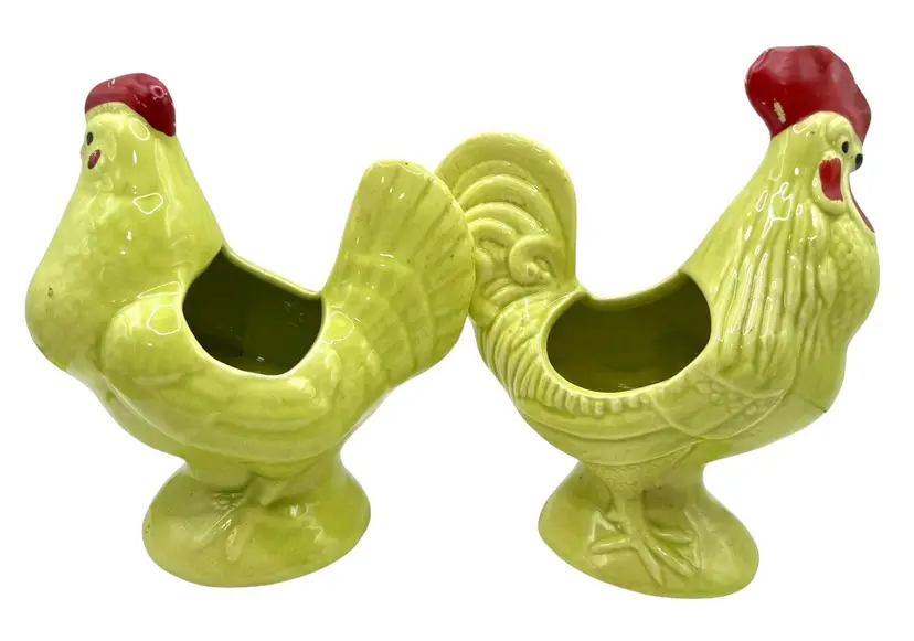 Set of rooster planters perfect for a farmhouse style kitchen! They are a very vibrant green, leaning towards yellow. Their faces have been painted on top of the glaze.