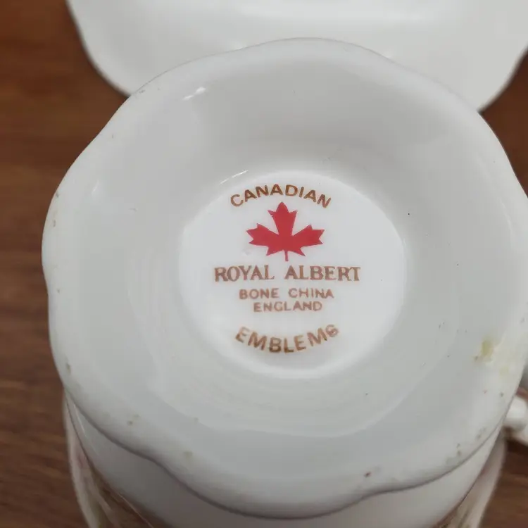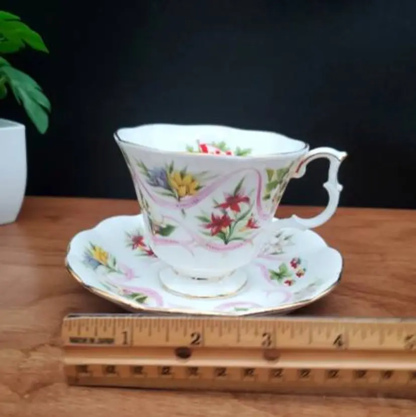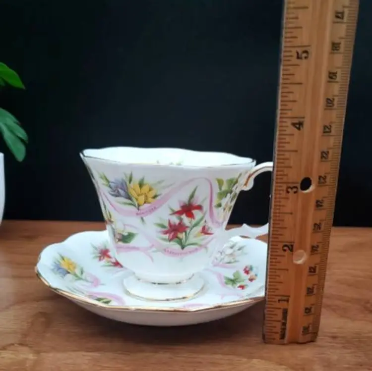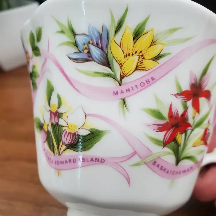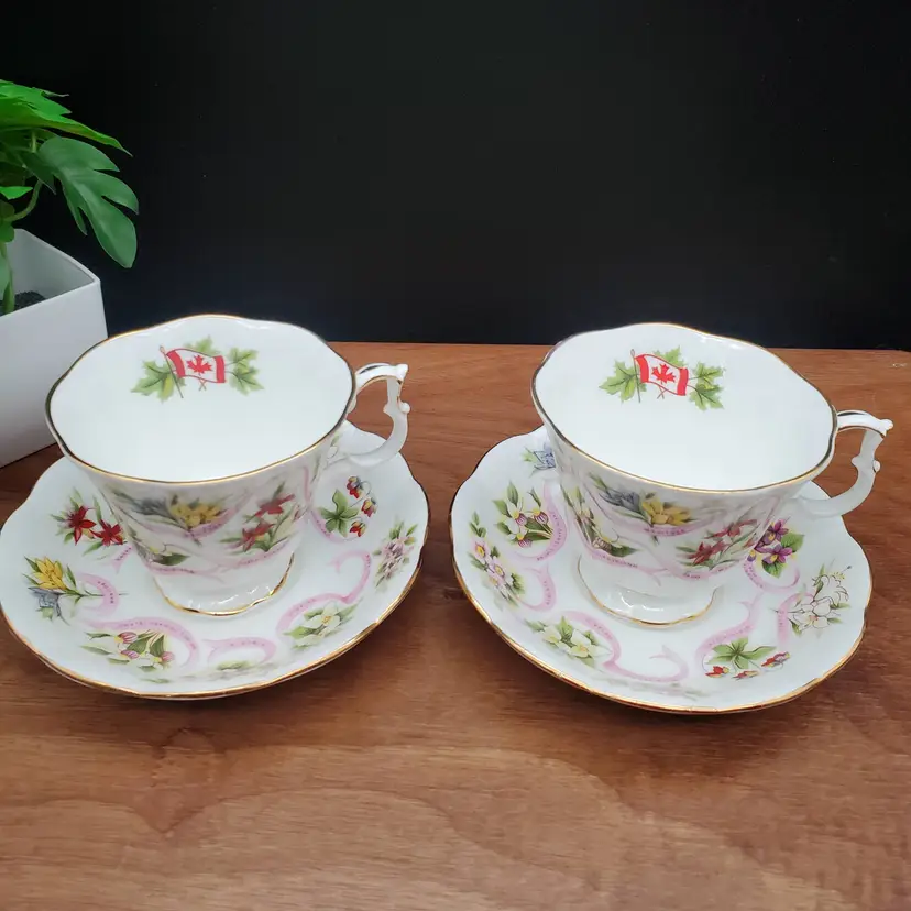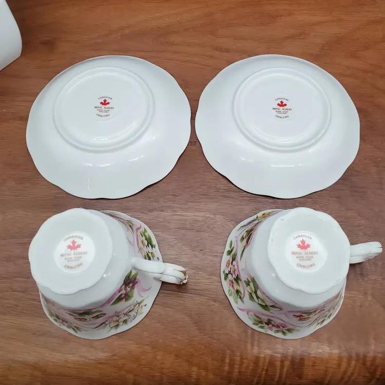 -Gently used condition with no chips or cracks. No crazing. -4 piece set includes two teacups and two saucers. -Holds about 4 ounces.