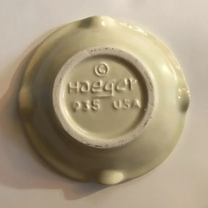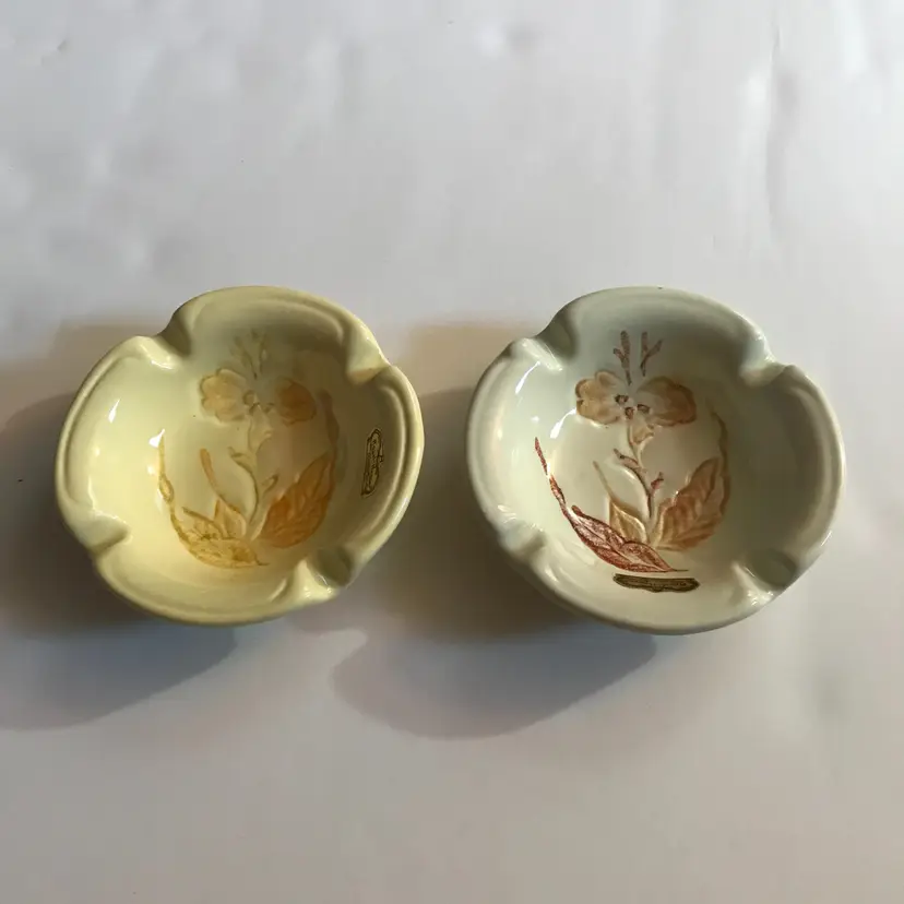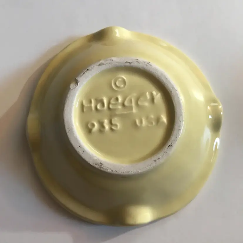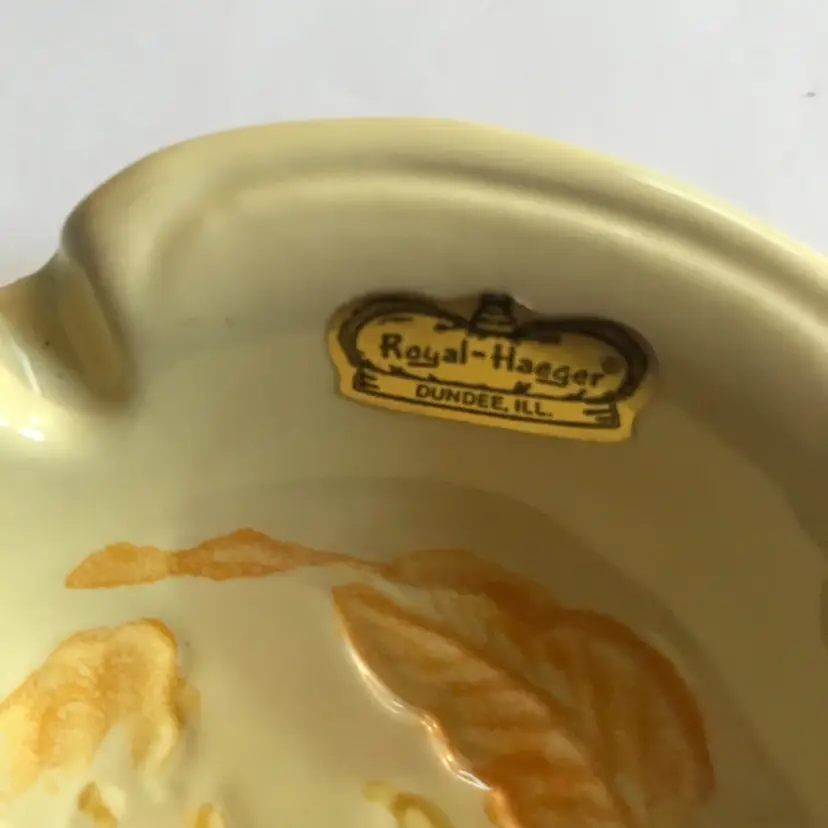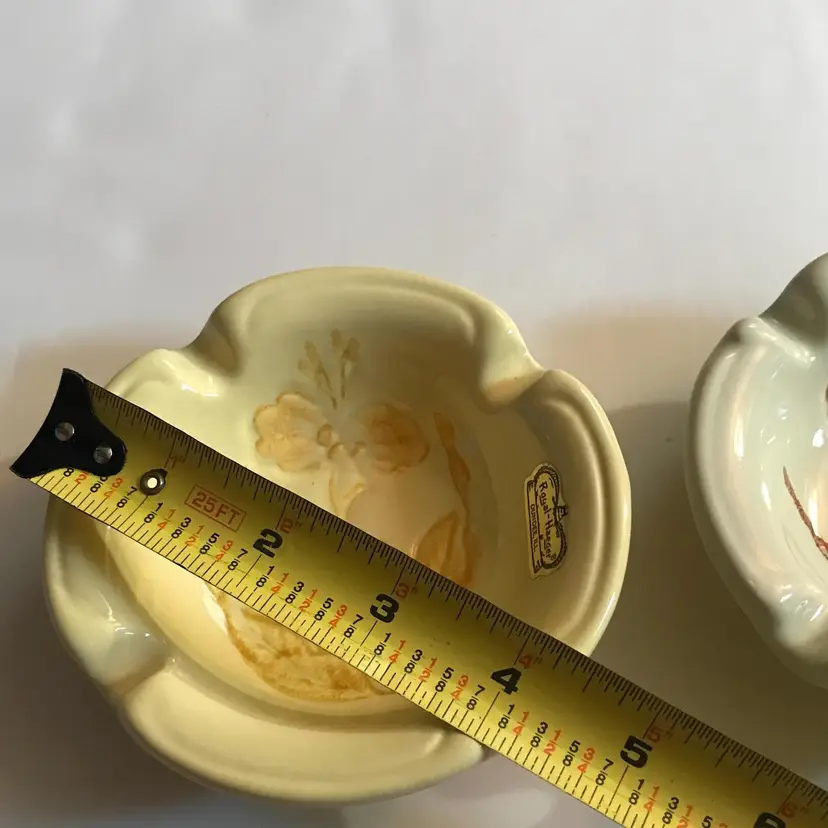 This is for a set of 2 ashtrays by Royal Haeger (#935). They have the same design but the color isn't exactly the same. One is more yellow than the other. The yellower one has a nick on the bottom. The other one has little bumps under the lip but that looks like it happened in the making of it. They are 4 1/2 inches in diameter. See photos.
