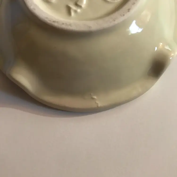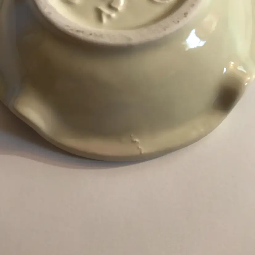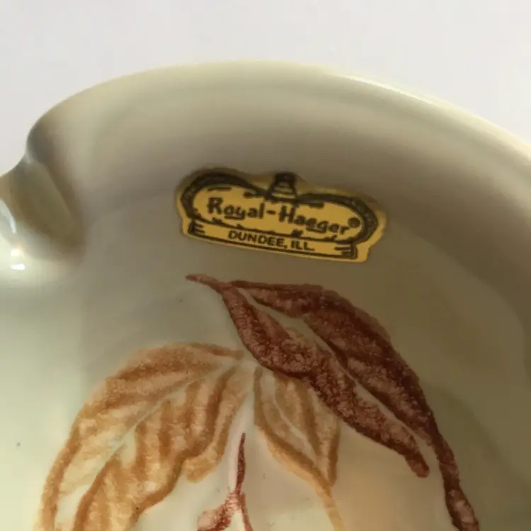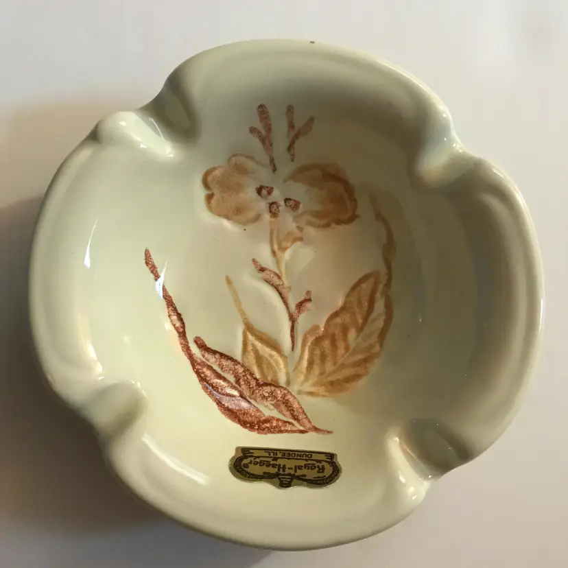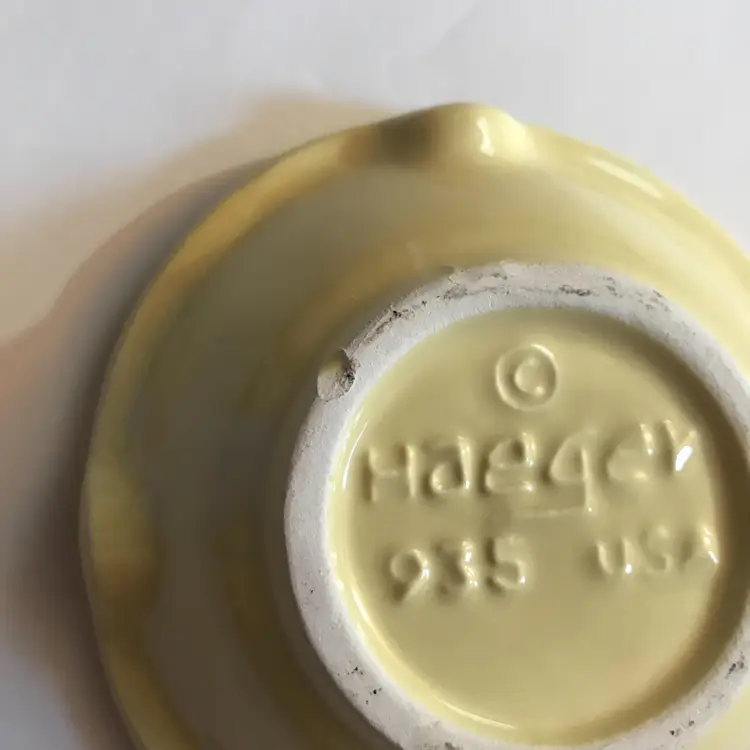 This is for a set of 2 ashtrays by Royal Haeger (#935). They have the same design but the color isn't exactly the same. One is more yellow than the other. The yellower one has a nick on the bottom. The other one has little bumps under the lip but that looks like it happened in the making of it. They are 4 1/2 inches in diameter. See photos.