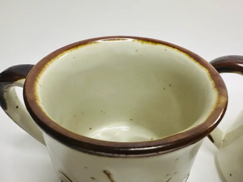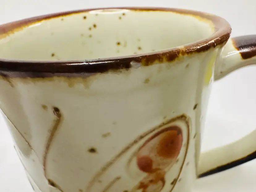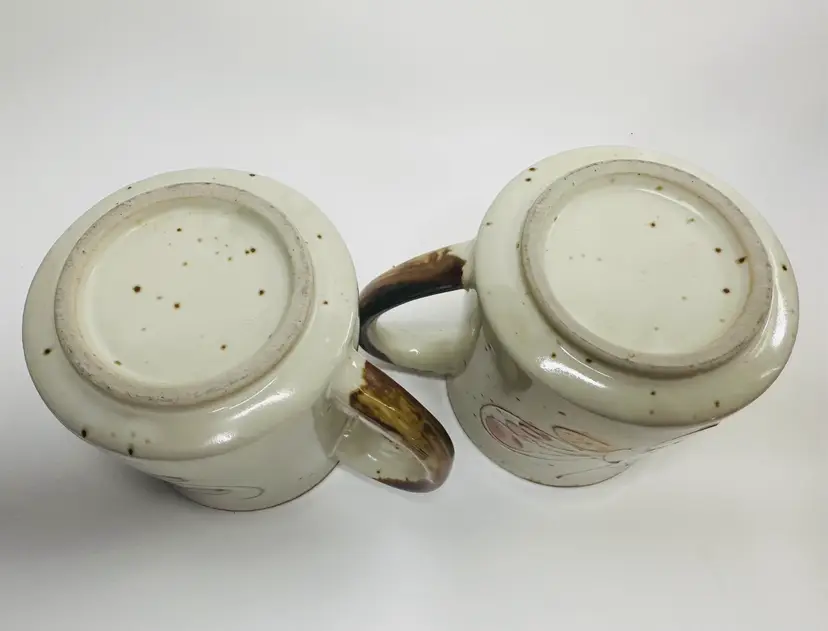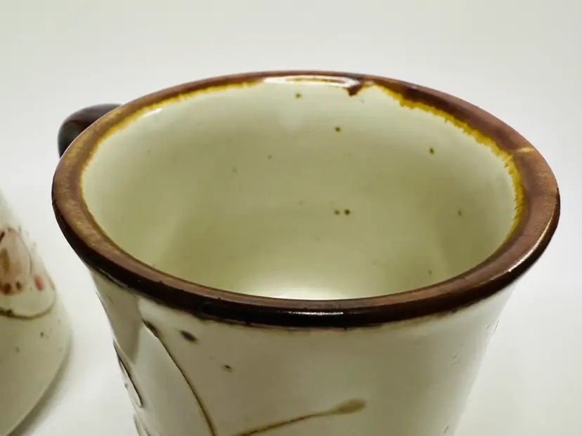Two speckled glaze mugs with retro butterfly design. 3.5 inches tall and 3.25 inches wide. One small flea bite, not sharp, on one rim,see pics for details.