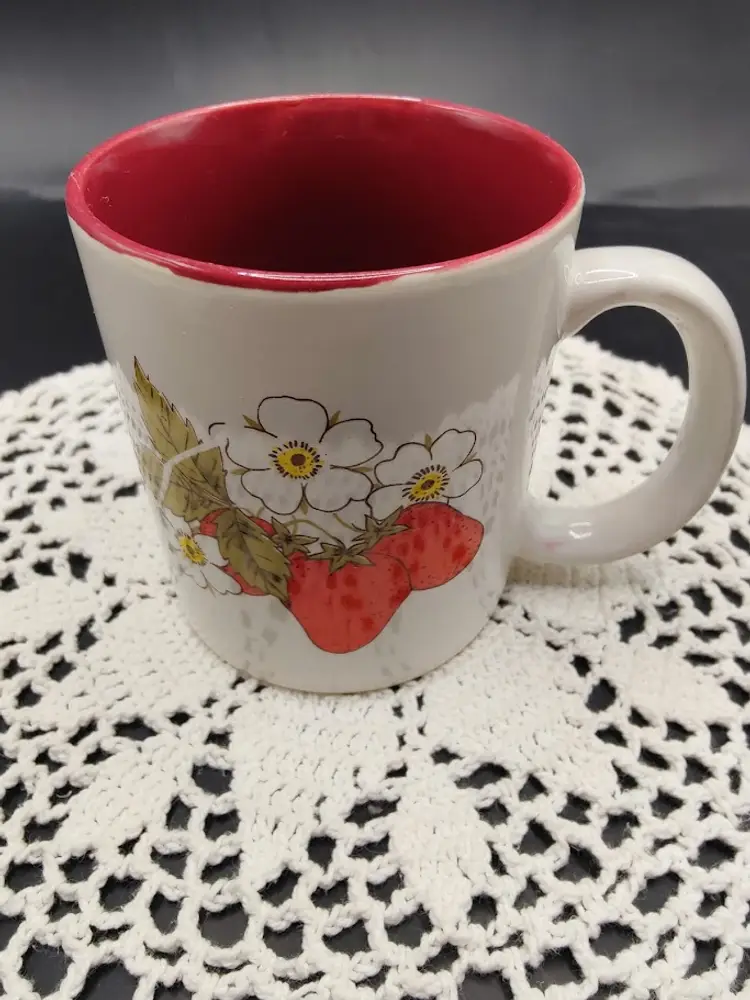 Super cute set of 2 strawberry print mugs. Manufacturer unknown. In great condition, no chips or cracks. Some light crazing from age