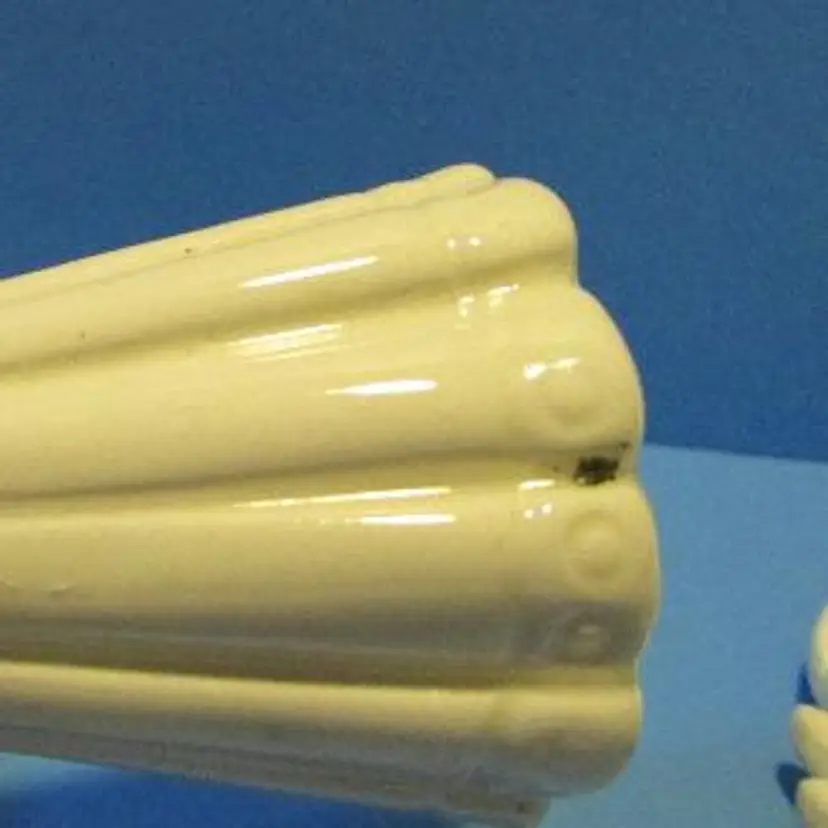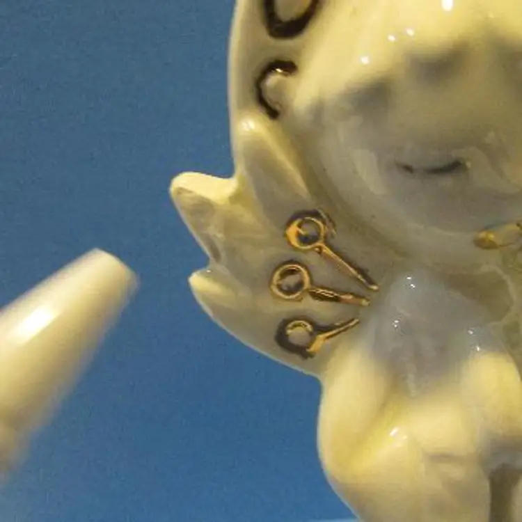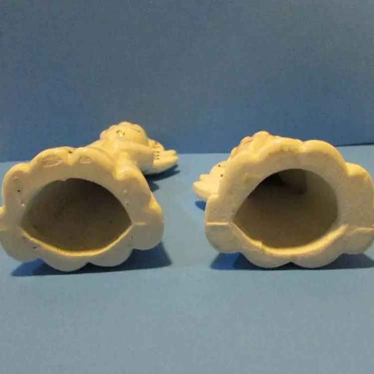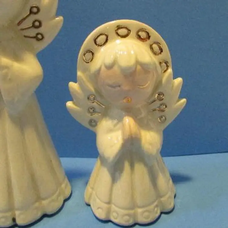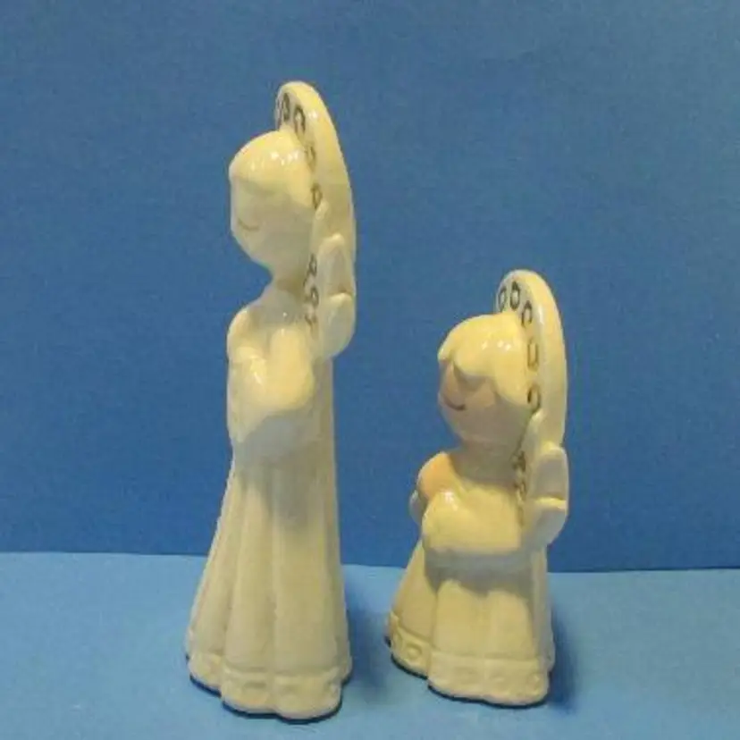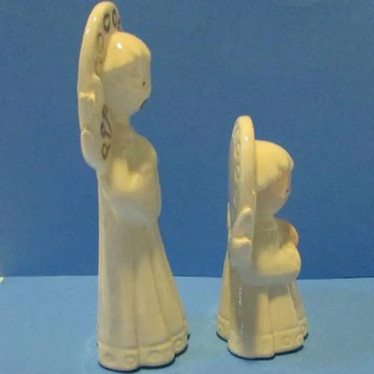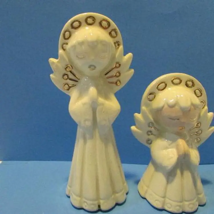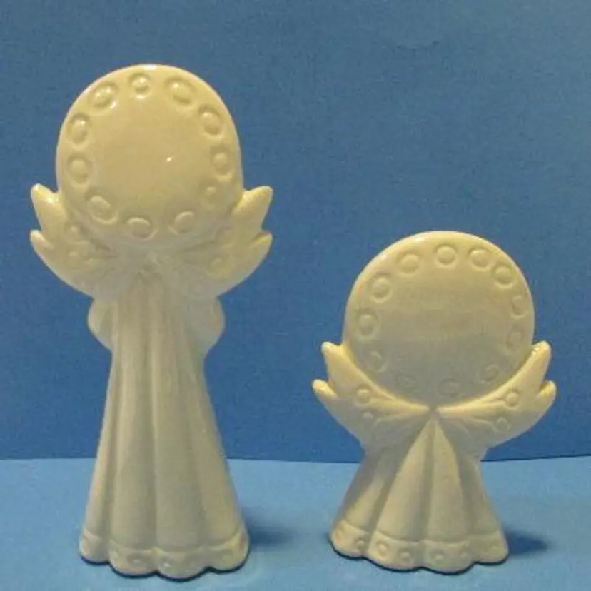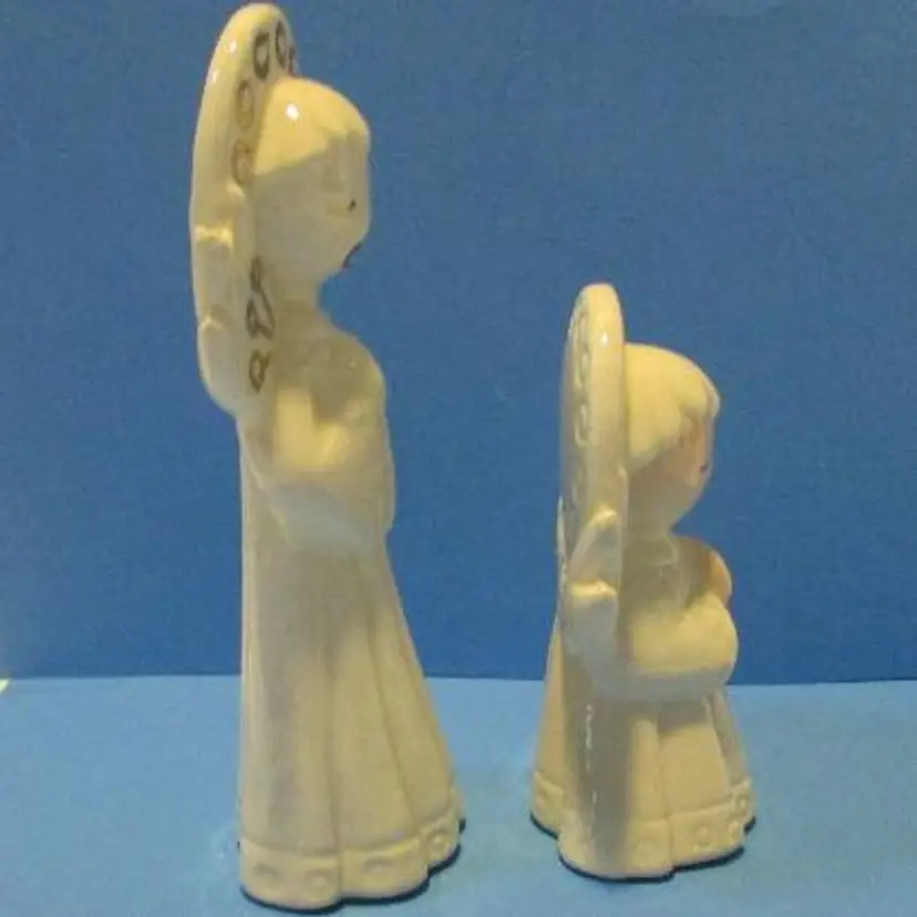 This is a nice set, the one figure has some wear there is a glaze skip and a black mark on the bottom of the robe. The small one has a peach tone for face and hands, the larger one is just white. The smaller angel is about 3 1/4" x 2" x 1 1/2" and the larger one is about 4 3/4' x 1 1 /2" x 2". This is shipped from a smoke free home. Thanks for looking! locub18