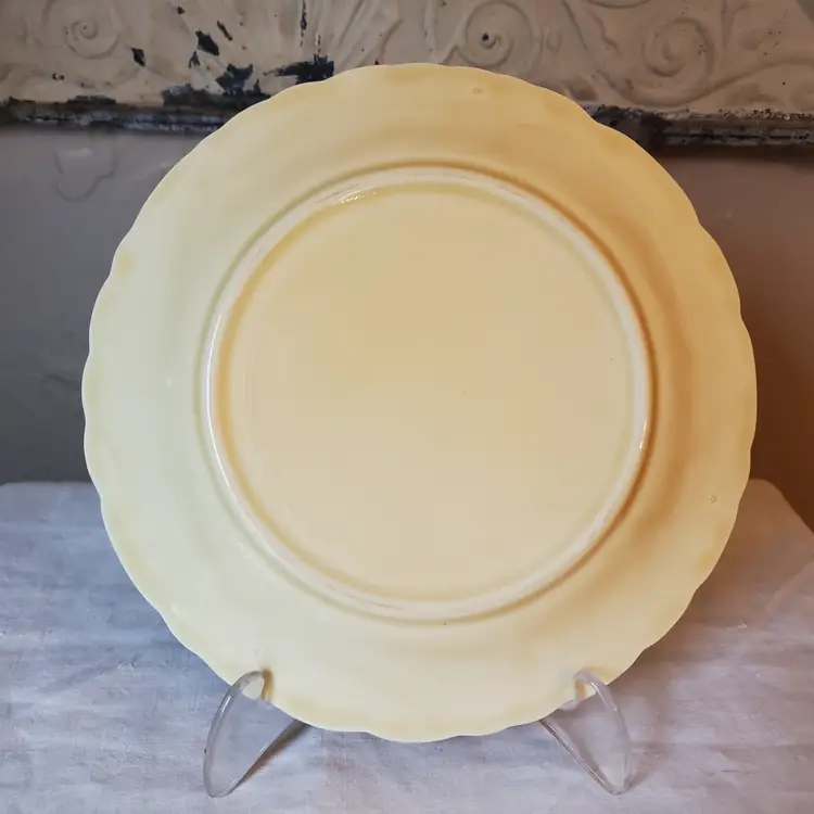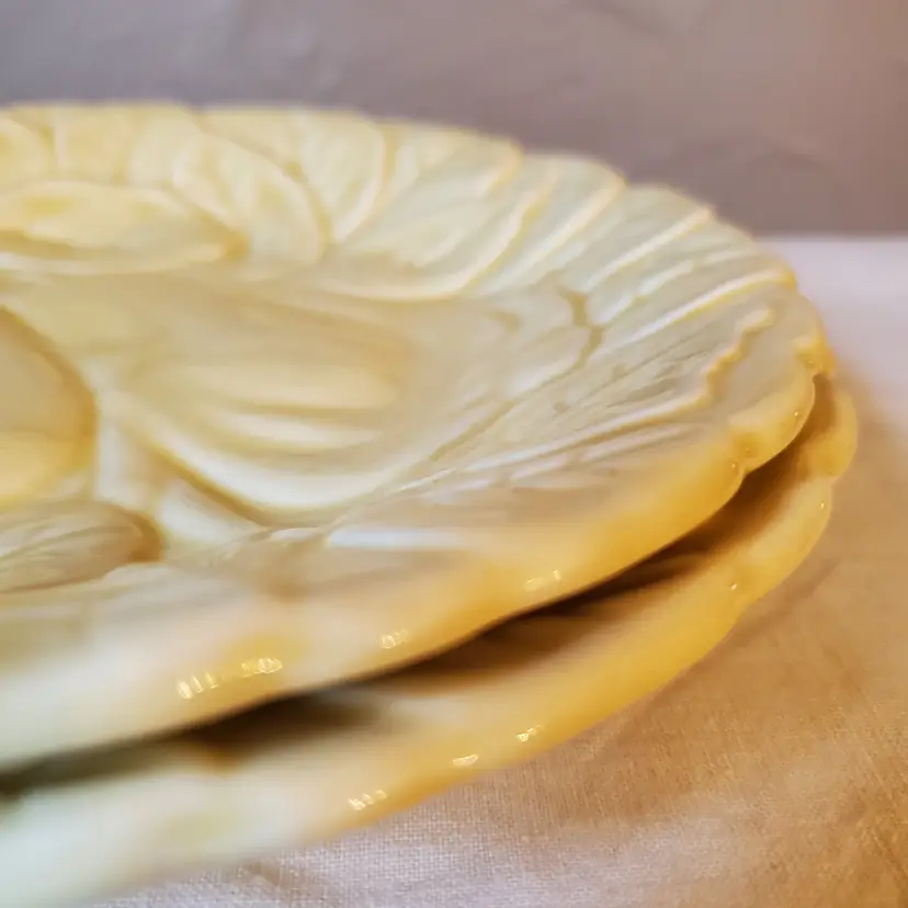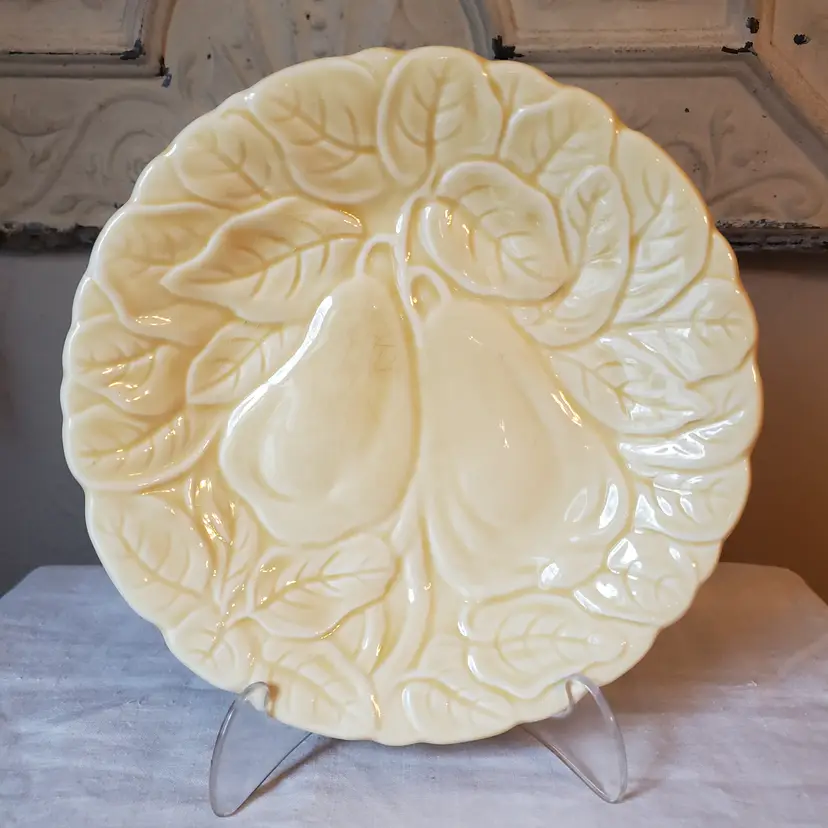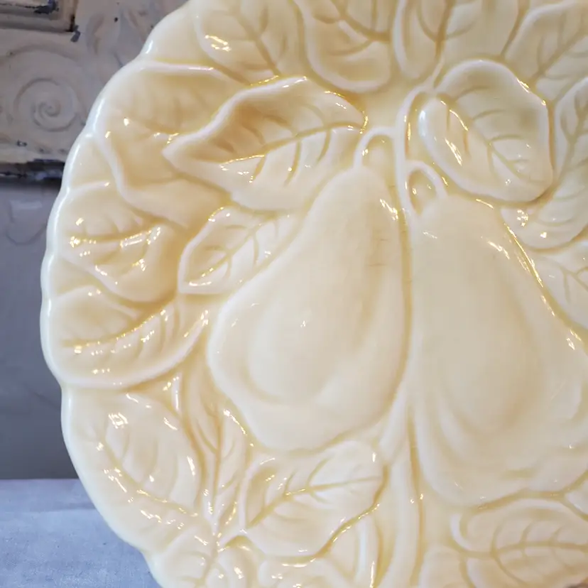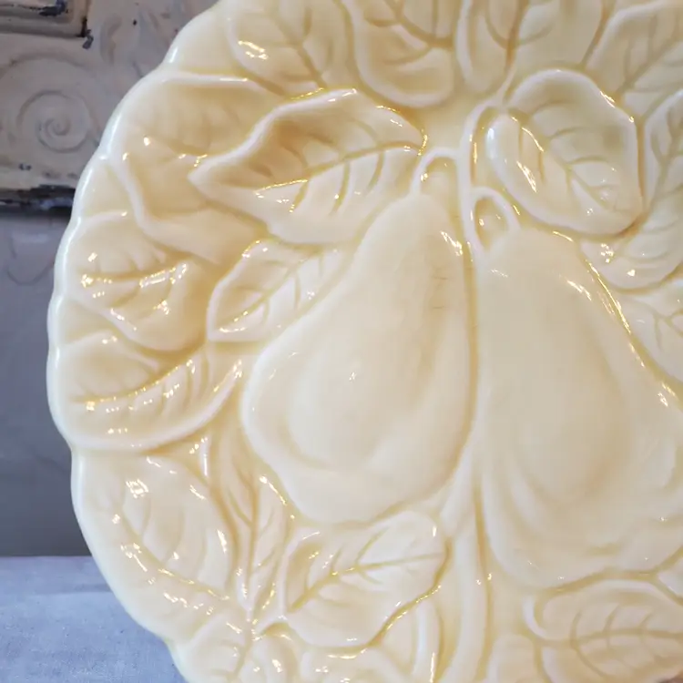 Set of 2 yellow plates embossed with pears suitable for food use, but I selected them with wall decor in mind. Subtle and lovely. No chips. 7 3/4" diameter.
