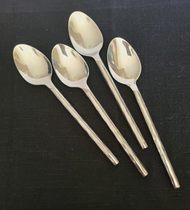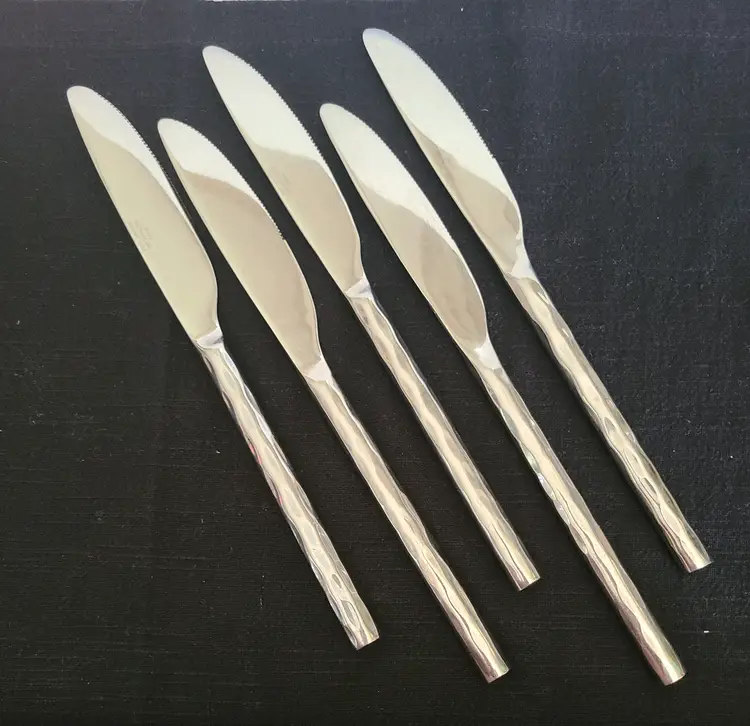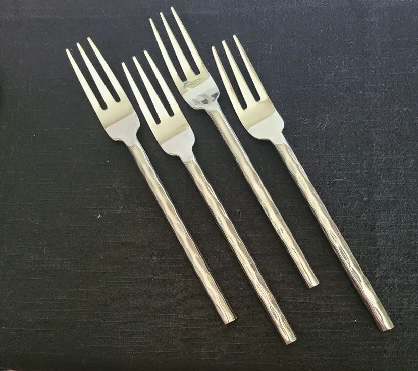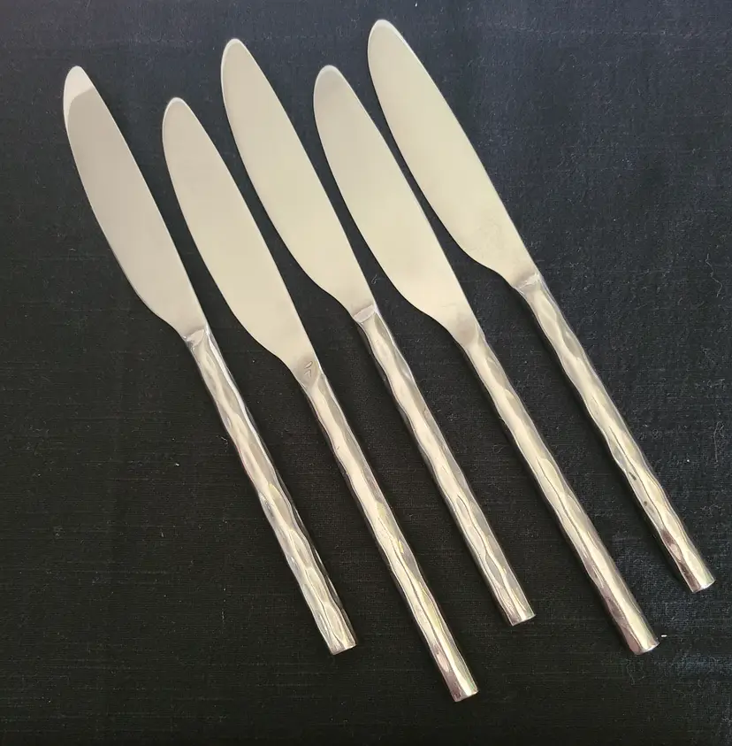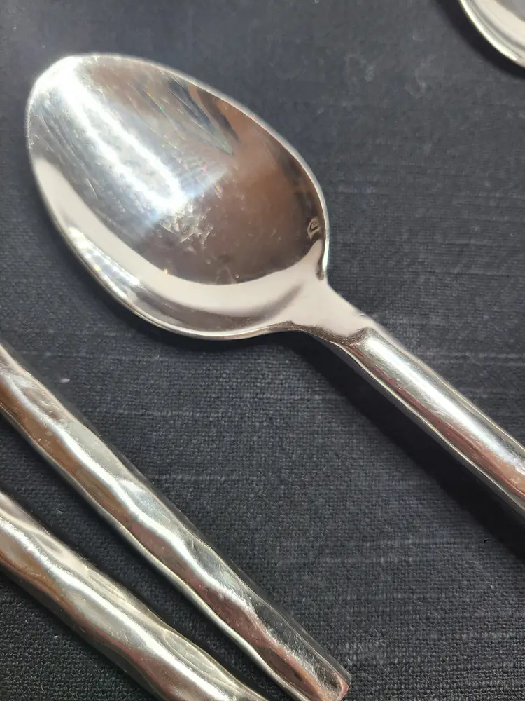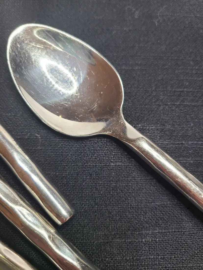 This is a discontinued pattern from Pier 1. These pieces are made of stainless steel with a wavy or hammered appearance handle pattern and glossy finish. Includes forks, teaspoons, tablespoons, and knives for 4. Set also includes 3 additional tablespoons and 1 extra knife. These are fairly heavy and sturdy utensils. These utensils do show typical surface scratches from regular use. Please check photos of individuals to best see overall condition. They do not appear to be warped or damaged.