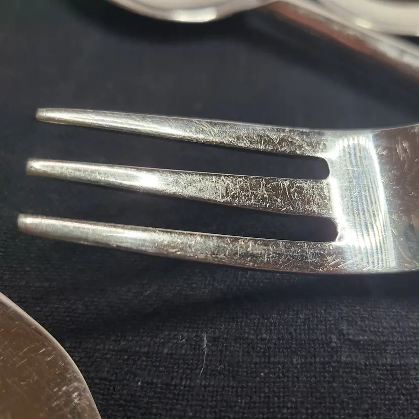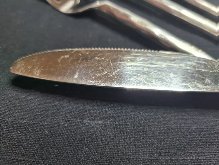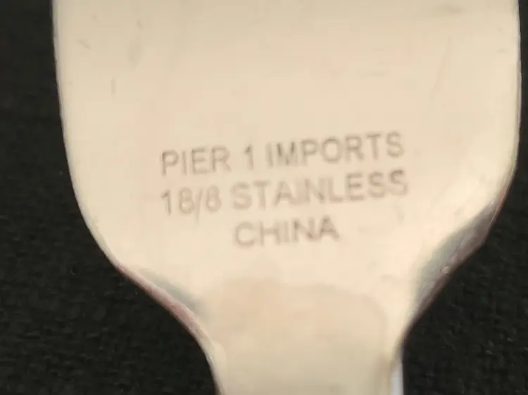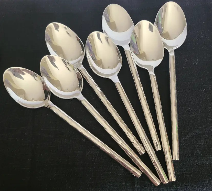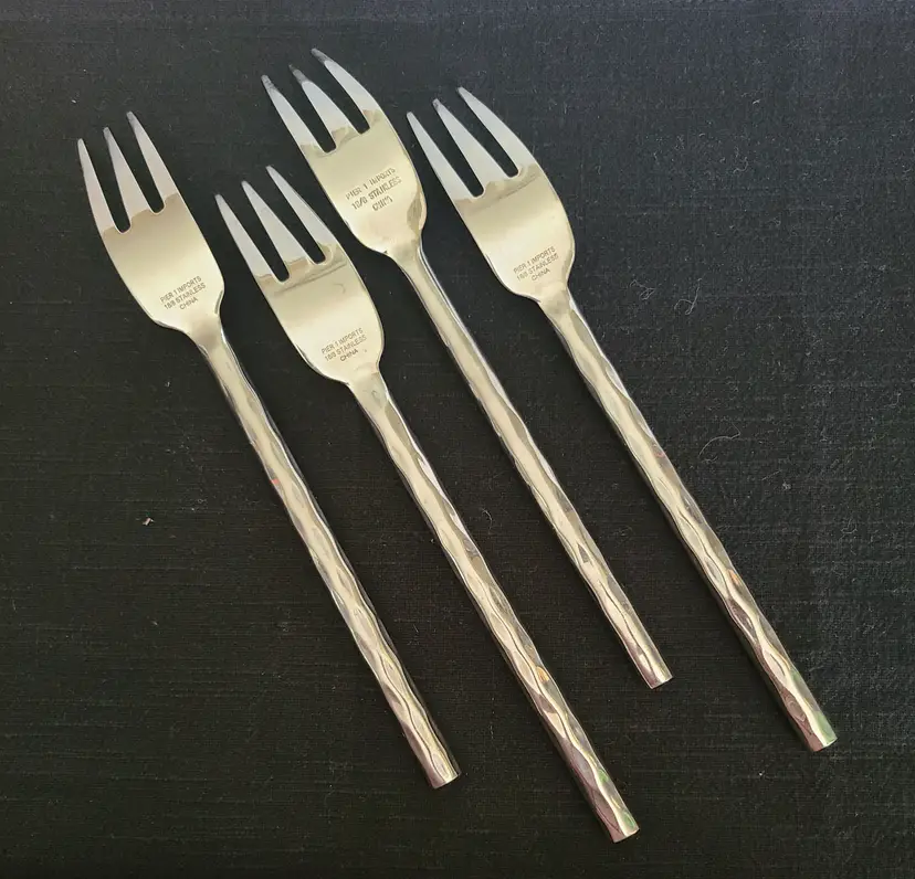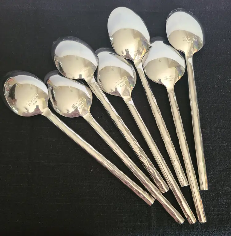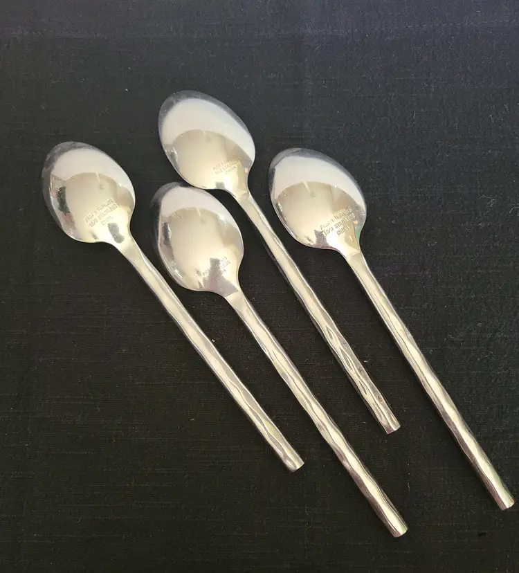 This is a discontinued pattern from Pier 1. These pieces are made of stainless steel with a wavy or hammered appearance handle pattern and glossy finish. Includes forks, teaspoons, tablespoons, and knives for 4. Set also includes 3 additional tablespoons and 1 extra knife. These are fairly heavy and sturdy utensils. These utensils do show typical surface scratches from regular use. Please check photos of individuals to best see overall condition. They do not appear to be warped or damaged.